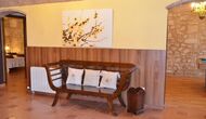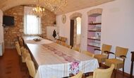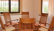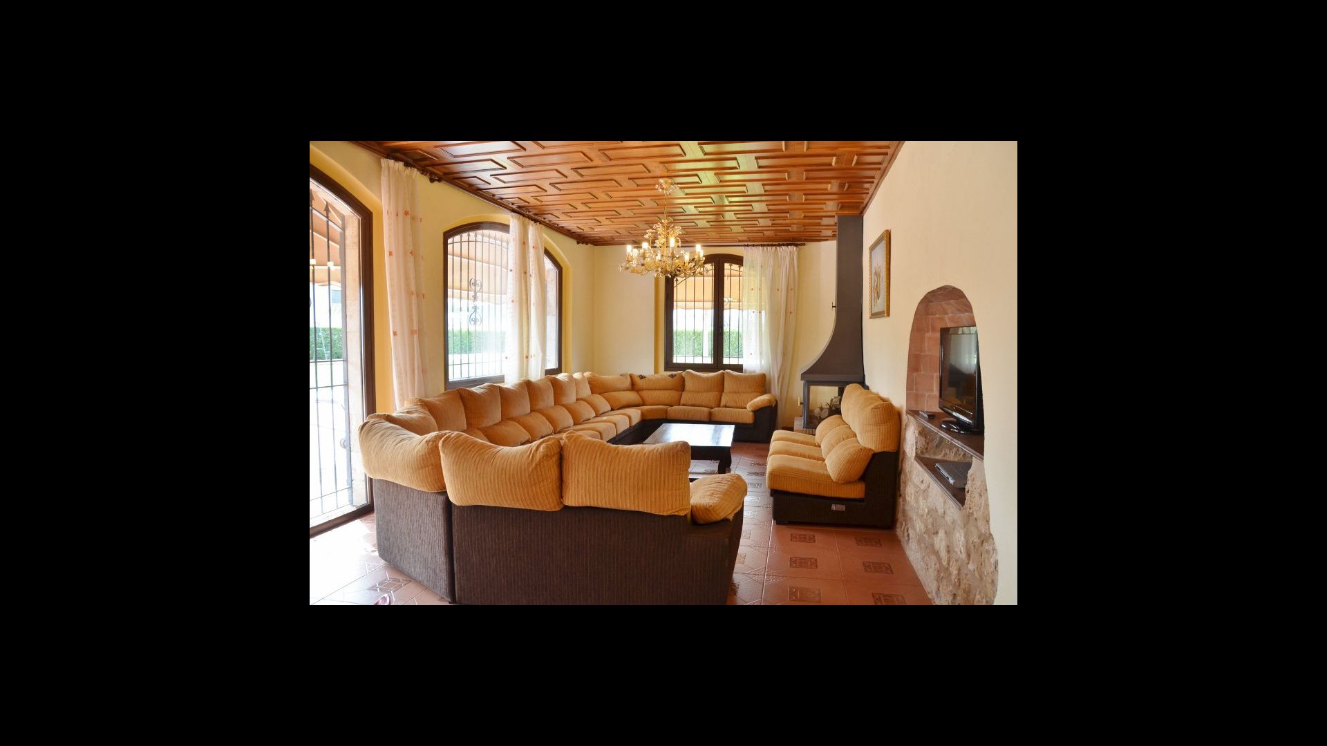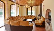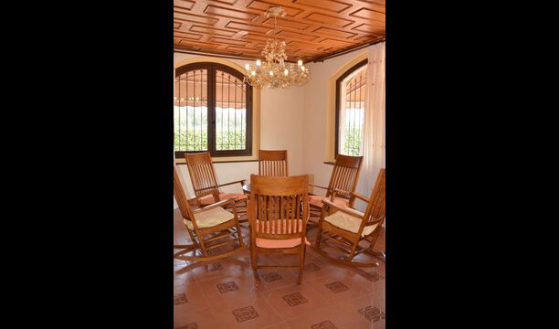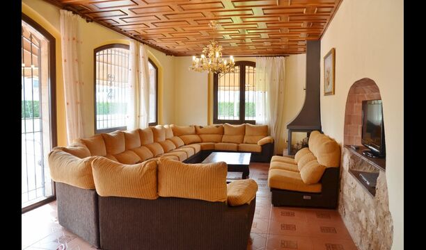 Inde i huset er køkkenet direkte forbundet med den meget store spisestue med et langt spisebord, således at man også kan spise indendørs, hvis det foretrækkes. Til venstre ligger et rummeligt opholdsrum, hvor man kan vælge at slappe af, enten i ”bedstemor” området med 8 gyngestole eller i sofa-området med den største sofa vi nogensinde har set. Der er TV og tillige en pejs, hvis I ankommer i vinterperioden.