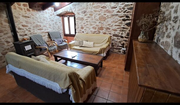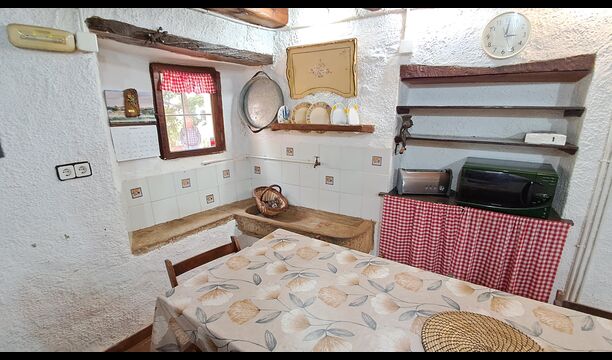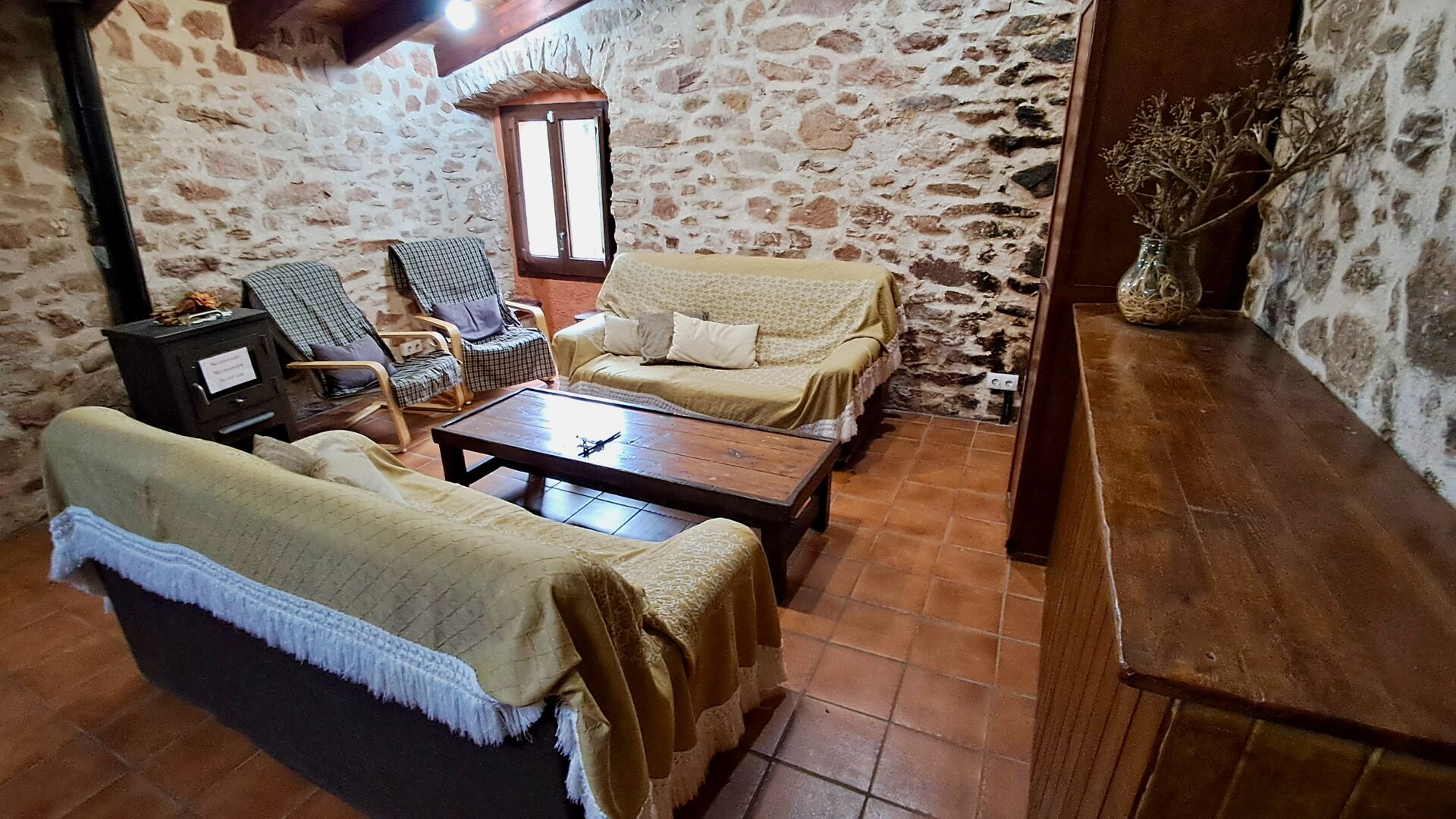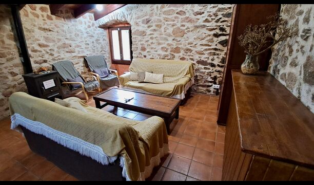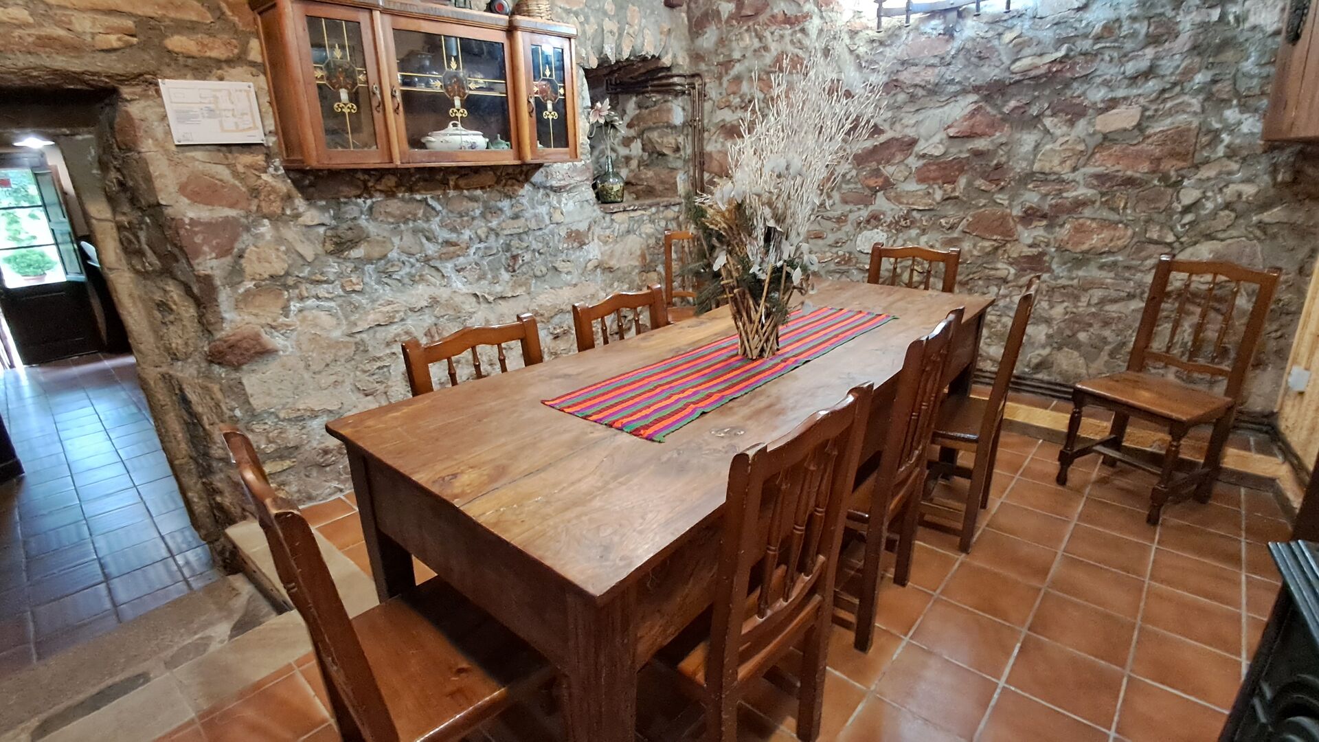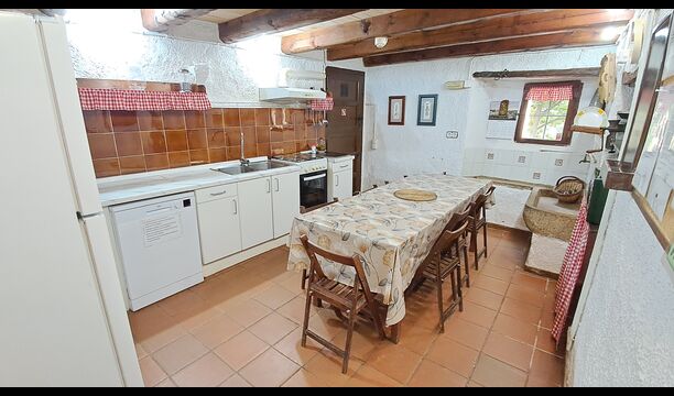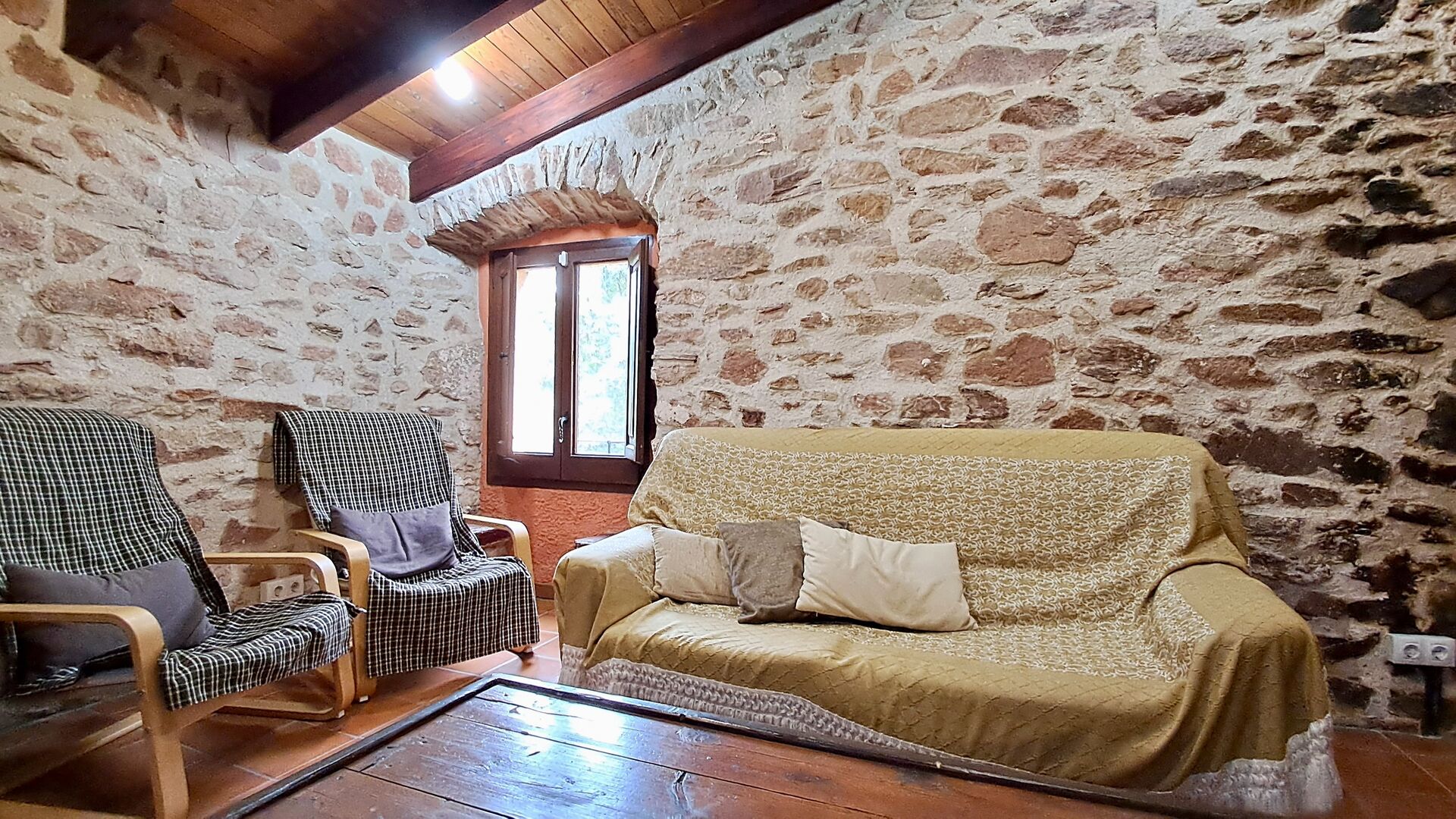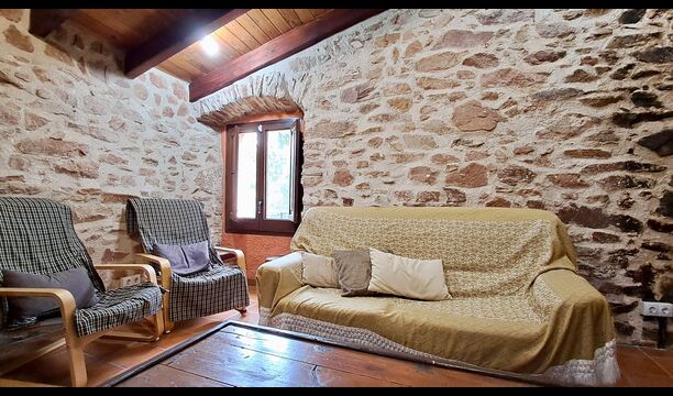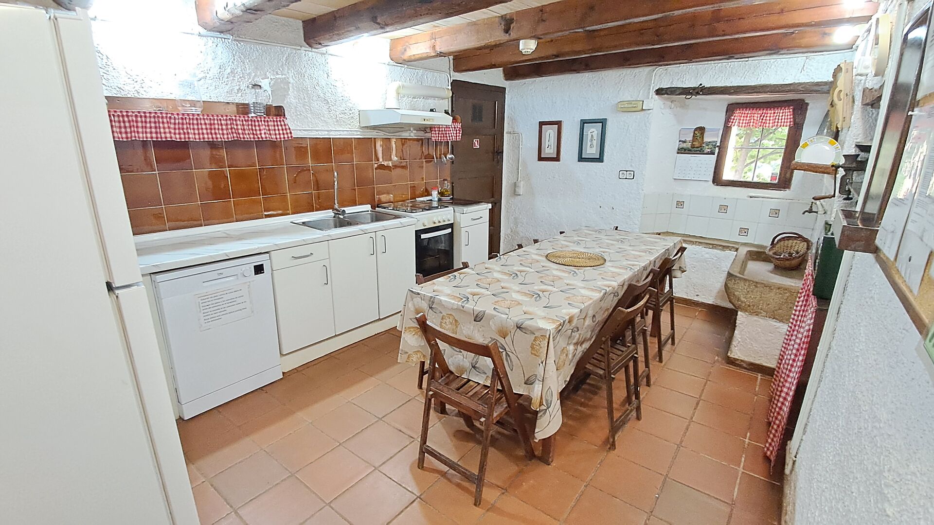 Nå man kommer ind i huset bliver man slået af den friskhed, der er så typisk for catalanske kalkstenshuse, der er konstrueret med henblik på at holde solen ude og holde en behagelig indendørs temperatur. Huset er bygget i flere plan, hvilket gør det yderligere charmerende. Nederst er der et opholdsområde med sofaer, TV og en pejs. Et par trin op fører til spiseområdet med spisebord og et fuldt udstyret køkken med opvaskemaskine, komfur, mikrobølgeovn, køleskab, fryser etc. Der er tillige en vaskemaskine. På dette niveau er der tillige et lille bibliotek og et badeværelse med bruser.