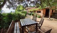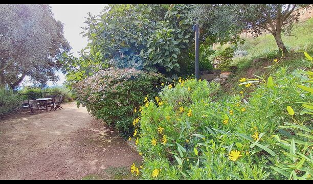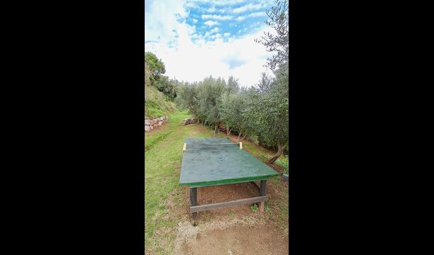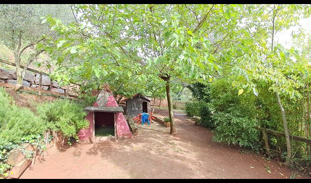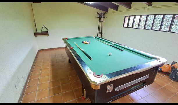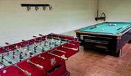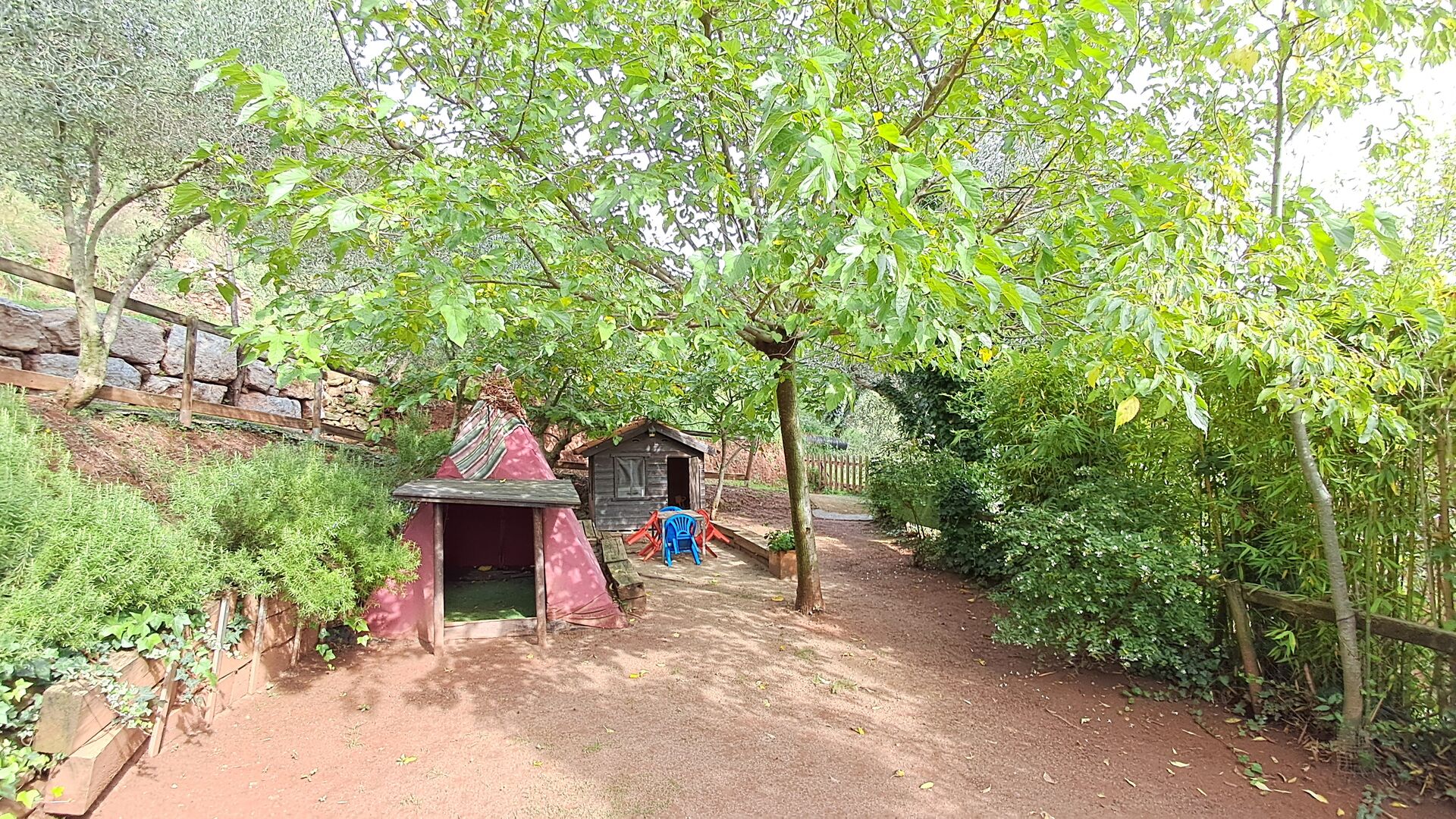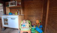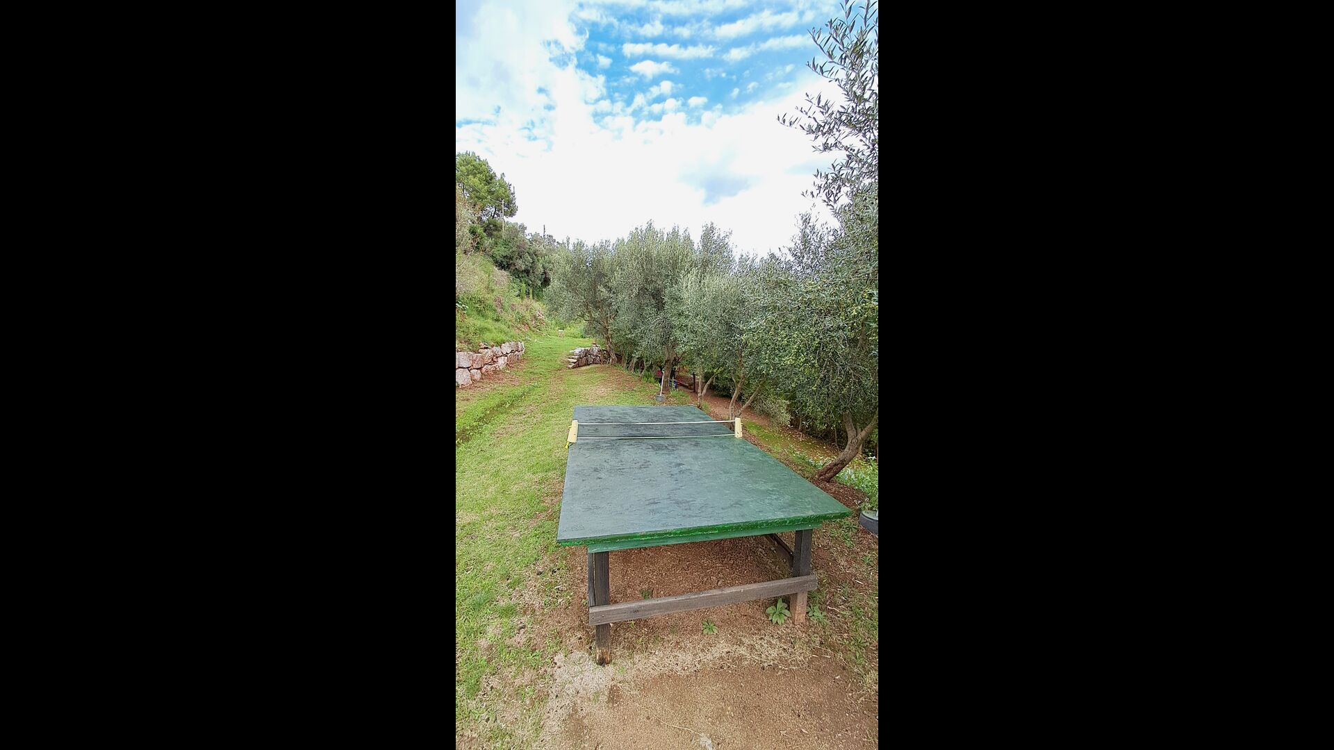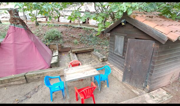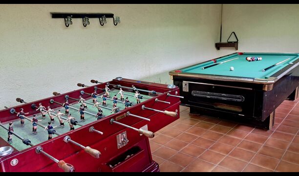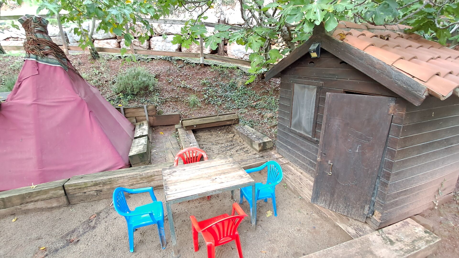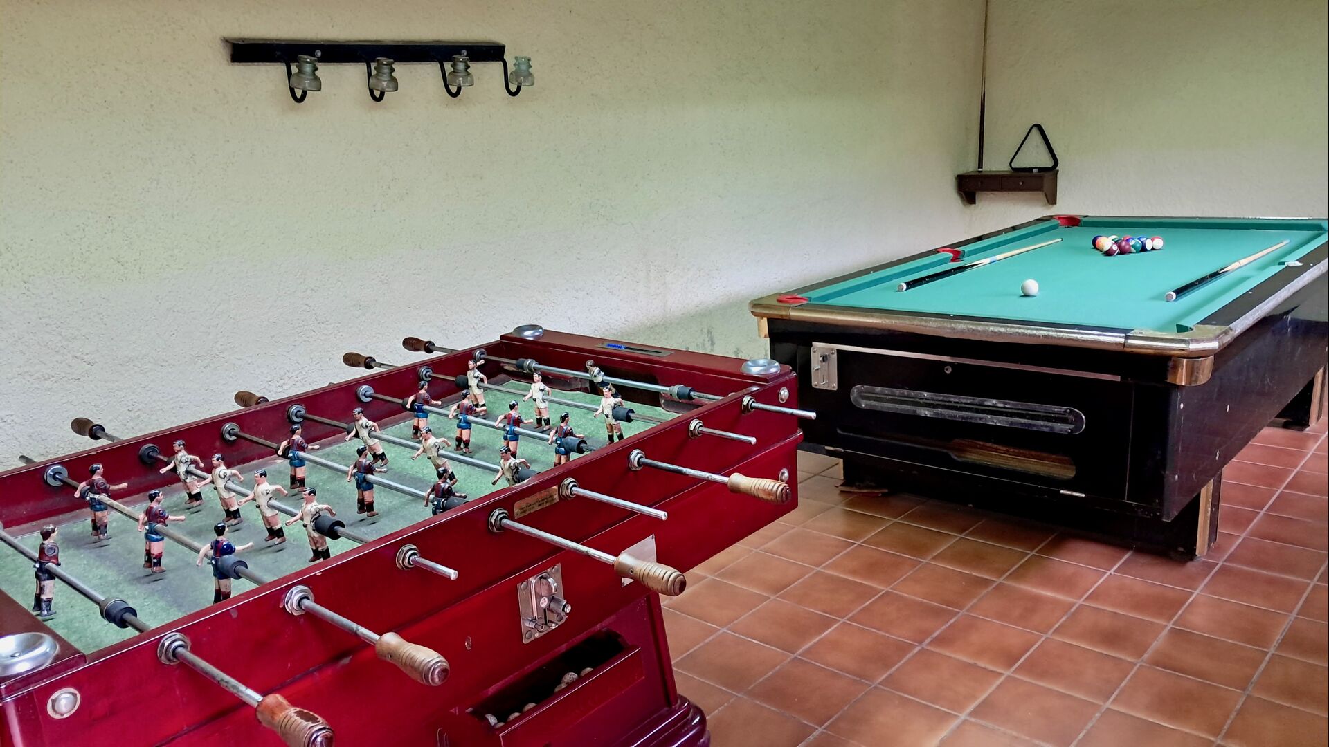 Huset ligger parallelt med bakkeskråningen. På venstre side er der et overdækket barbecueområde og mange smukke pletter med borde og stole, så man kan spise udendørs, hvis man har lyst til det. På dette niveau er der også et hyggeligt område for små børn med legeplads, legehus og en masse legetøj. Til de større børn (og barnlige sjæle) er der et aktivitetslokale med billard og bordfodbold. Der er også petanque kugler til udendørs brug.