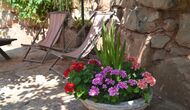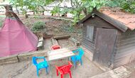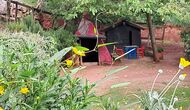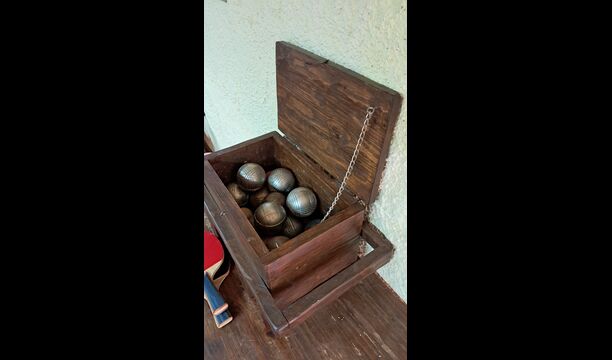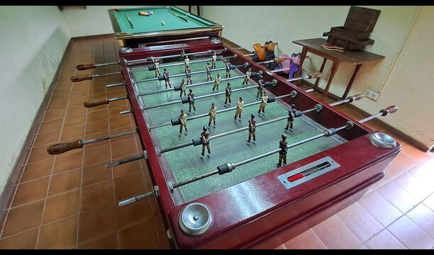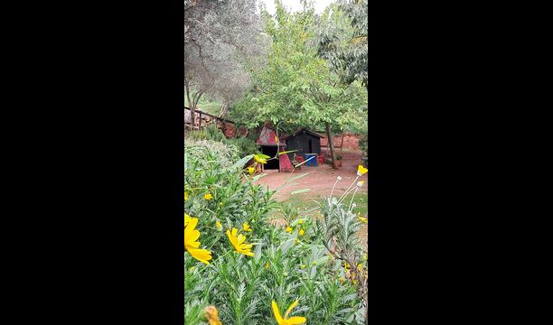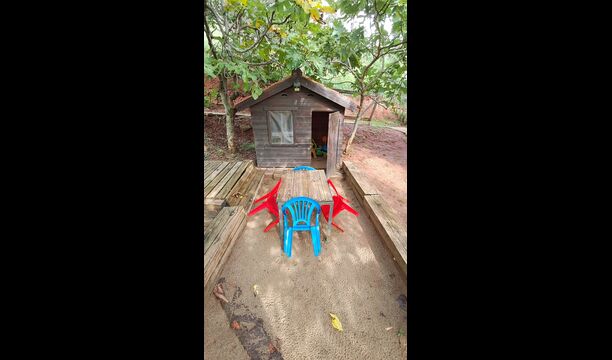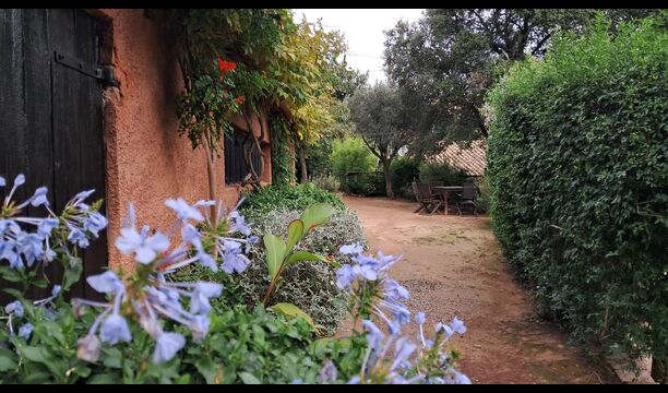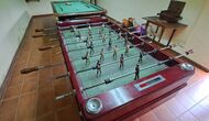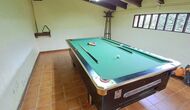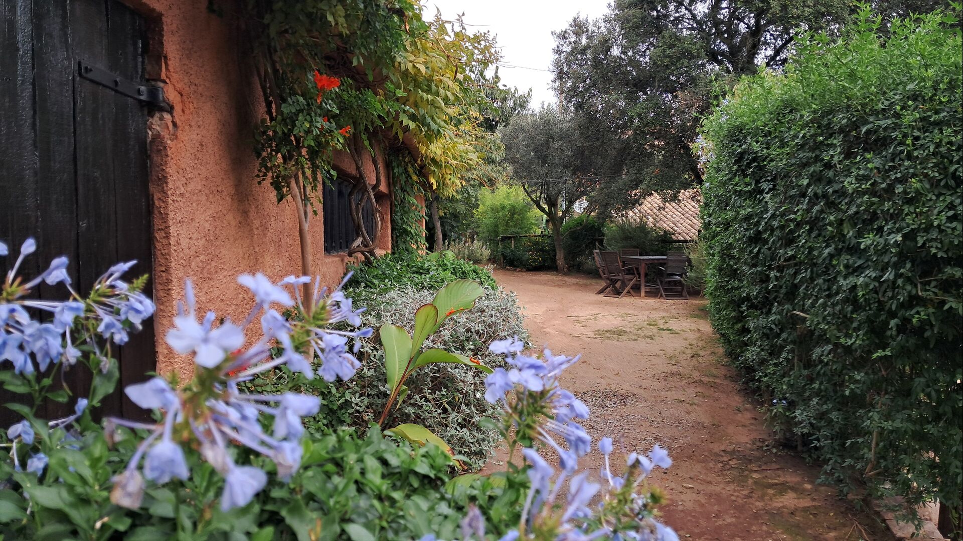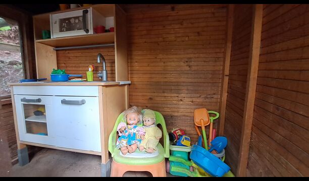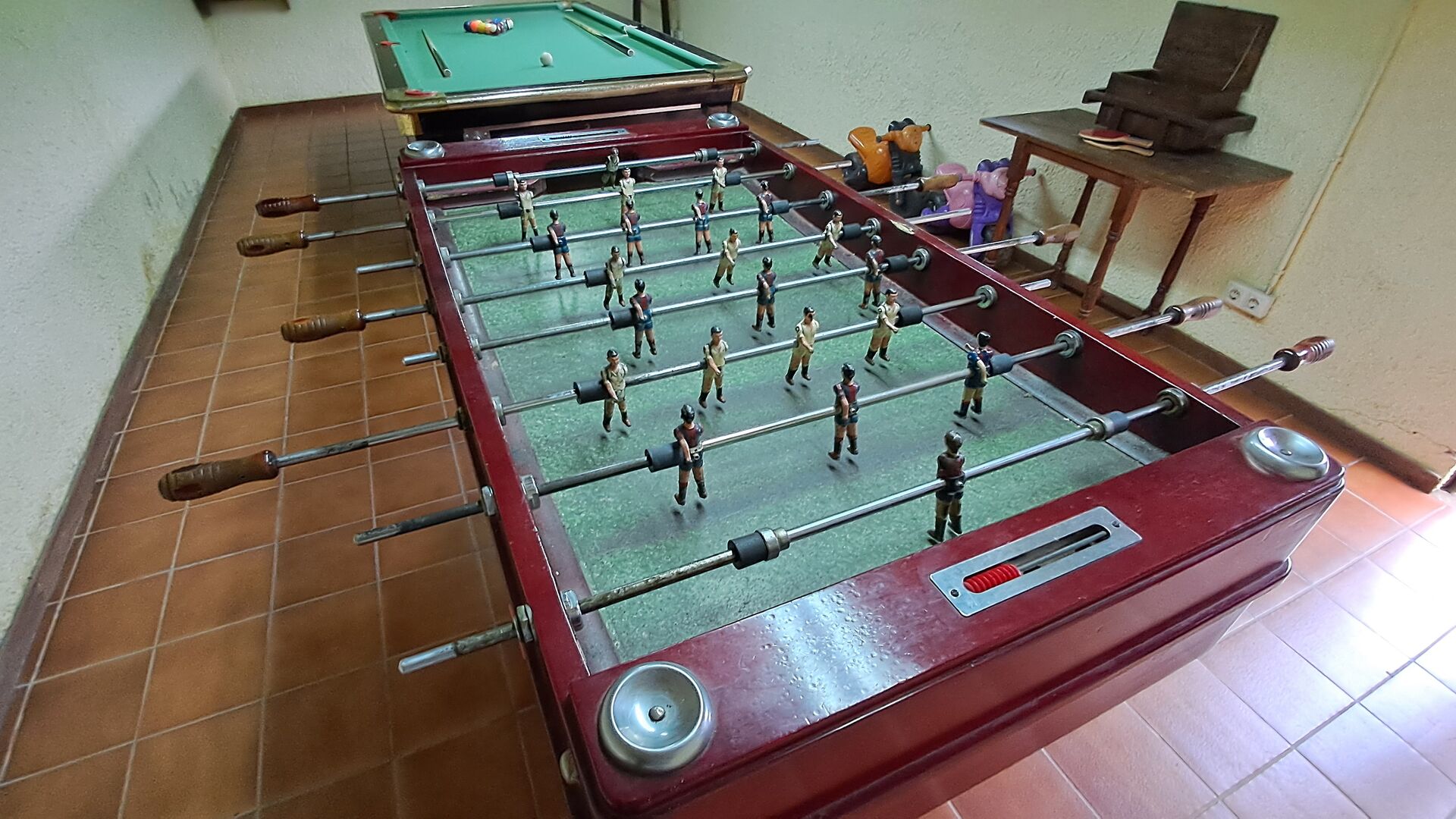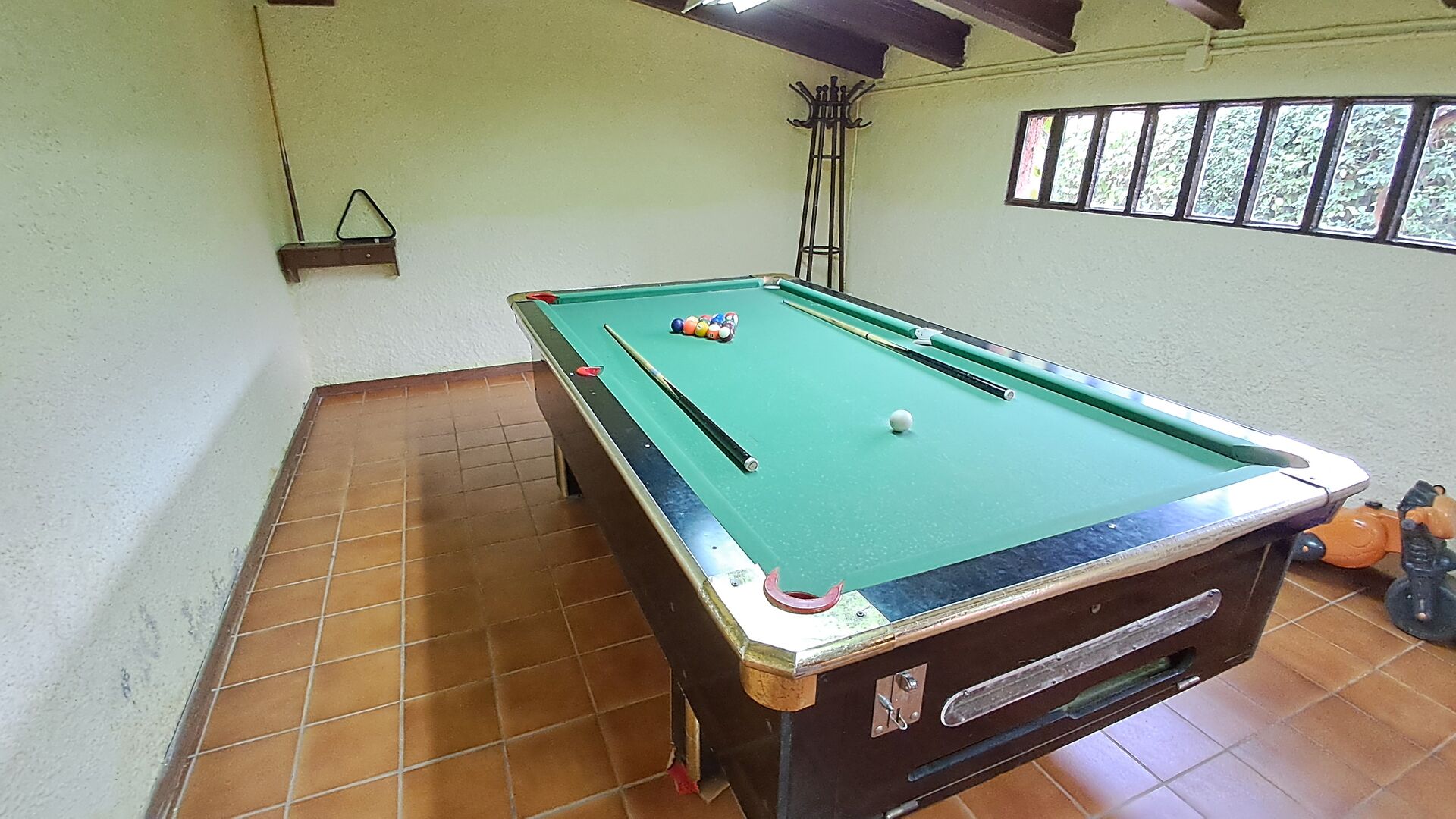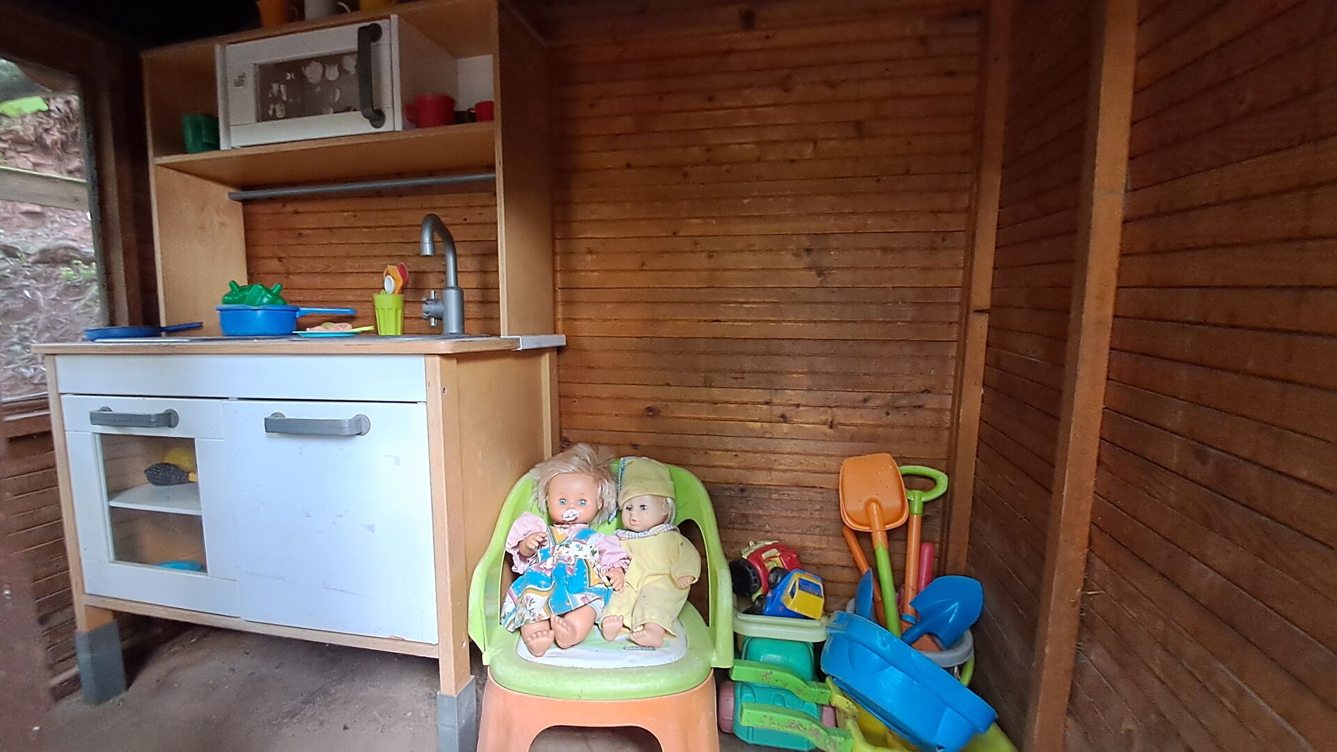 Huset ligger parallelt med bakkeskråningen. På venstre side er der et overdækket barbecueområde og mange smukke pletter med borde og stole, så man kan spise udendørs, hvis man har lyst til det. På dette niveau er der også et hyggeligt område for små børn med legeplads, legehus og en masse legetøj. Til de større børn (og barnlige sjæle) er der et aktivitetslokale med billard og bordfodbold. Der er også petanque kugler til udendørs brug.