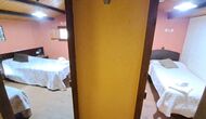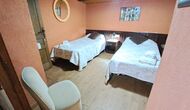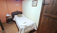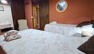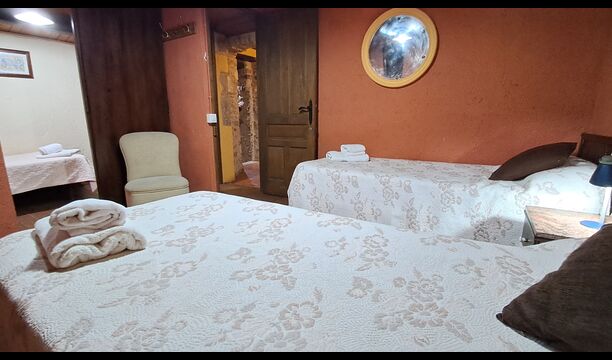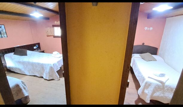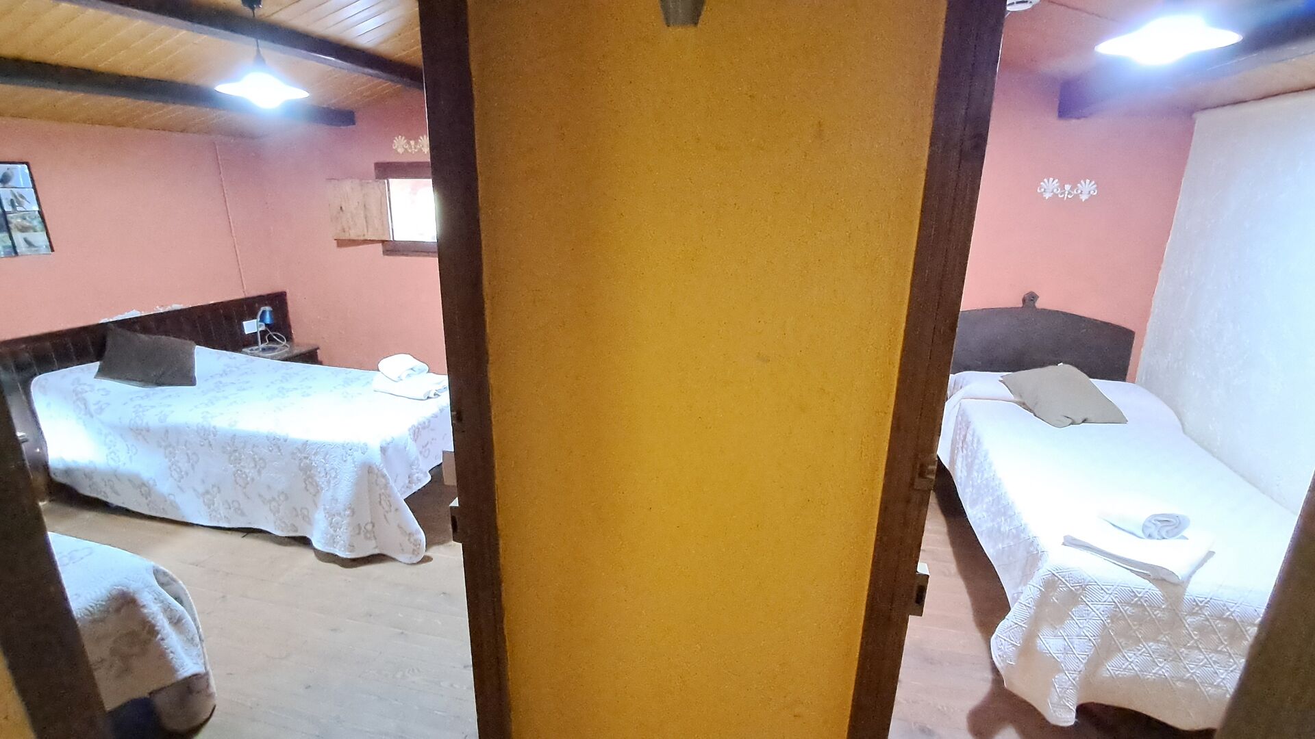 På 1.sal ligger soveværelserne. Først er der et opholdsområde med sofaer, TV og DVD, hvorfra man kommer til de fire soveværelser. Der er 1 dobbeltværelse med dobbeltseng, 1 tresengsværelse (kan arrangeres enten med 3 enkeltsenge eller 1 dobbeltseng og 1 enkeltseng) samt 1 dobbeltværelse og 1 enkeltværelse. Disse to værelser kan forbindes med en skydedør.