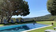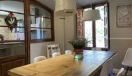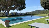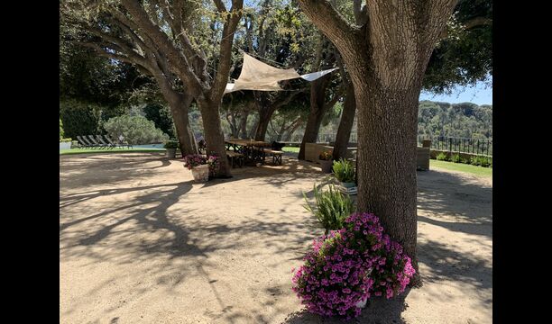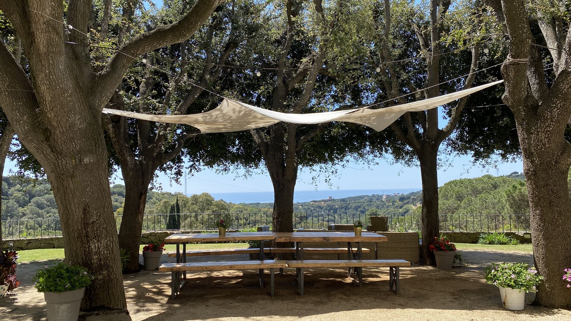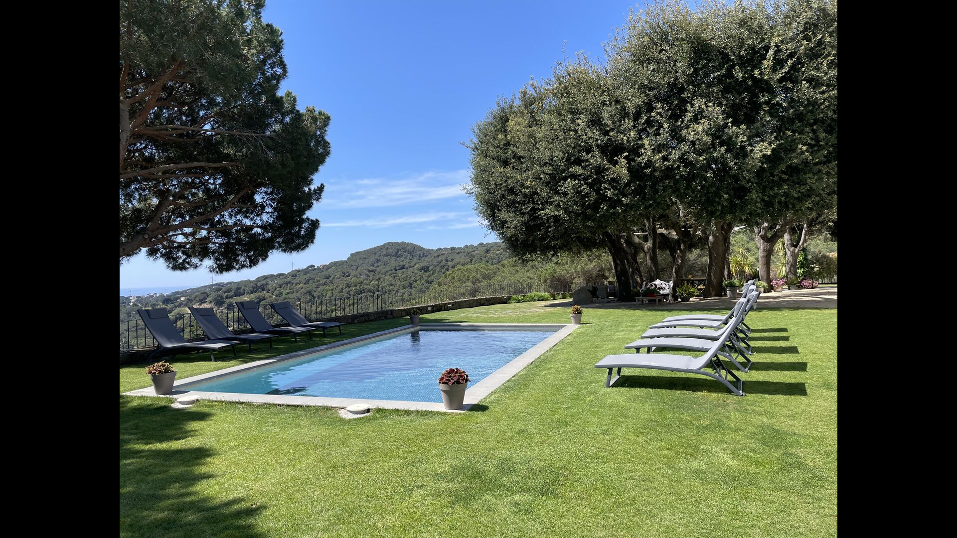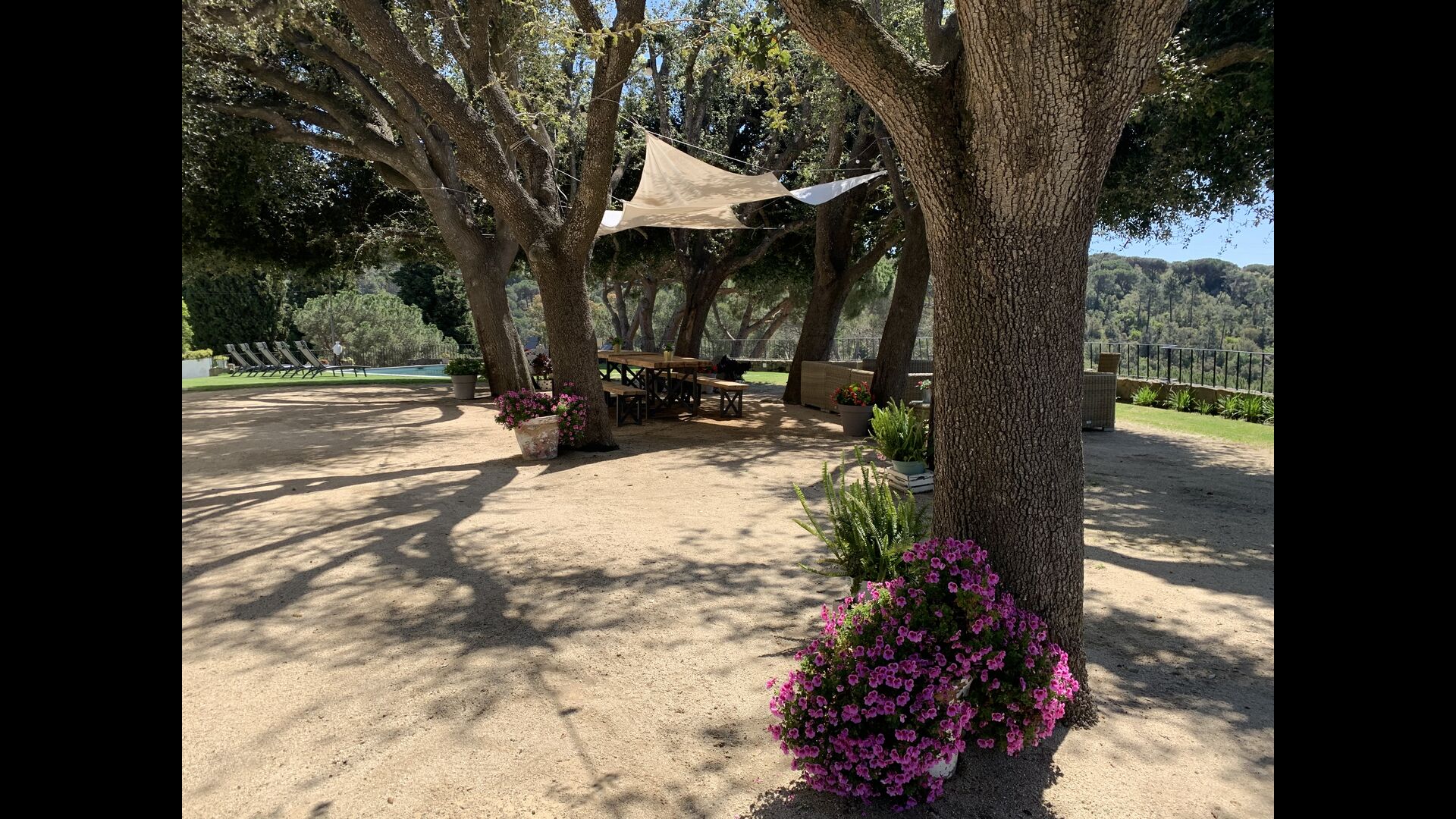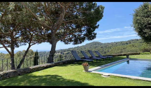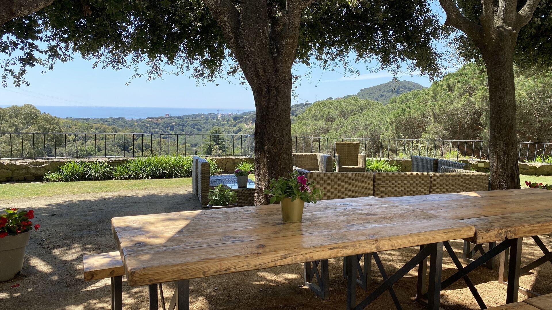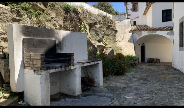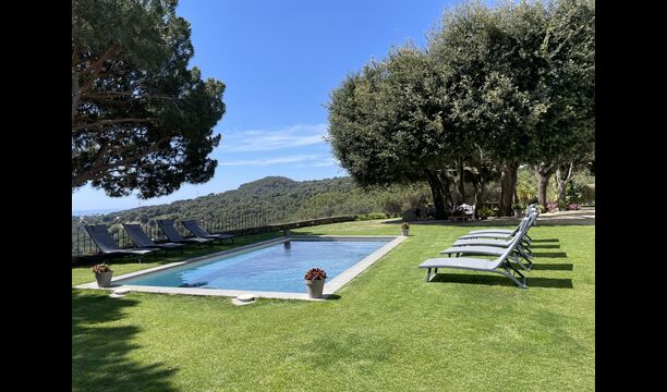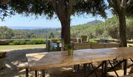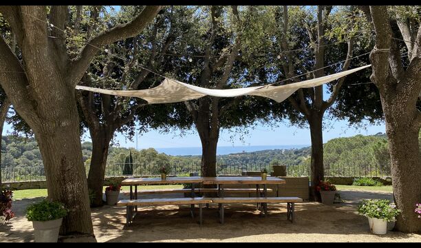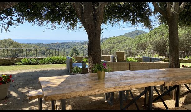 Ved poolområdet finder man et skyggefuldt område med stort spisebord, hvorfra man også har en fantastisk kig til Middelhavet i mellem bjergene. Det perfekte sted at nyde udendørs måltider eller en drink med hele feriegruppen i det varme catalanske vejr.