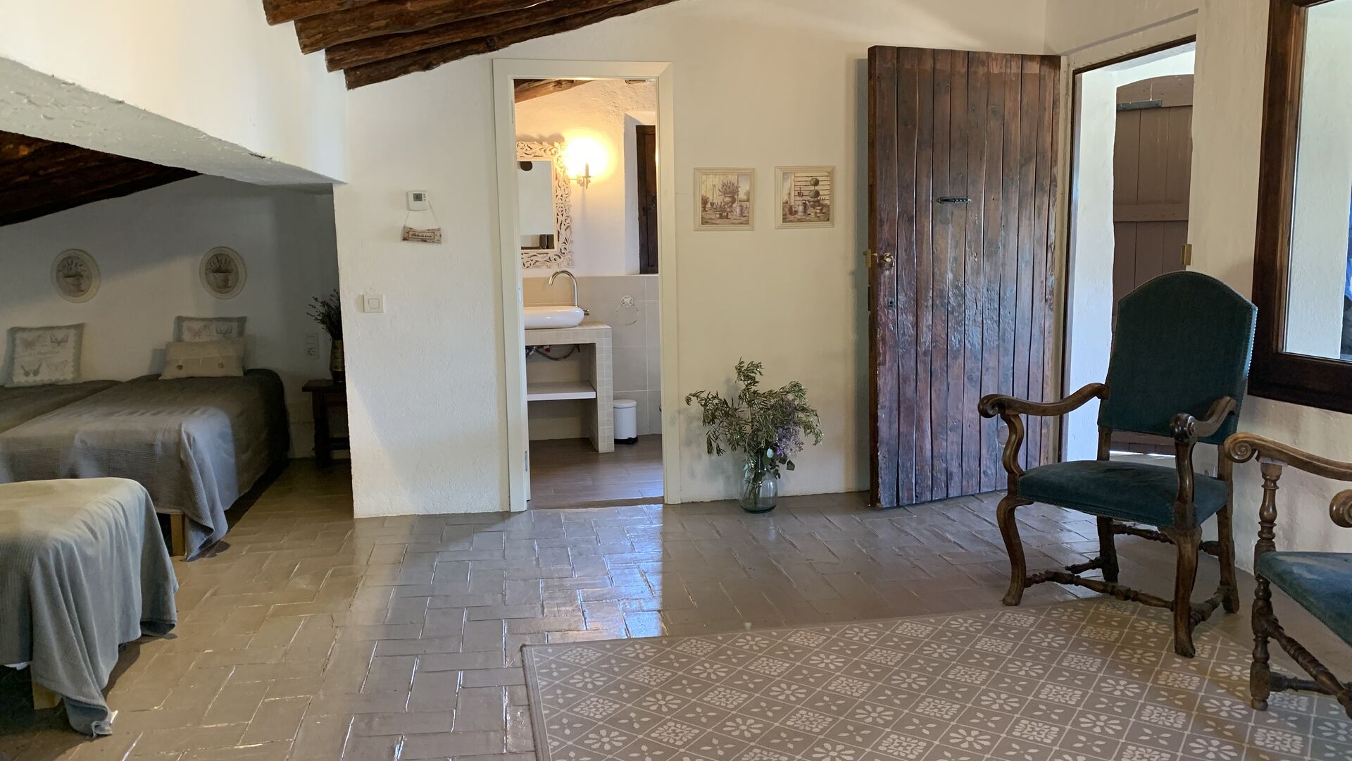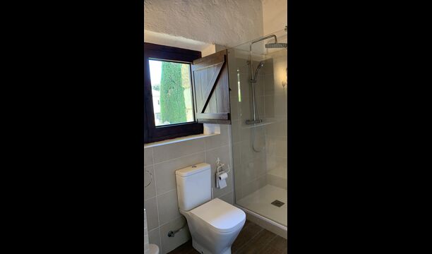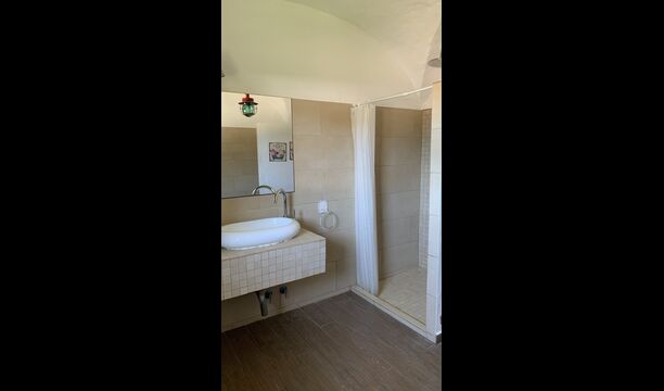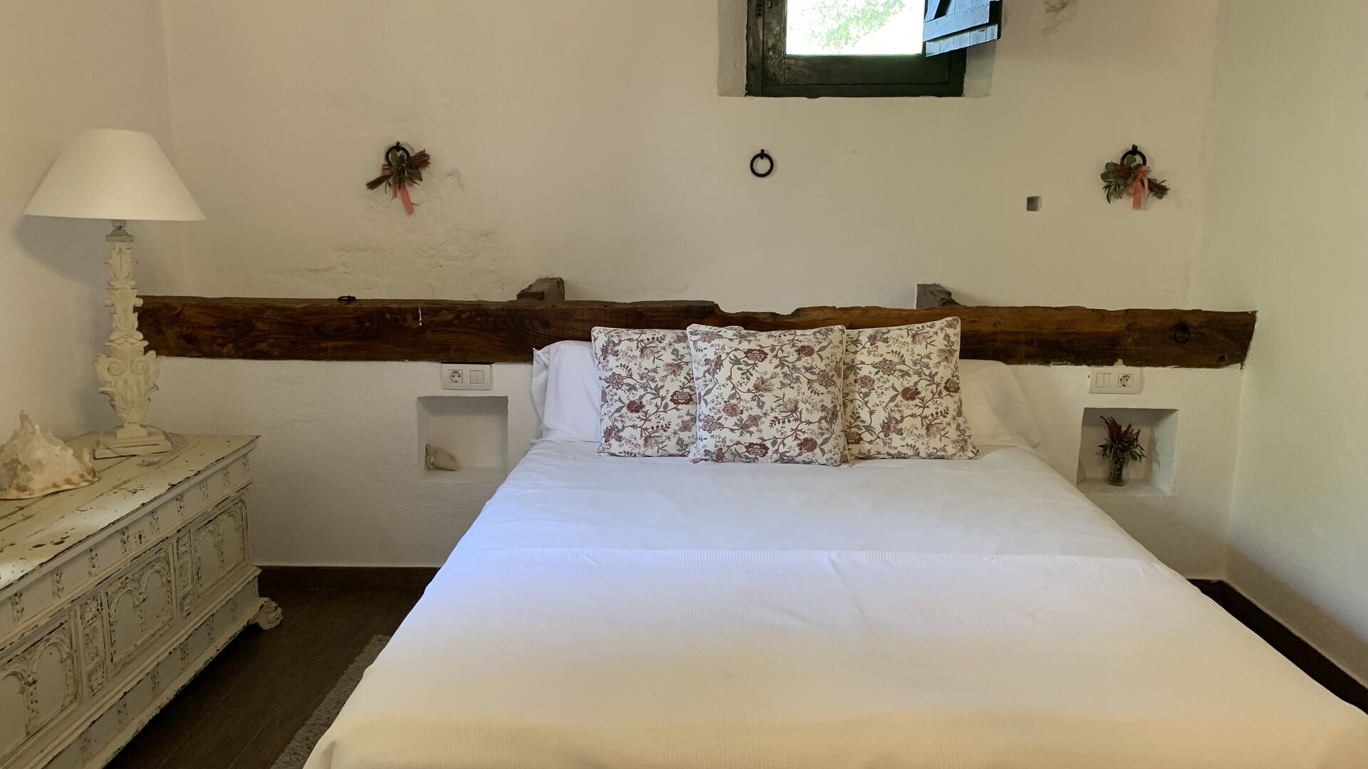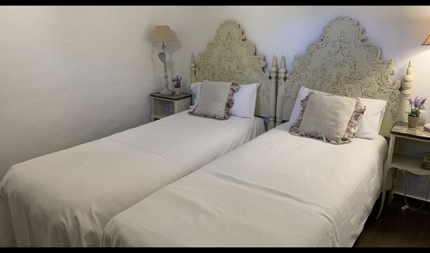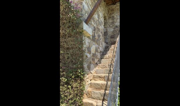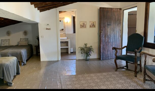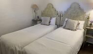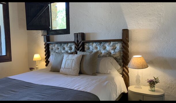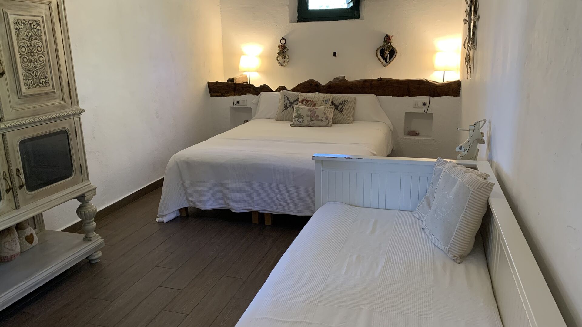 Ved siden af BBQ området ligger indgangen til husets stue etage. Stueetagen er nydeligt istandsat, men selvfølgelig med respekt for husets originale arkitektur og mange fine detaljer, så som de smukke buer og træbjælker i loftet, er bevaret. Her finder du fire store og flotte soveværelser. To af værelserne er tripple værelser med en dobbelt seng og en single seng, og de to andre værelser er doble værelser - det ene med to single senge, og det andet med en dobbelt seng. Soveværelserne deler et stort badeværelse i stue etagen.