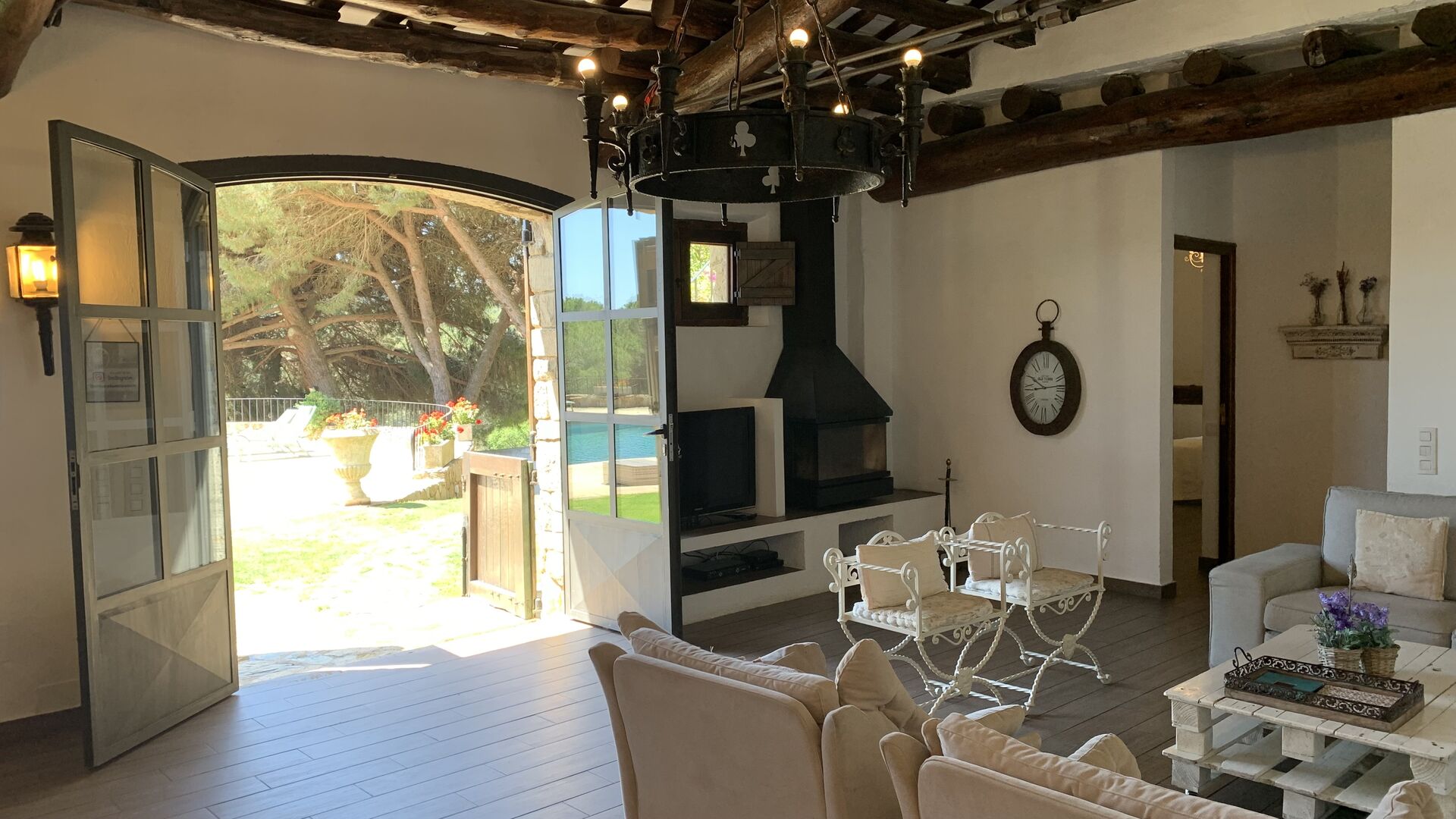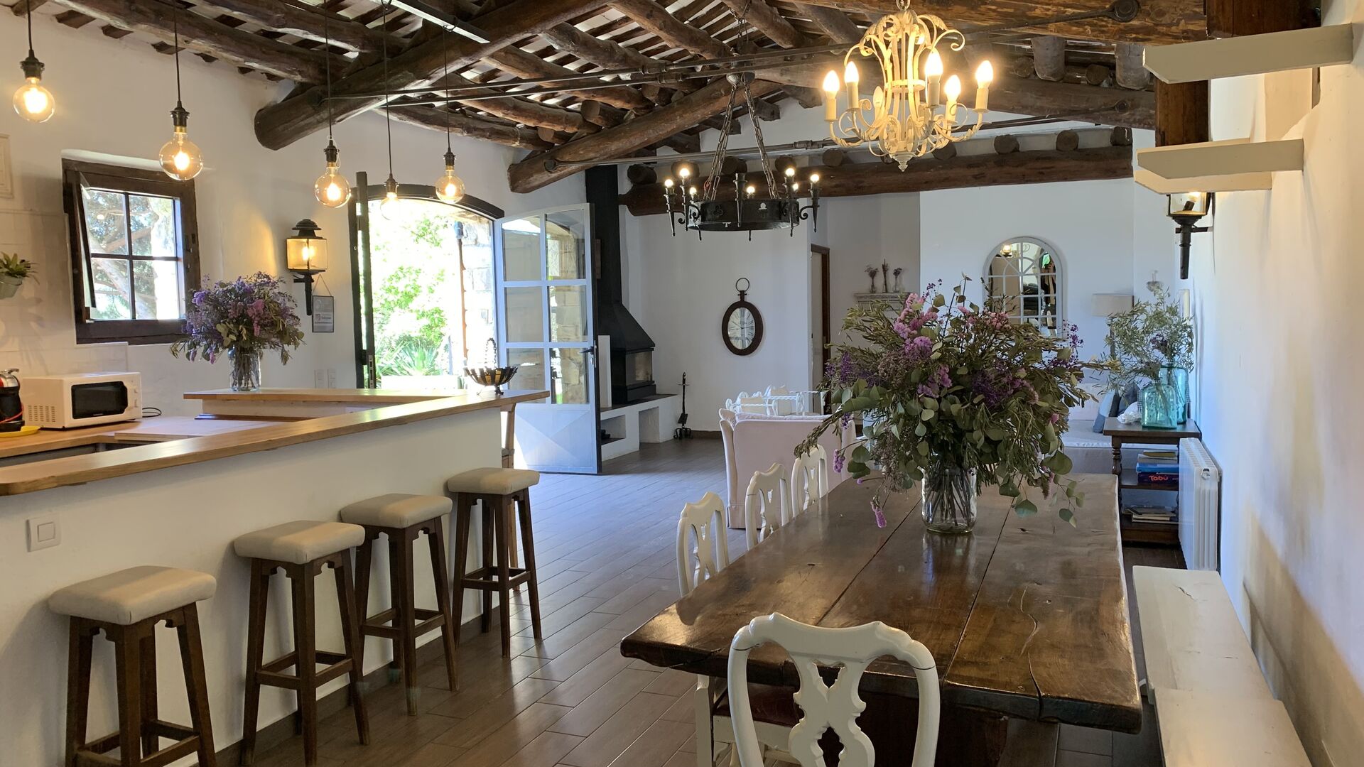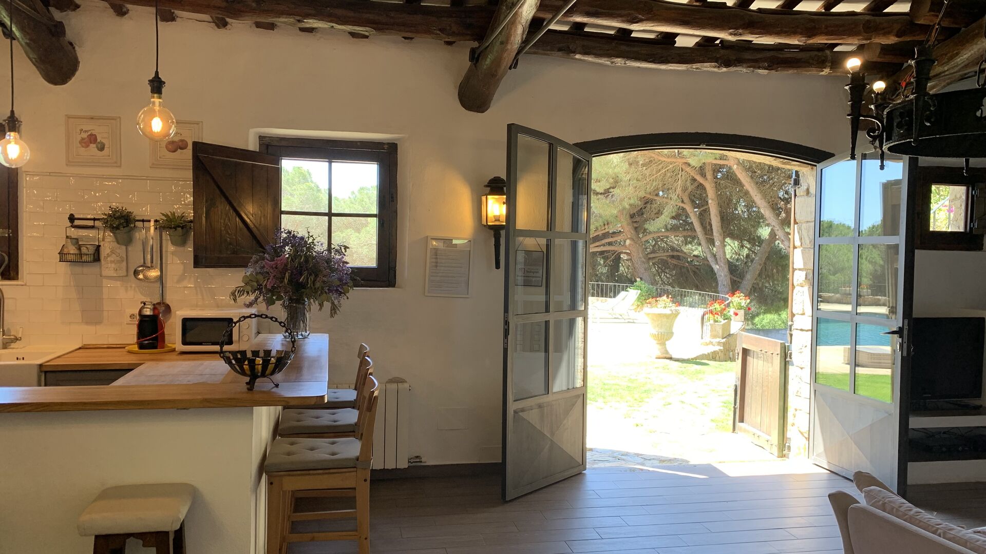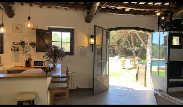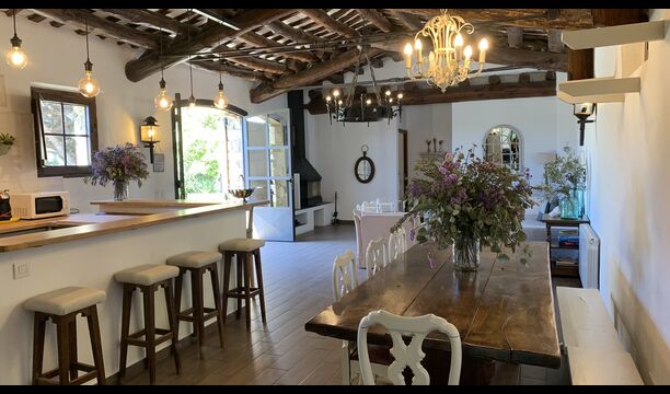 I stueetagen ligger det store åbne køkken alrum. Køkkenet er nyrenoveret og fuldt udstyret med alt hvad du skulle få brug for. Der er også et stort langbord med plads til hele gruppen, og en hyggelig stue med komfortable sofaer. Det er et utroligt flot rum, med smukke træbjælker i loftet. I forlængelse af alrummet, er der store dobbeltdøre med vinduer i, som giver dig direkte udgang til poolområdet.