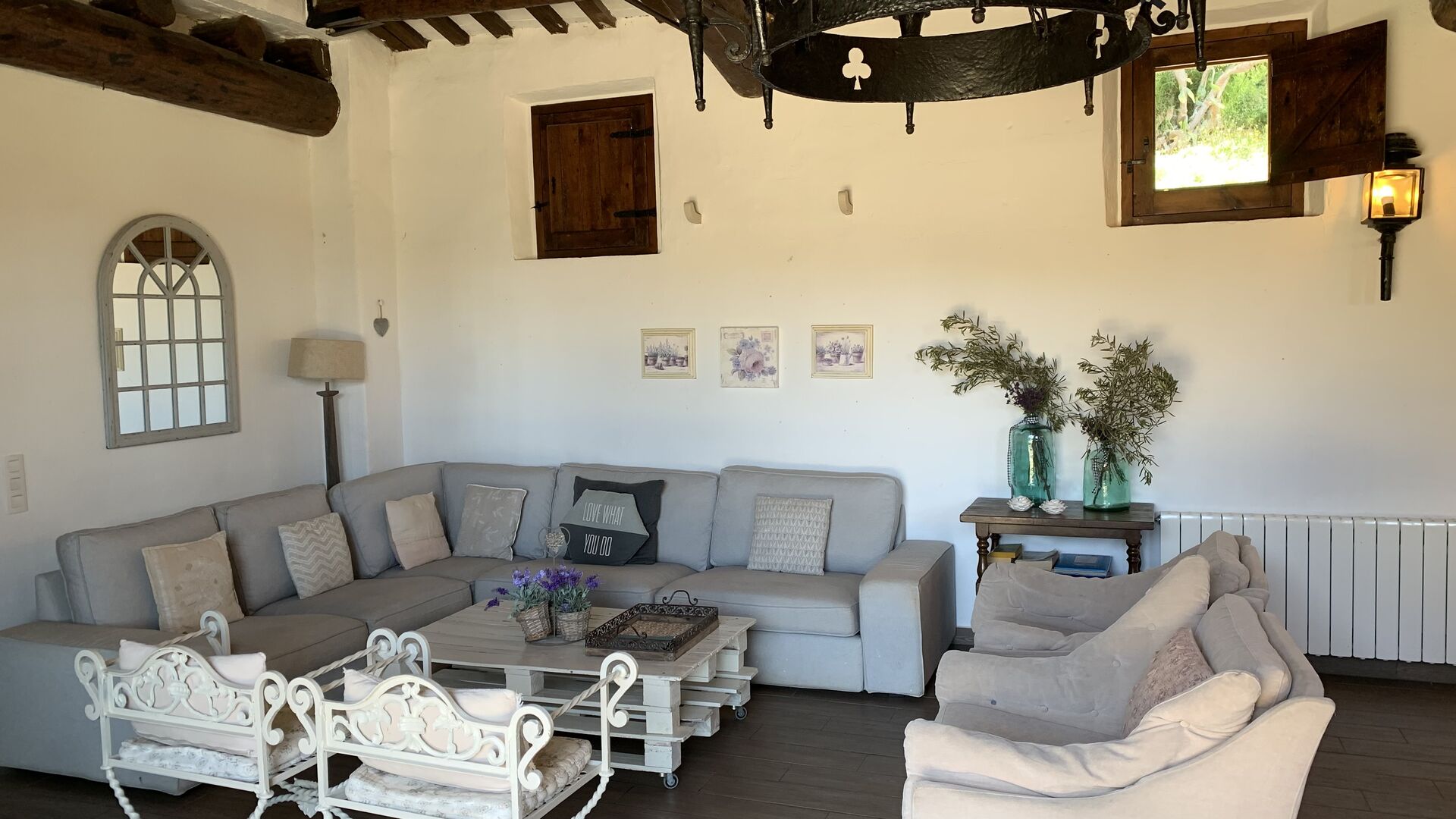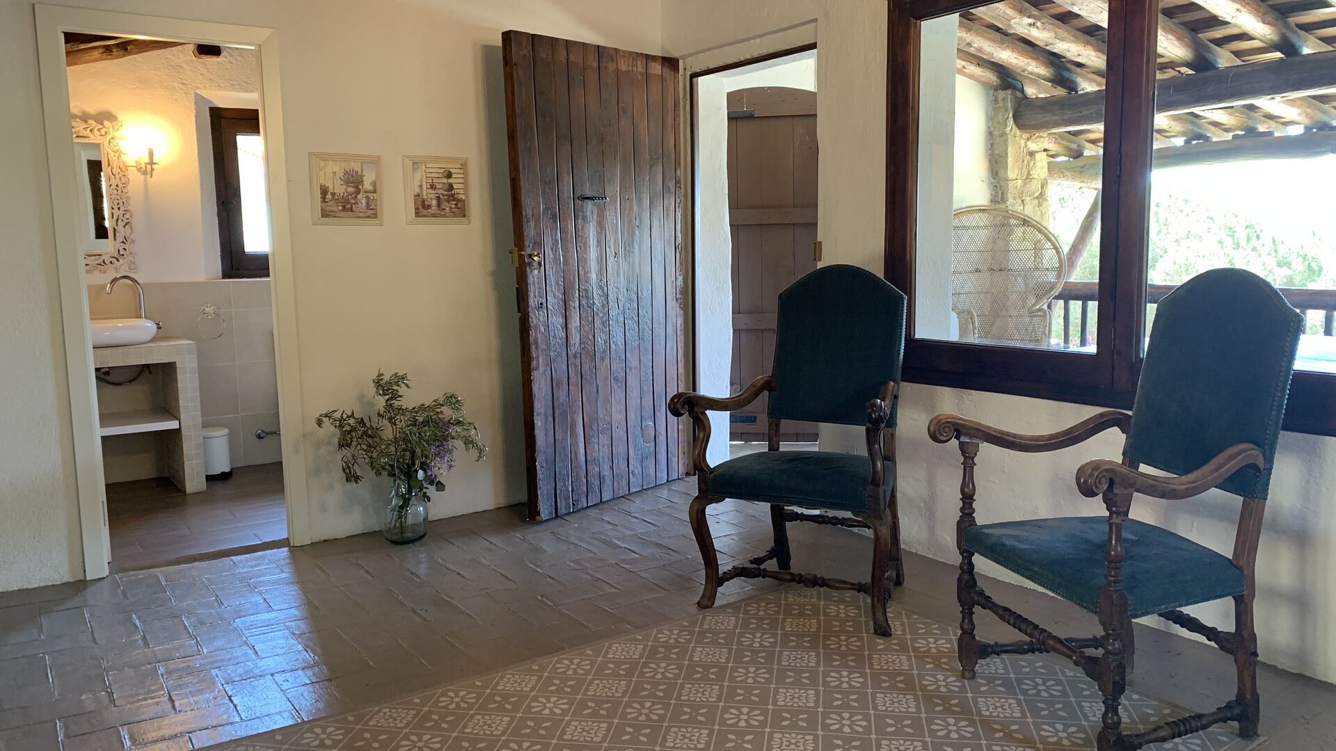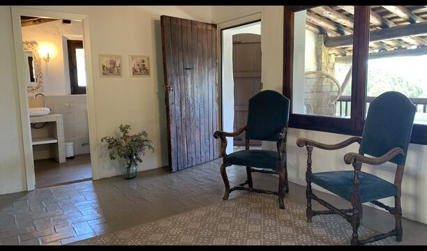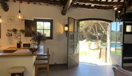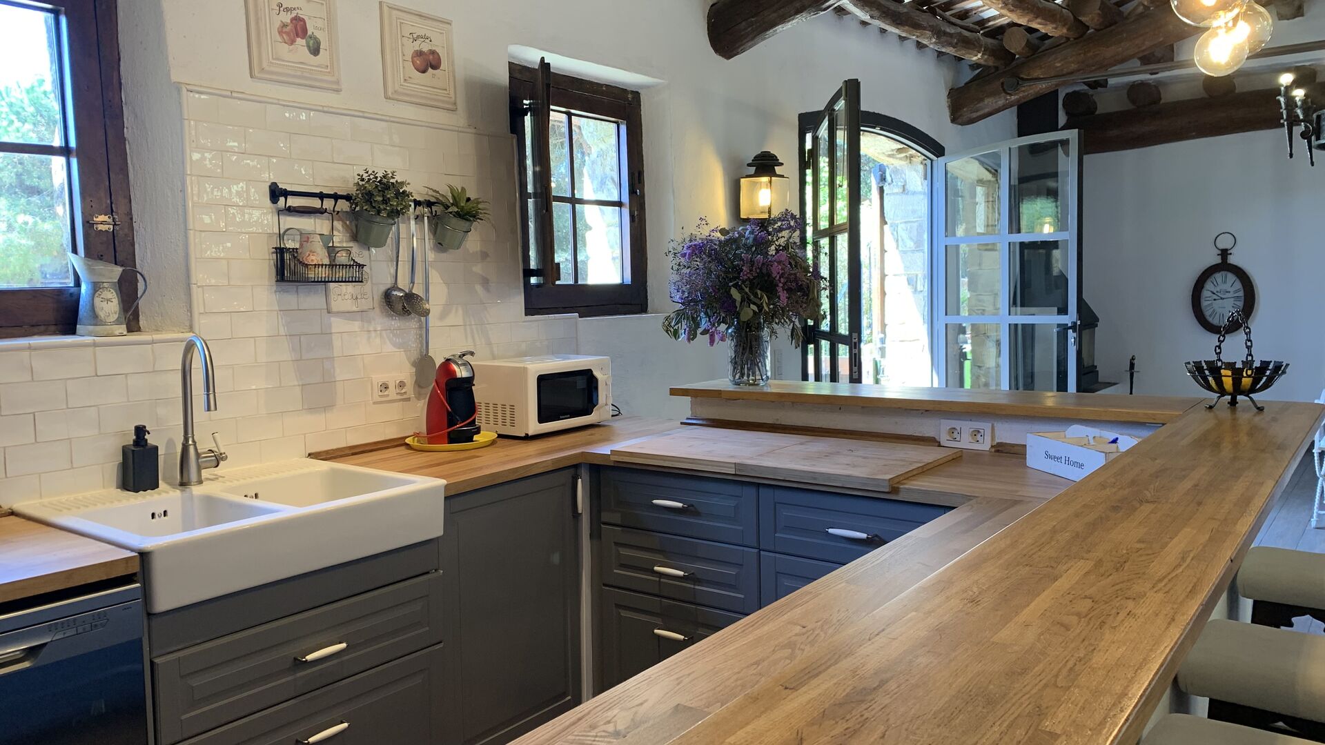 I stueetagen ligger det store åbne køkken alrum. Køkkenet er nyrenoveret og fuldt udstyret med alt hvad du skulle få brug for. Der er også et stort langbord med plads til hele gruppen, og en hyggelig stue med komfortable sofaer. Det er et utroligt flot rum, med smukke træbjælker i loftet. I forlængelse af alrummet, er der store dobbeltdøre med vinduer i, som giver dig direkte udgang til poolområdet.