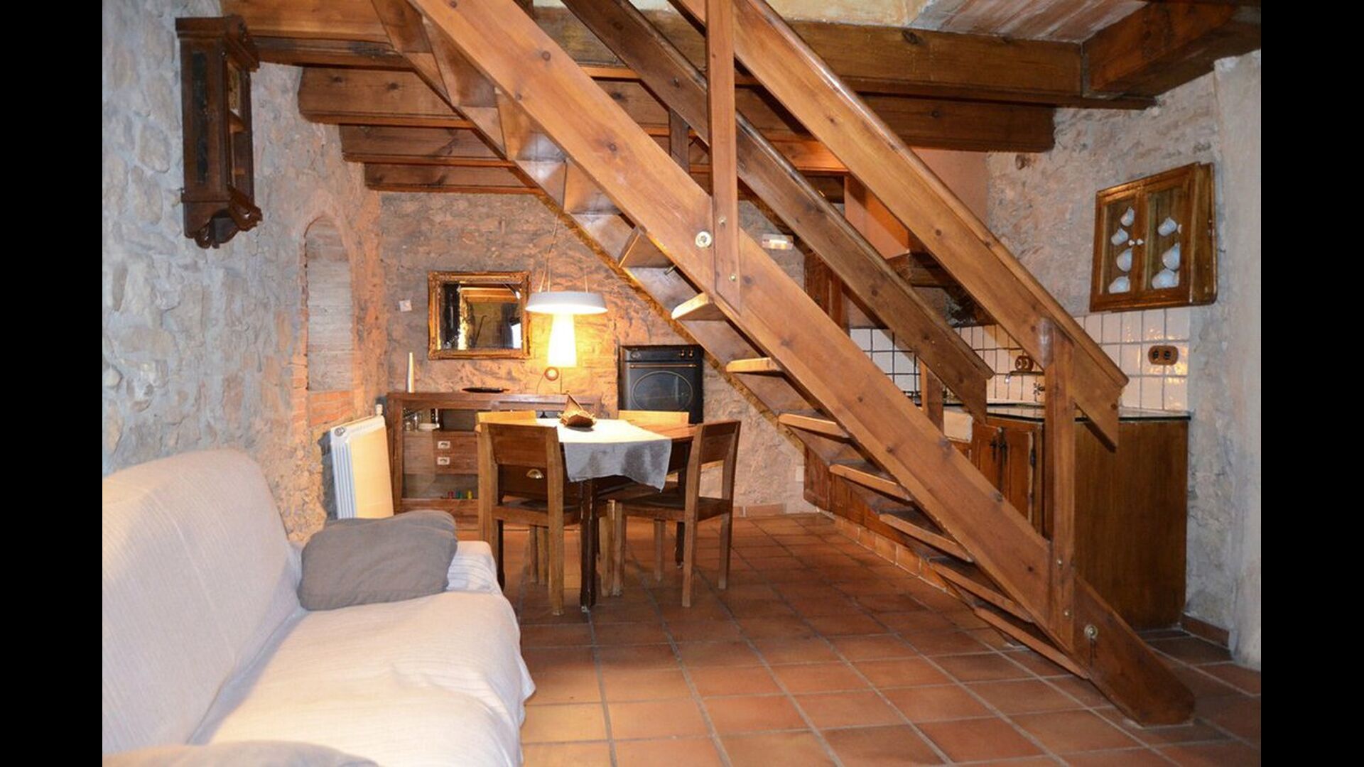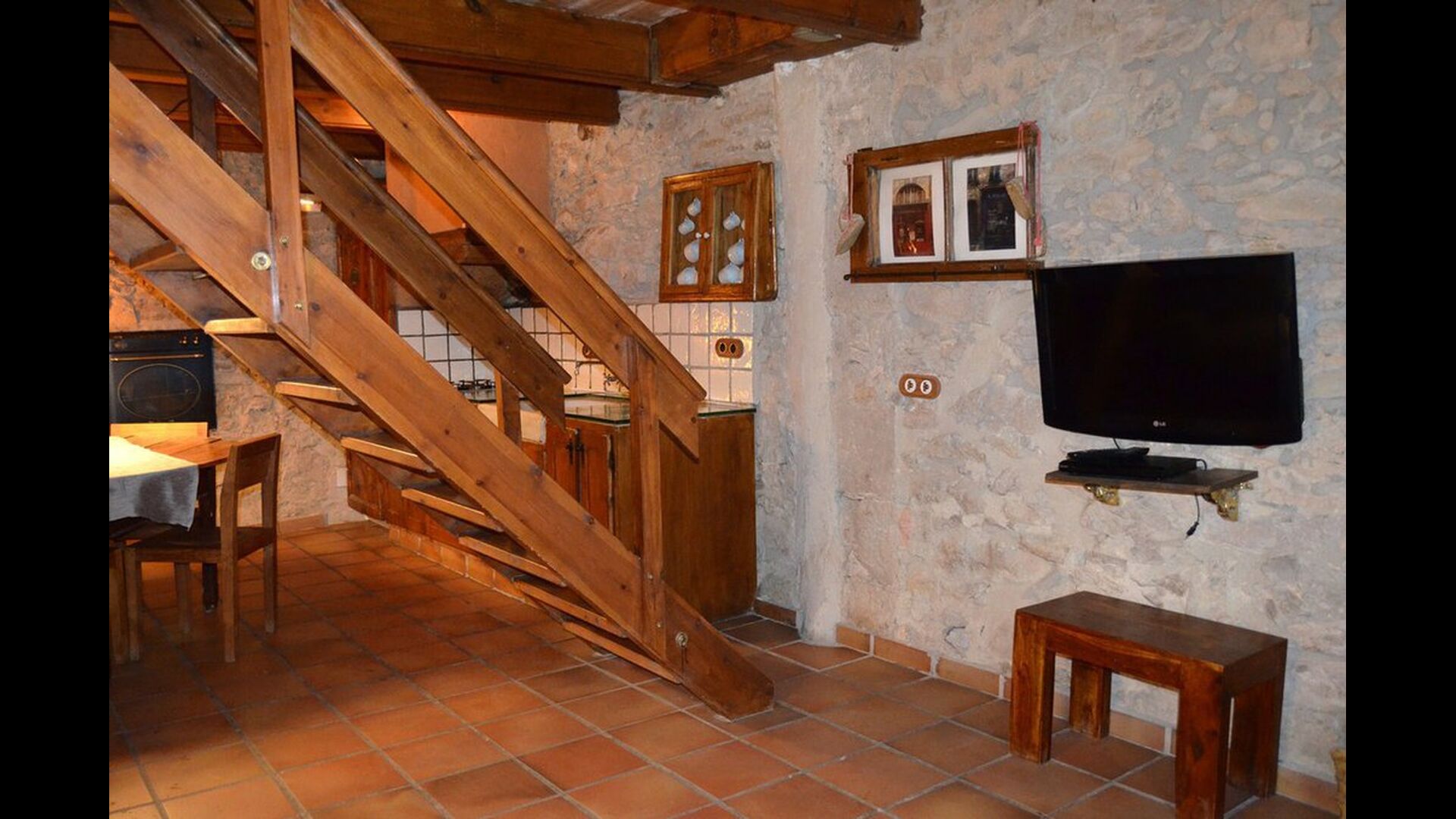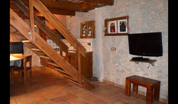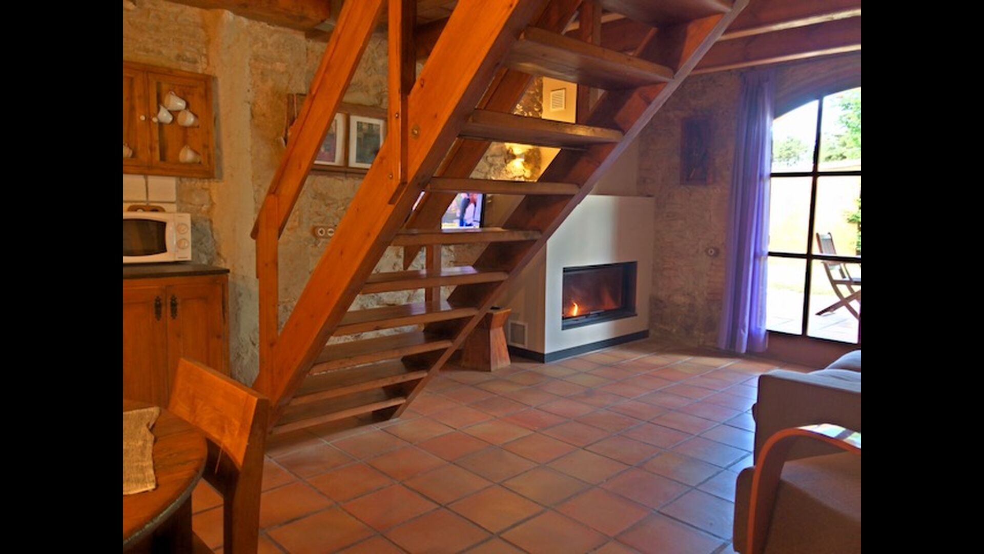 Denne lejlighed er ydermere 90 m2stor. Gennemgående for den er, at den er indrettet meget autentisk med stor respekt for de originale materialer og strukturer. Det giver, sammen med en masse landlige smådetaljer, en ægte catalansk stemning. Lejligheden har et fint køkken med ovn, komfur, opvaskemaskine og lignende redskaber. Der er også en vaskemaskine. Endvidere er der et mindre loungeområde med en blød sofa og TV. I samme rum er der en trappe, som går op til lejlighedens 2. etage, hvor to rummelige og flot dekorerede soveværelser befinder sig.
