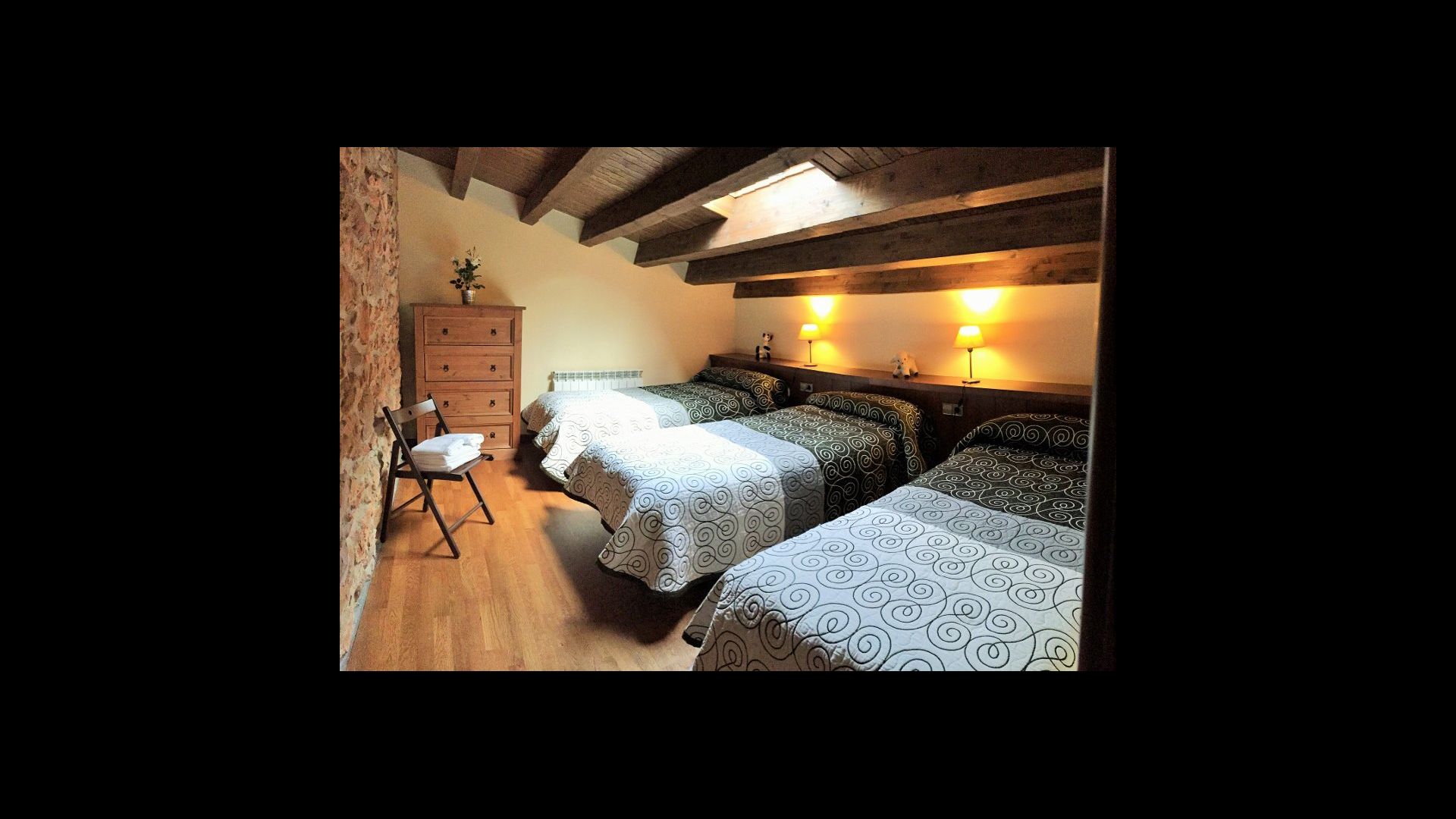 På den øverste etage er en hyggelig lounge, der ligge i forlængelse af et triple værelser med tre enkeltsenge. Værelset er oplagt som børneværelse og den lille lounge vil være fremragende til brug som hyggekrog for børnene om aftenen.