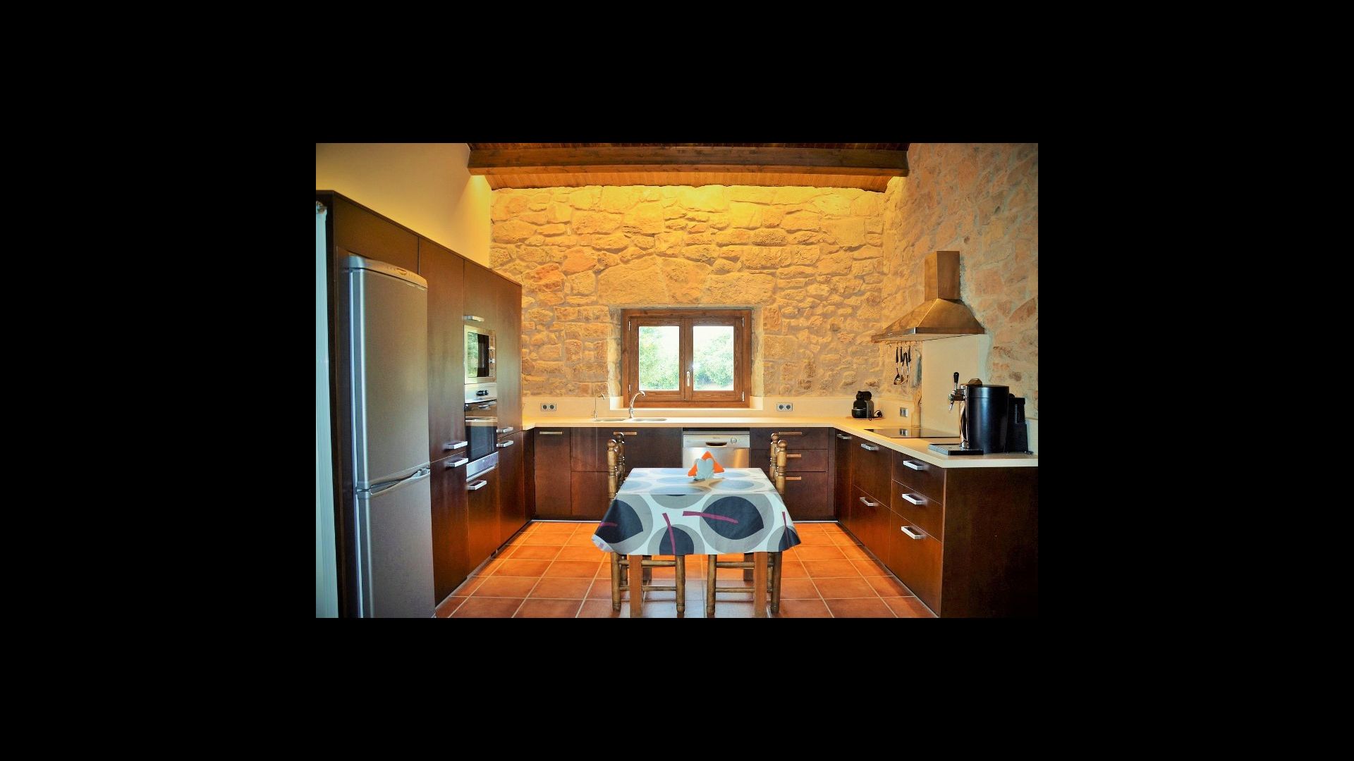I husets underetage kommer man ind i en smuk hall. Til venstre for hallen ligger husets moderne køkken. Her er der fryseskab, ovn, mikroovn, keramiske kogeplader, opvasksemaskine, espressomaskine og såmænd også et fadølsanlæg. Fra køkkenet er der direkte adgang til husets store fællesrum med et smukt catalansk langbord (hvis I skulle få lyst til at spise i skyggen en dag eller to) og en rigtig hyggelig stue. Fra rummet er der skydedøre med direkte adgang til husets stenbelagte terrasse. Husets BBQ findes længere nede i haven. Går man til højre fra køkkenet kommer man til Can de Mateos aktivitetsrum, der nok vil danne rammen for nogle gode timer for gruppens børn. Her er billard, bordtennis og dart.
