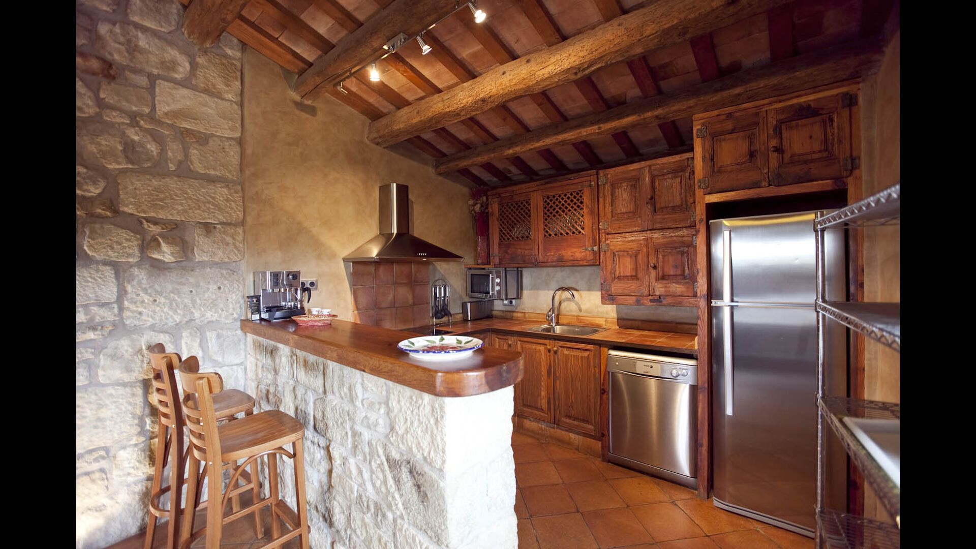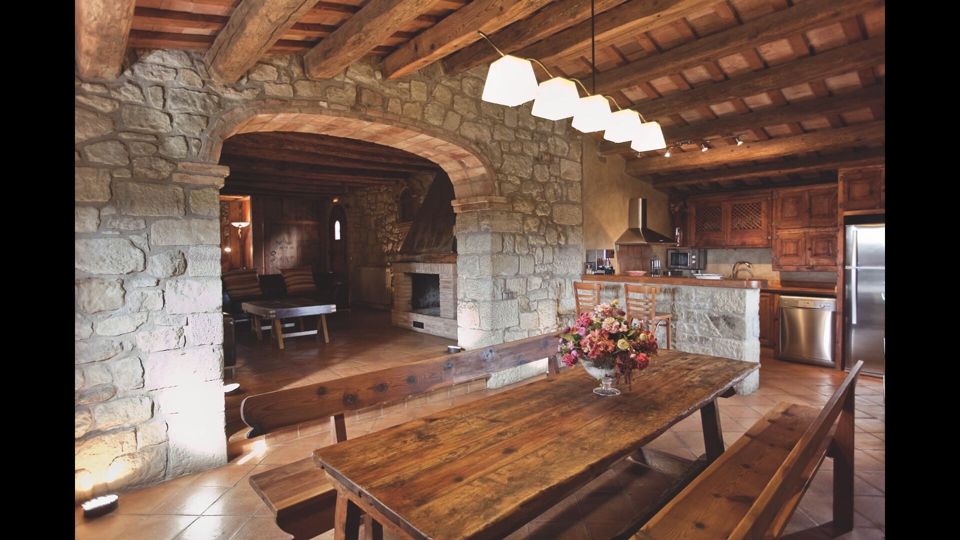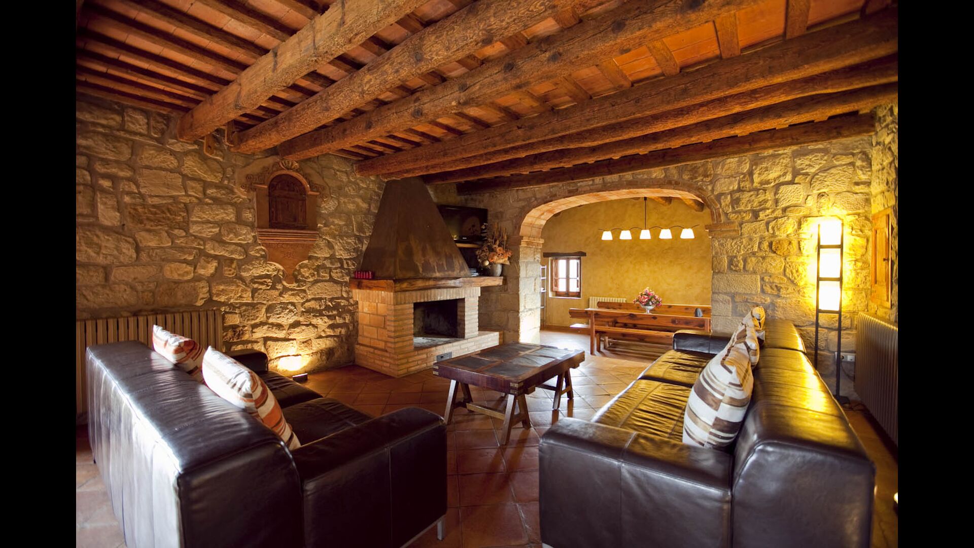 Huset har i alt tre meget hyggelige siddeafdelinger. Det ene er ferieboligens stue, der med lædersofaer, gulvbelysning og pejs både er moderne og klassisk indrettet. Der er også et på første sal med TV og DVD, som egner sig perfekt til børnene. Mange af de originale detaljer som døre og den beskyttende saint i stuen er bevaret og giver en autentisk fornemmelse. Køkkenet er meget moderne og flot indrettet. Der er blandt andet mikroovn, opvaskemaskine og vaskemaskine. Det ligger i forlængelse af spiseområdet, hvor der er et flot langbord af træ.