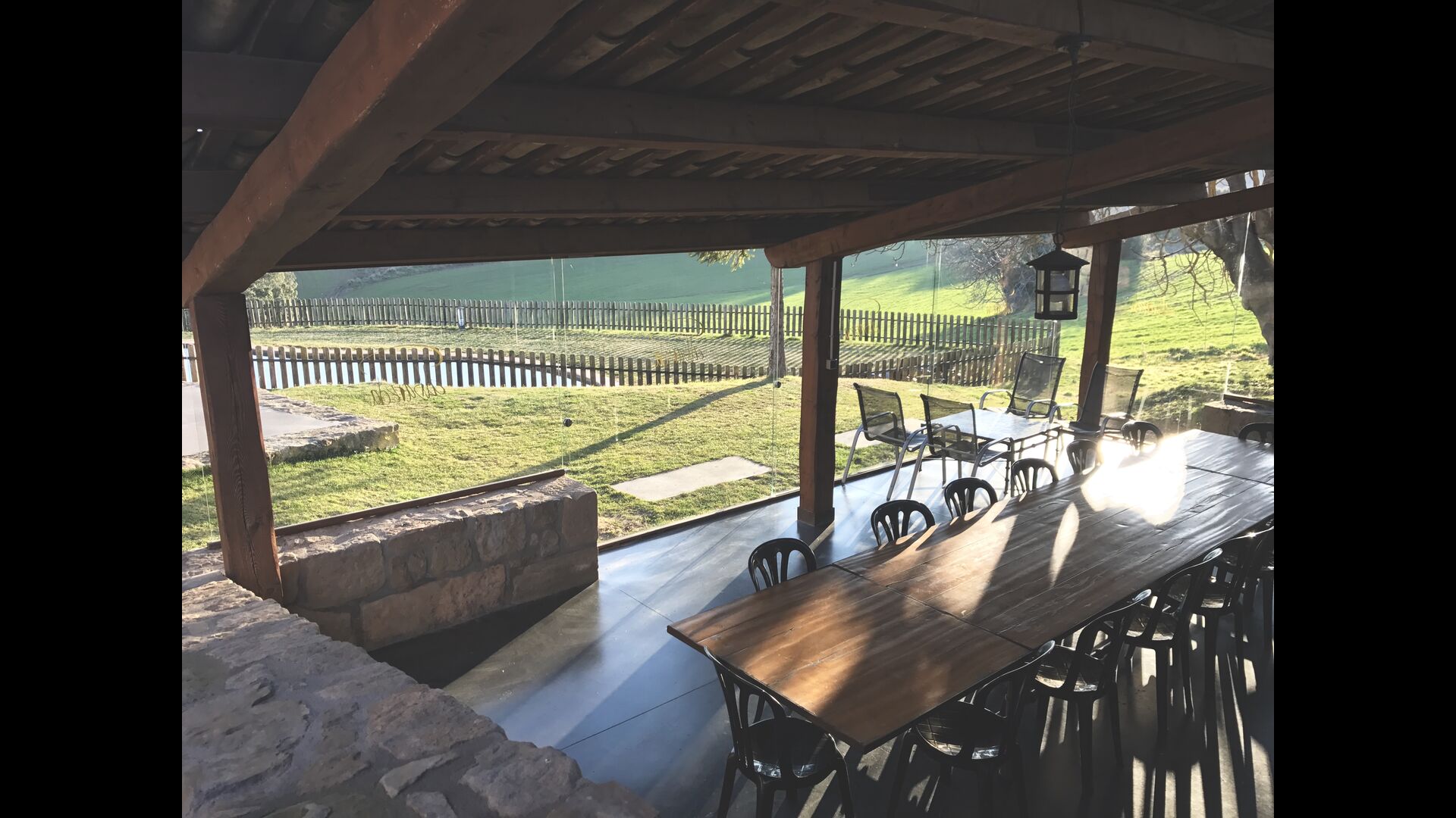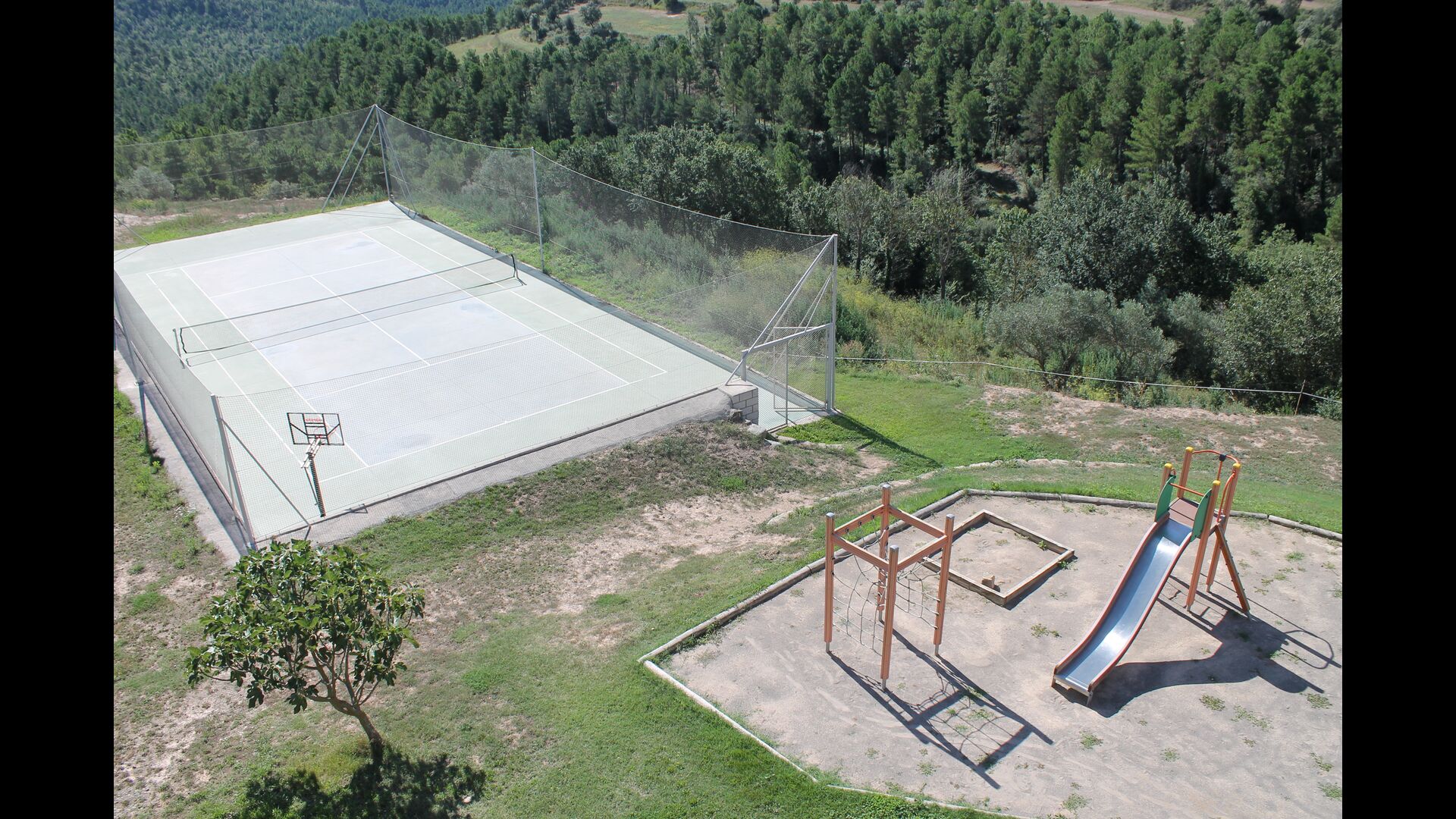 I haven kan i også finde den store overdækkede terrasse med spisebord, BBQ og en kæmpestor gasdreven paellapande, så i kan tilberede den traditionelle spise. Der er ydermere en legeplads med gynger og rutsjebane til små børn. Desuden har huset volleynet, bordtennis, bordfodbold, og der er for nylig blevet anlagt en tennis/fodboldbane med kunstgræs.