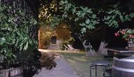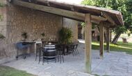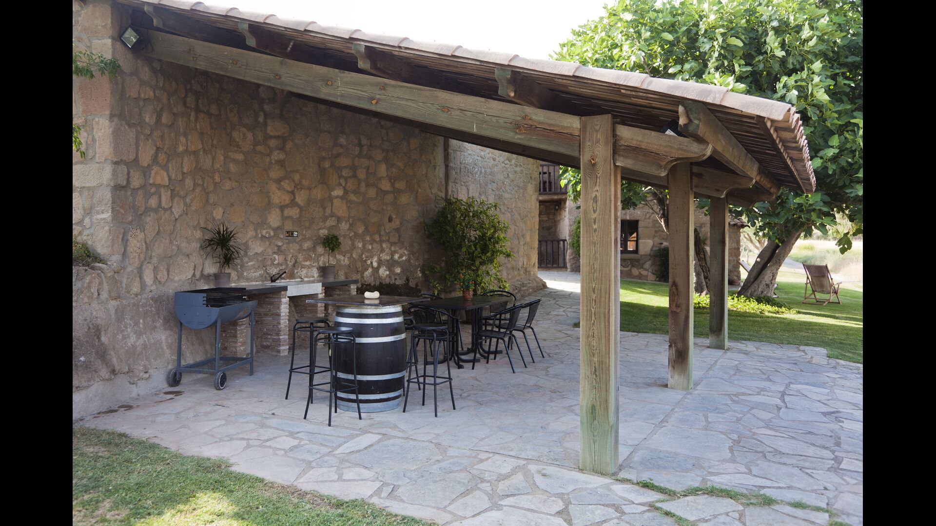 Udendørsområdet har endvidere en stor, overdækket terrasse med BBQ-grill og et lille bord med stole. Lidt tættere på huset ligger endnu en terrasse med et spisebord, hvor man kan spise aftensmad med feriegruppen.