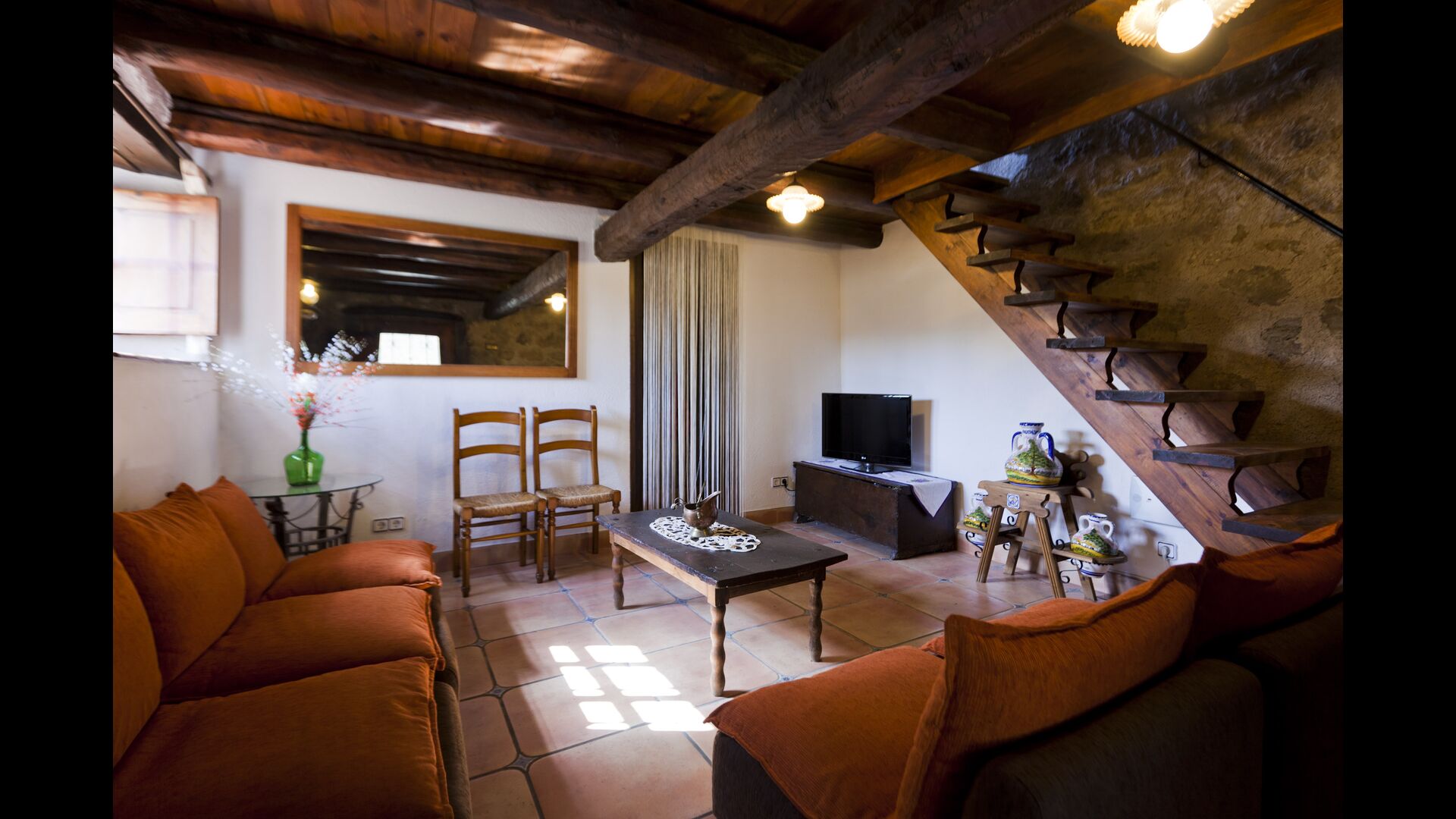 Når man går ind i feriehuset, træder man ind i en dejlig opholdsstue med et sofaarrangement og et fladskærms-TV. Går man videre, er der endnu et hyggeligt siddearrangement med en lille sofa og et par stole og bord. I forbindelse med dette finder man det store catalanske langbord, hvor der er plads til hele familien. I rummet ved siden af ligger det veludstyrede køkken, der har alle nødvendighederne: køleskab, fryser, ovn, opvaskemaskine, toaster, komfur, mikroovn, etc. I stueetagen ligger det ene af de to badeværelser også.