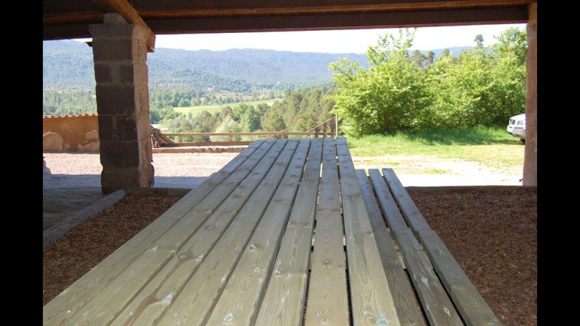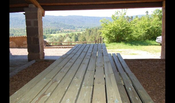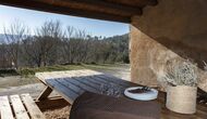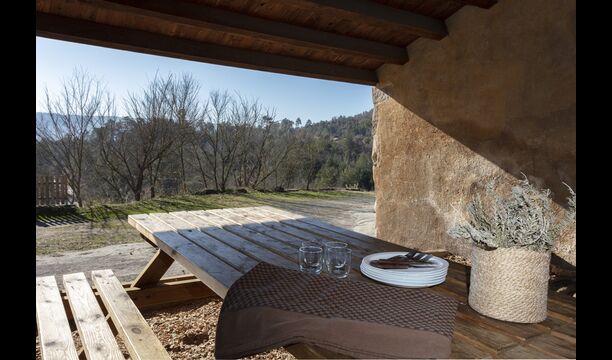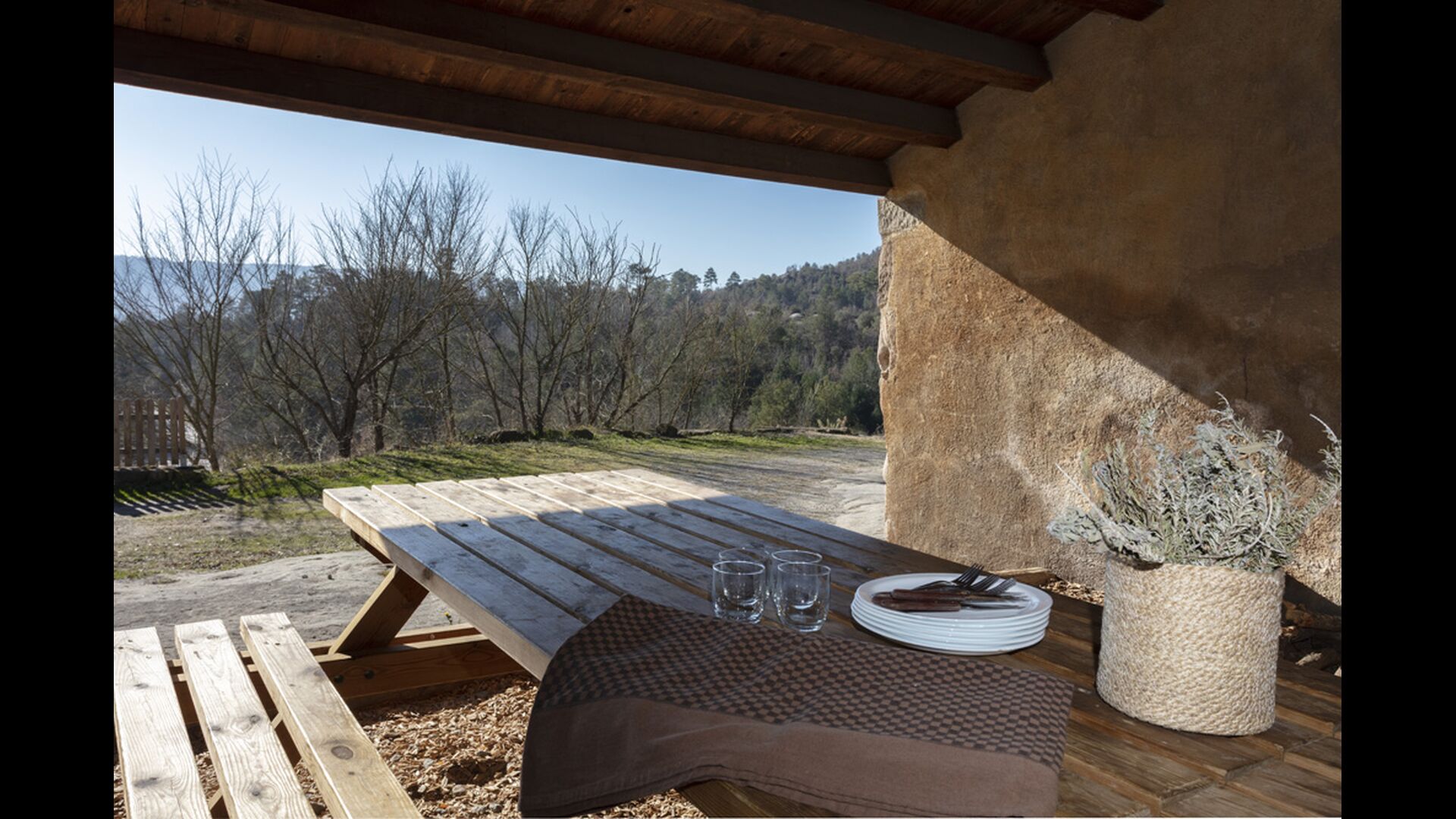 Fra den overdækkede terrasse kan I nyde jeres middage og udsigten over det catlanske landskab