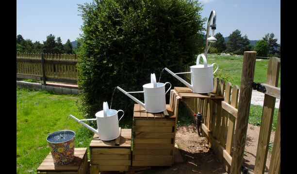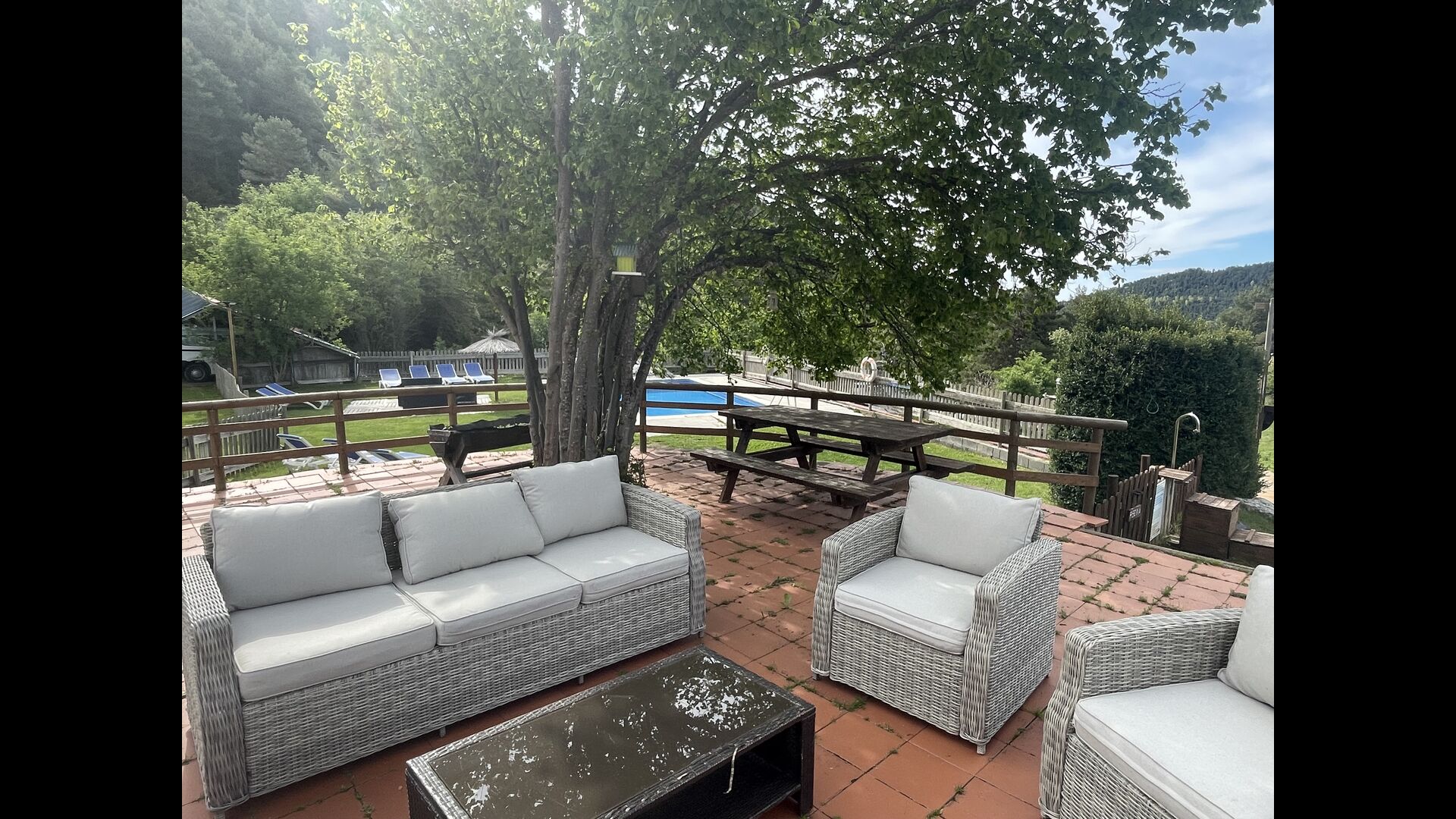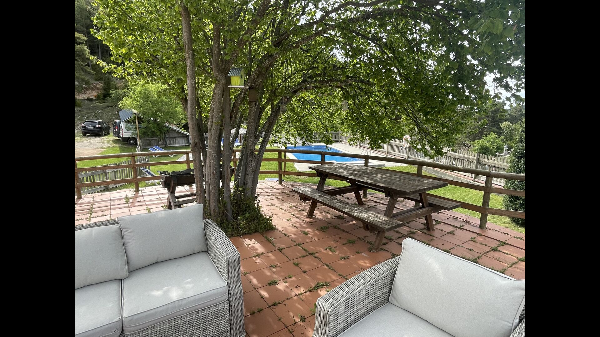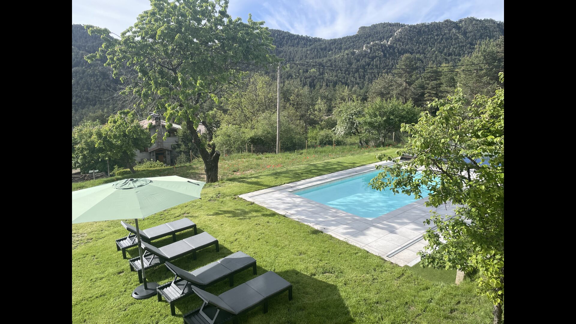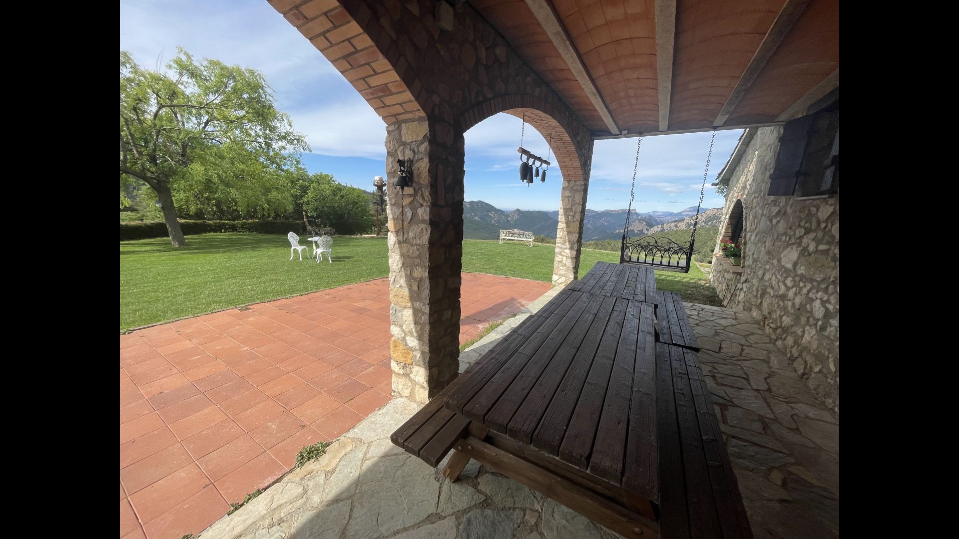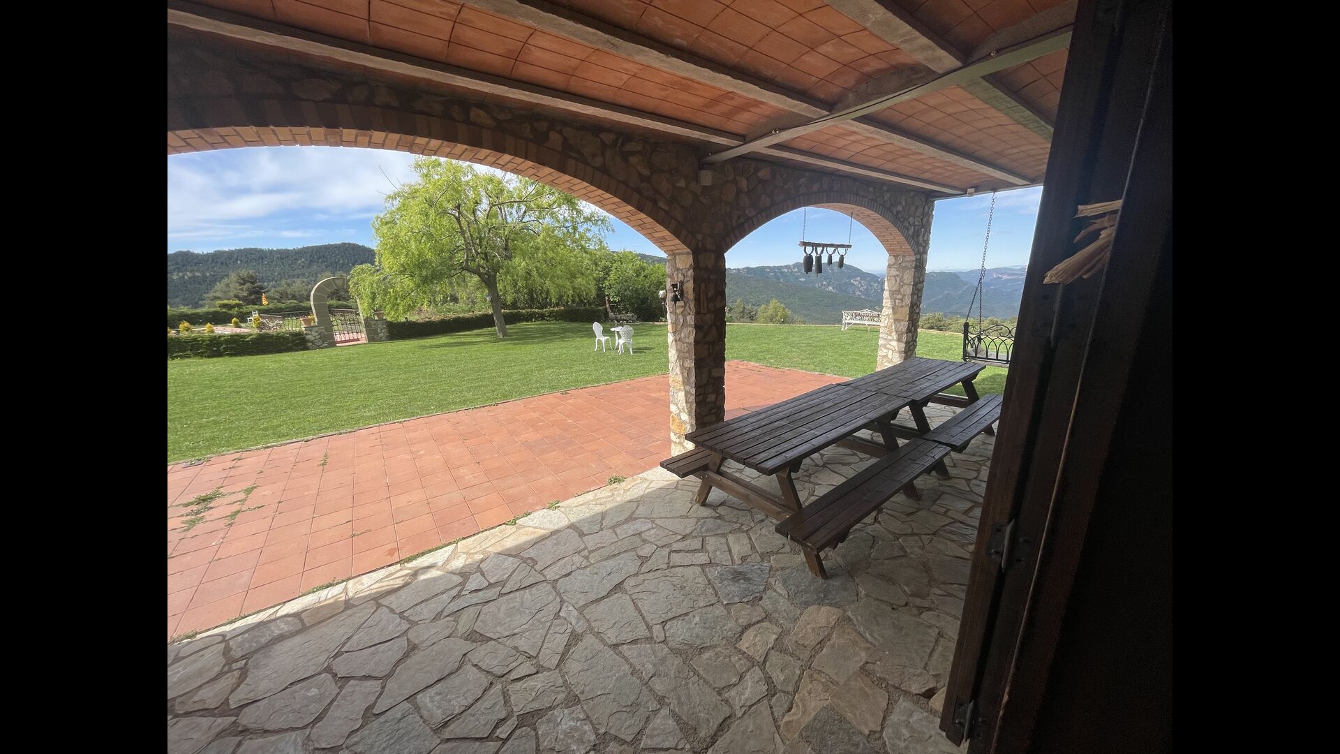 Ejendommen er beliggende på en skråning, så Jordi og Constanca har adgang til deres terrasse og have bag huset, mens de tre feriehuse vender ud mod haveområdet med alle de faciliteter, der ses på billederne .