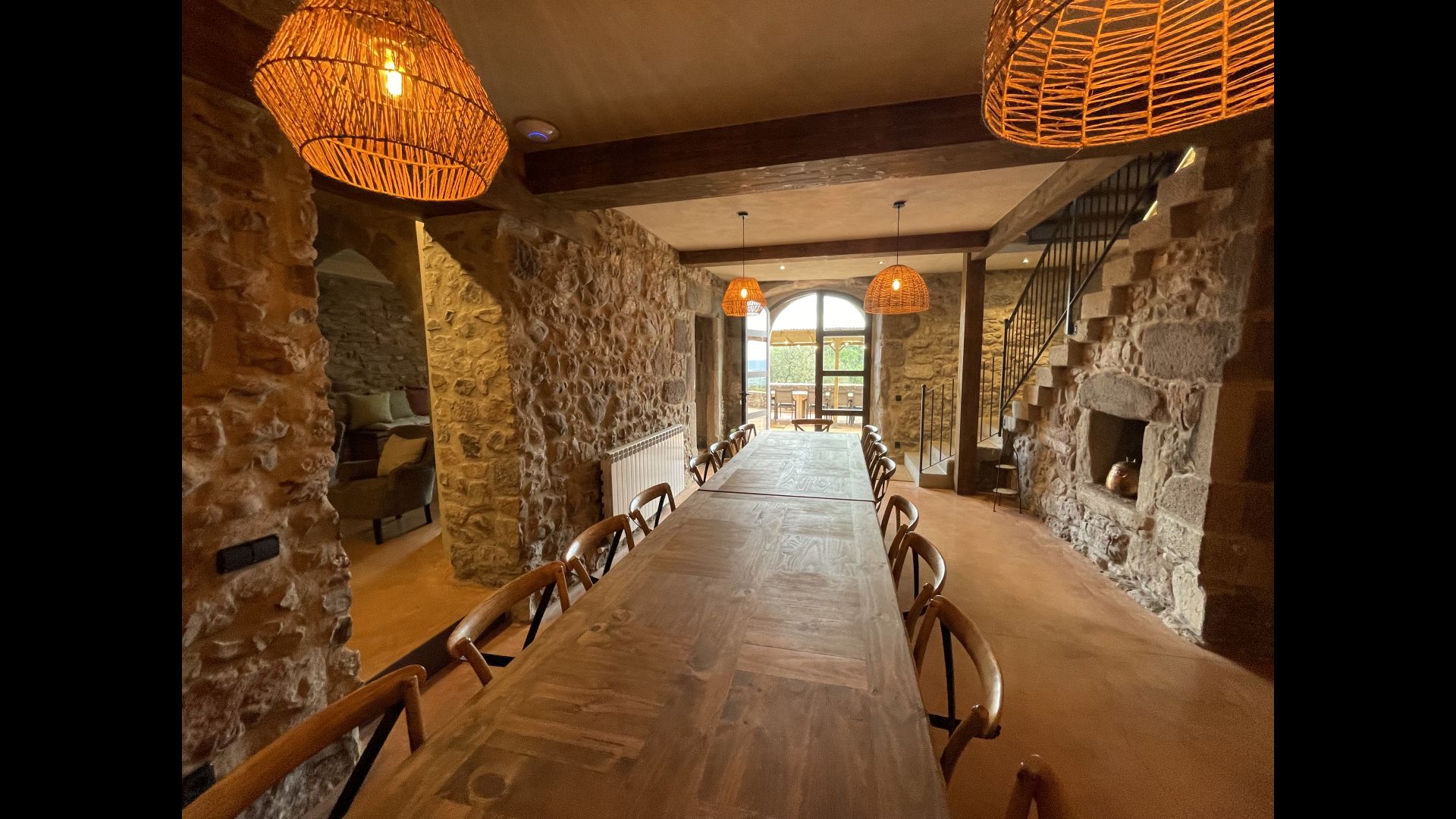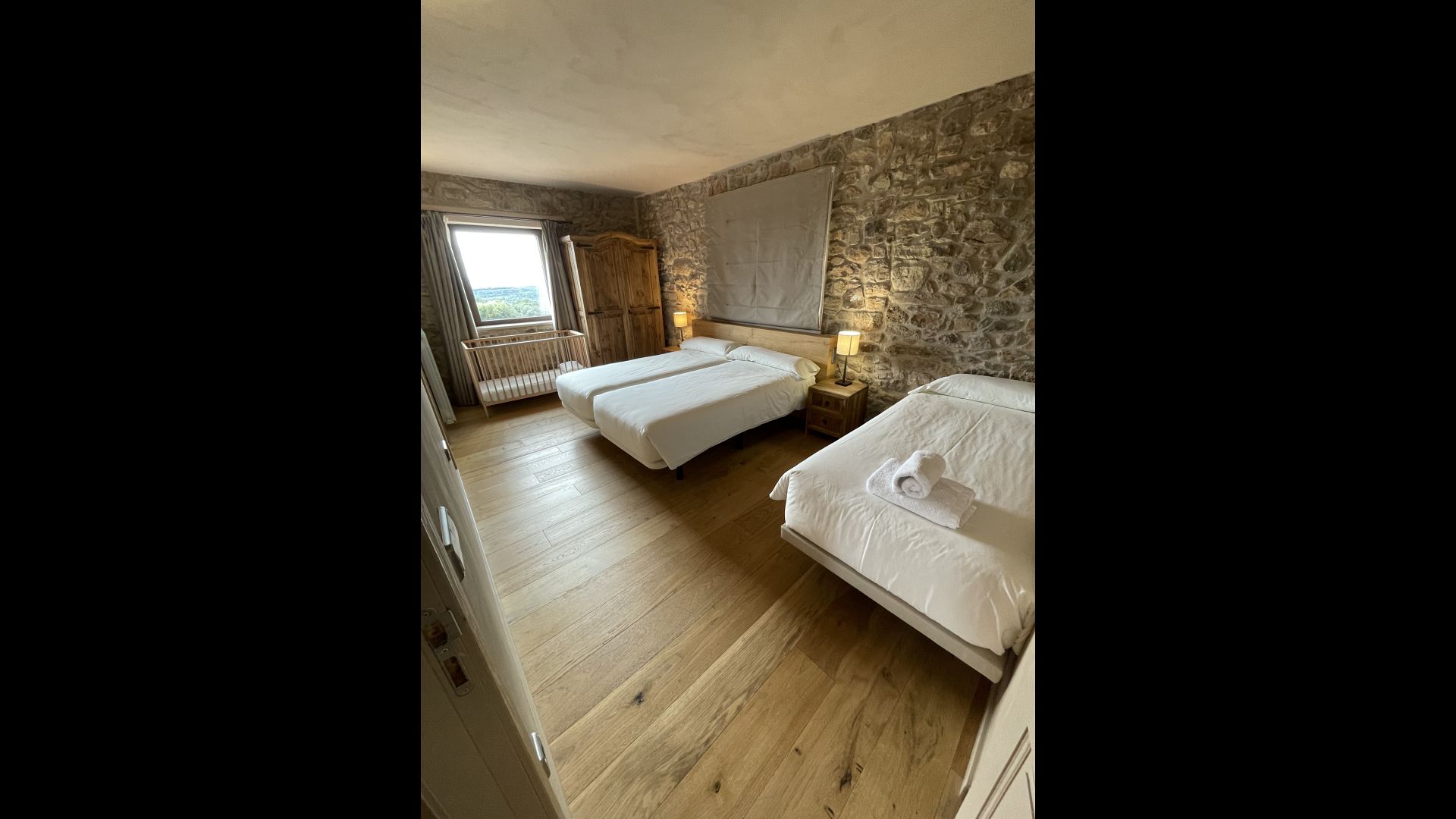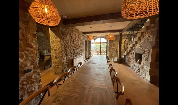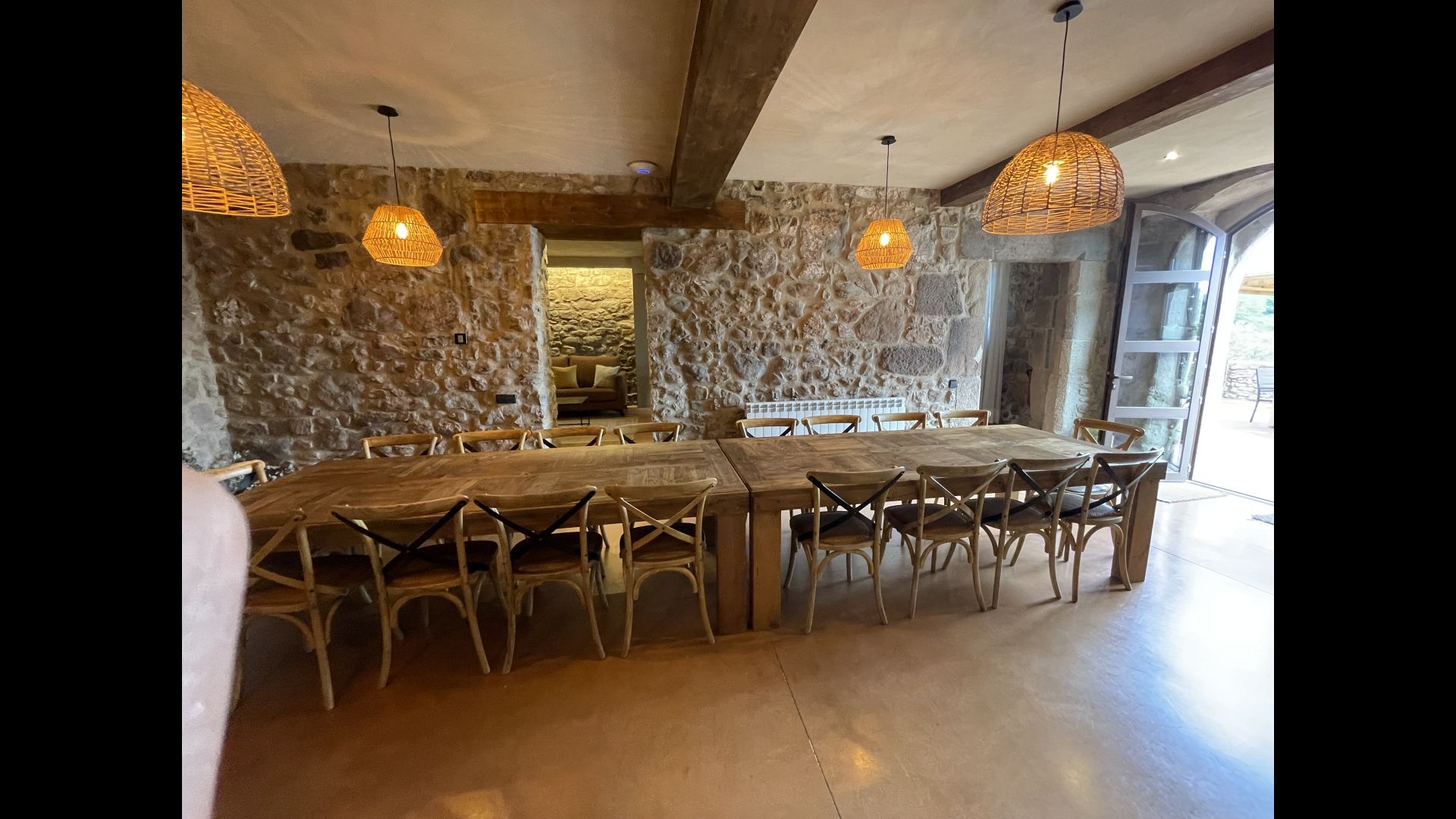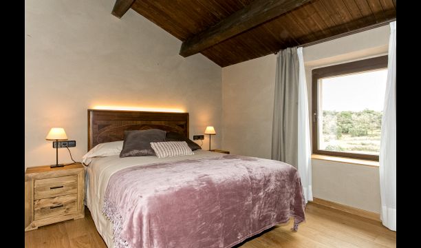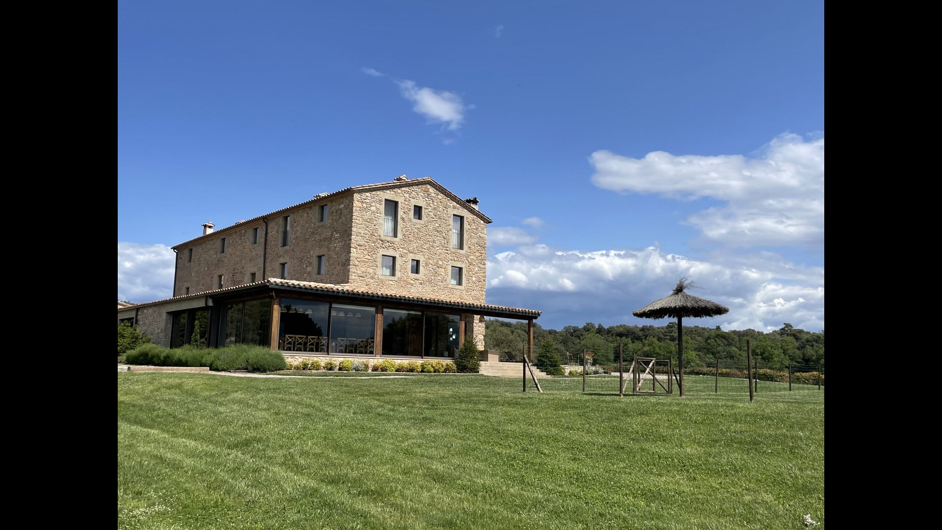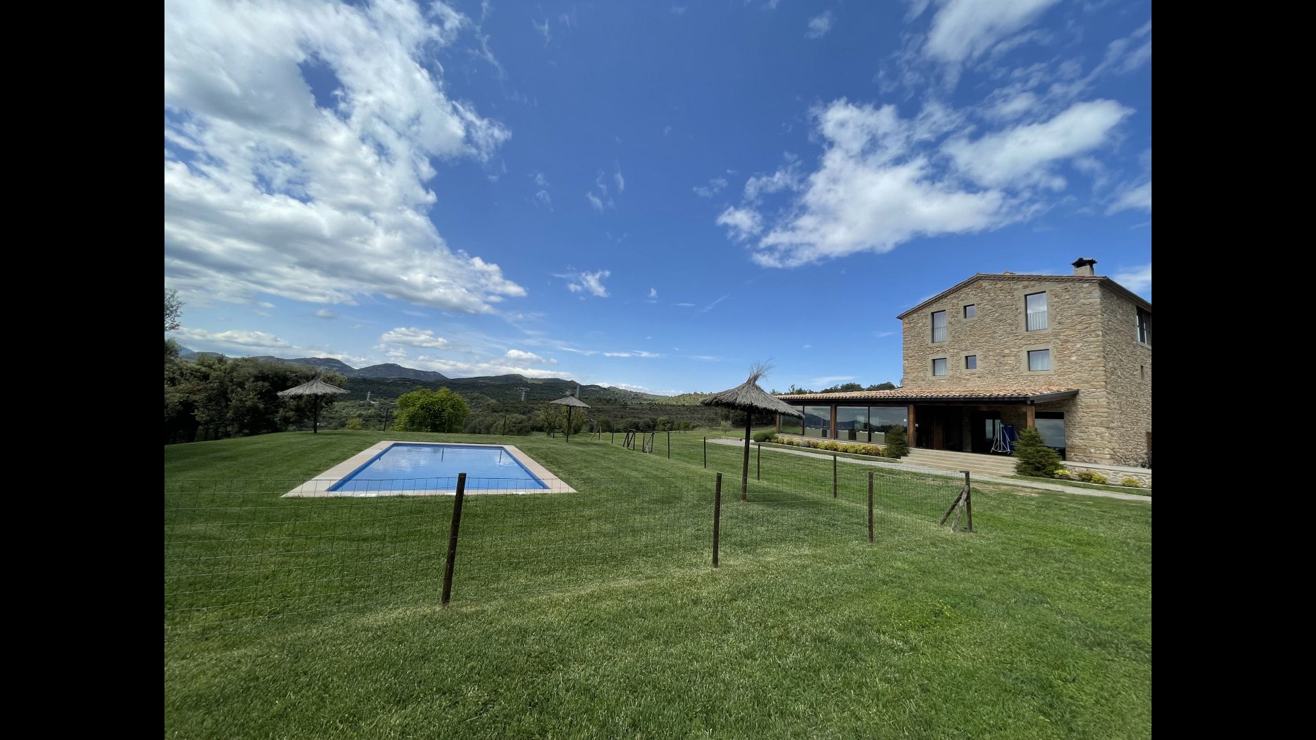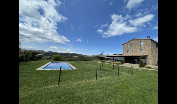 A spectacular house designed for large groups who want to enjoy a luxurious vacation, full of details from the original construction, framed in wooden furniture and warm fabrics. It has great views over the mountains of the Pre-pyrenees. It is located a little over 1 hour from Barcelona and Girona. On the 185-hectare land, 2 nearby houses are rented, totally separate and independent. Each with their own terrace and adjacent land. The pool, football field and volleyball field are shared by the 3 houses.