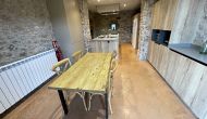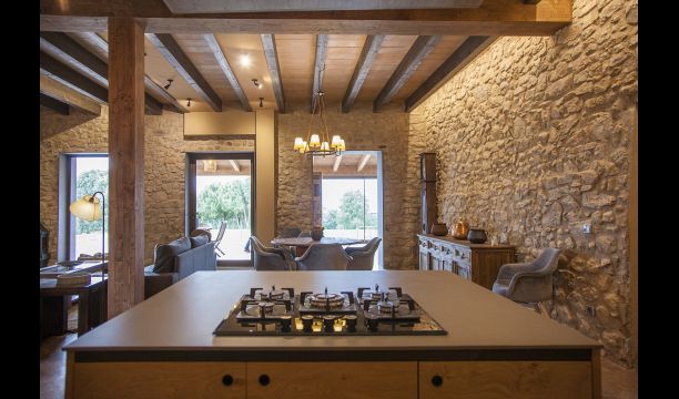 Fra den udendørs terrasse, med en grill, et sted at spise og liggestole til at slappe af, går vi direkte ind i Mas' store spisestue. Denne fungerer som husets hjerte og forbinder de to små stuer i stueetagen med det store køkken. Køkkenet er fuldt udstyret med 2 gasblus, 2 opvaskemaskiner, 2 køleskabe med fryser, ovn, mikroovn og kaffemaskine, samt et lille morgenbord.