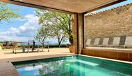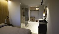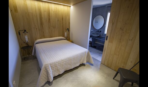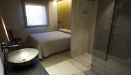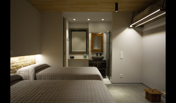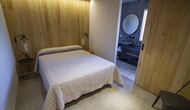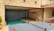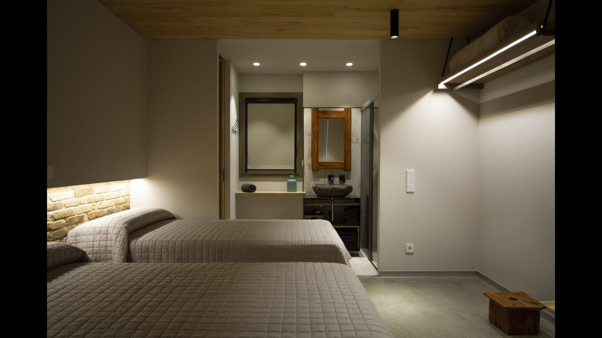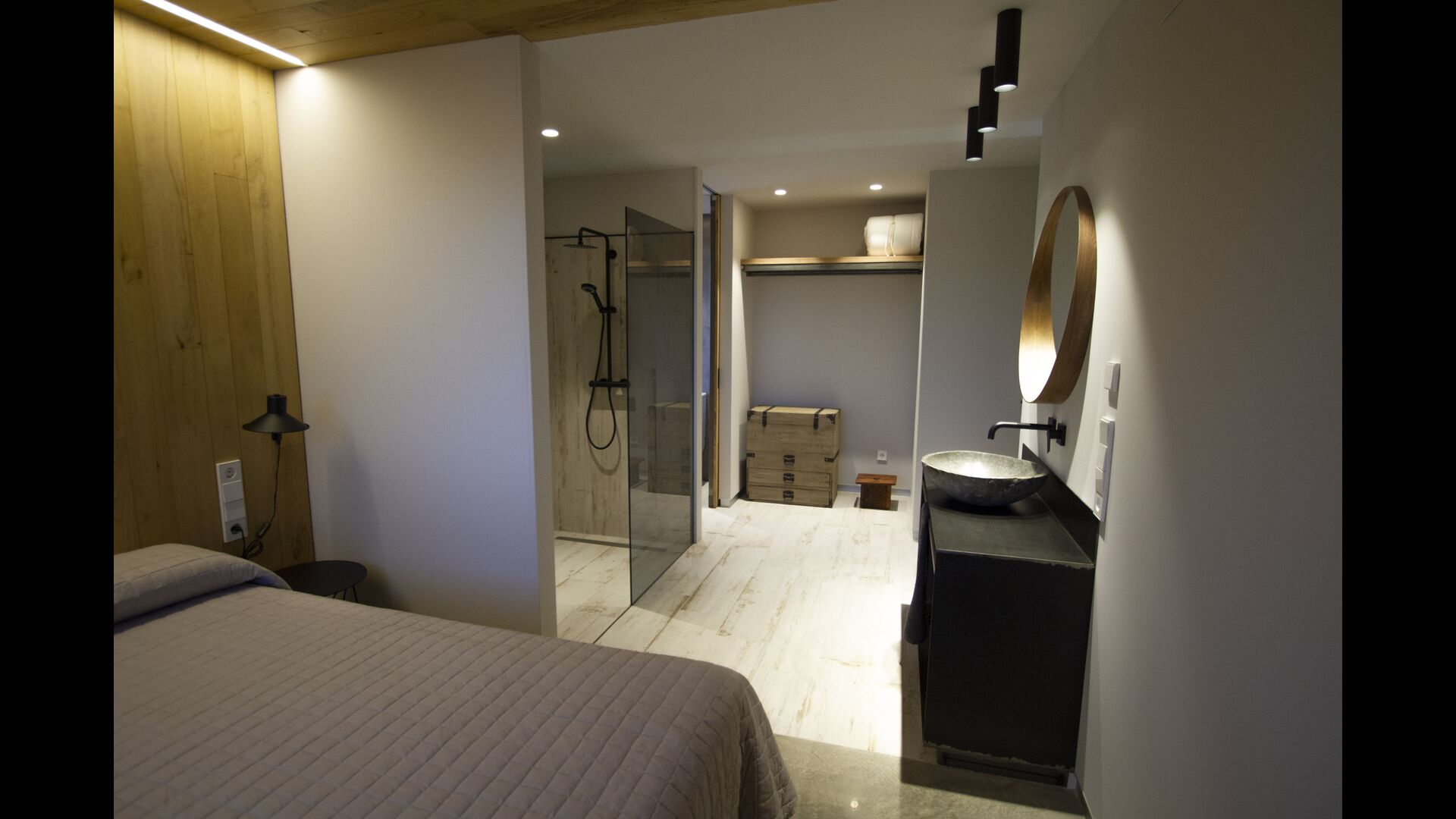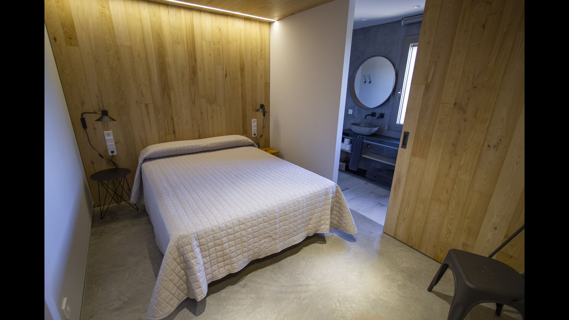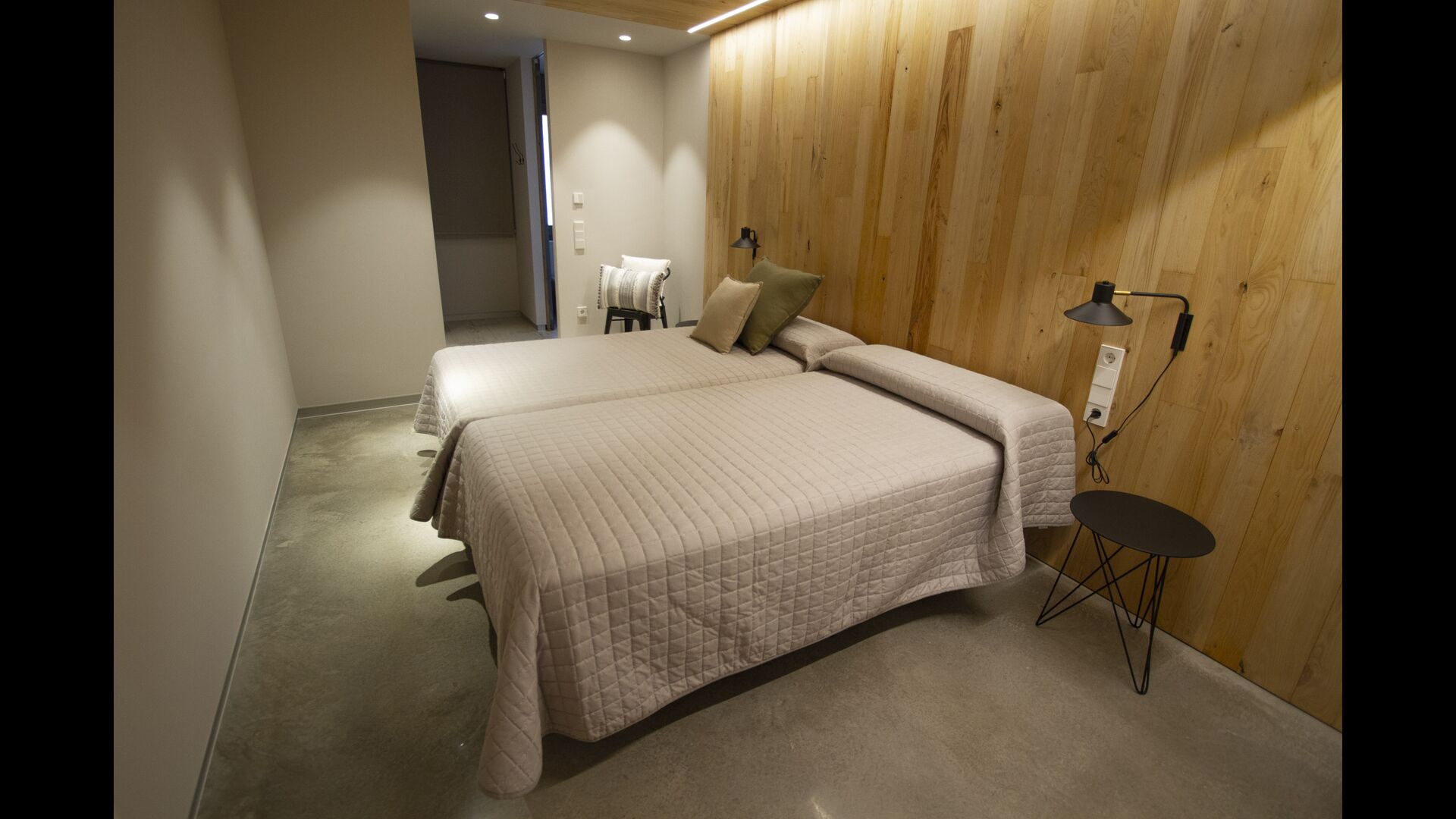 På den midterste etage finder du to dobbeltværelser på 1,5 x 2 m; en tredobbelt og to dobbeltværelser med enkeltsenge på 1,05 x 2 m. Alle med ensuite badeværelser. På denne etage finder du også den opvarmede indendørs / udendørs swimmingpool, der er bygget således, at den fungerer som en udendørs pool om sommeren, men om vinteren kan væggene lukkes, og varmen tændes. Dette gør det muligt at bruge poolen hele året rundt!