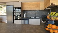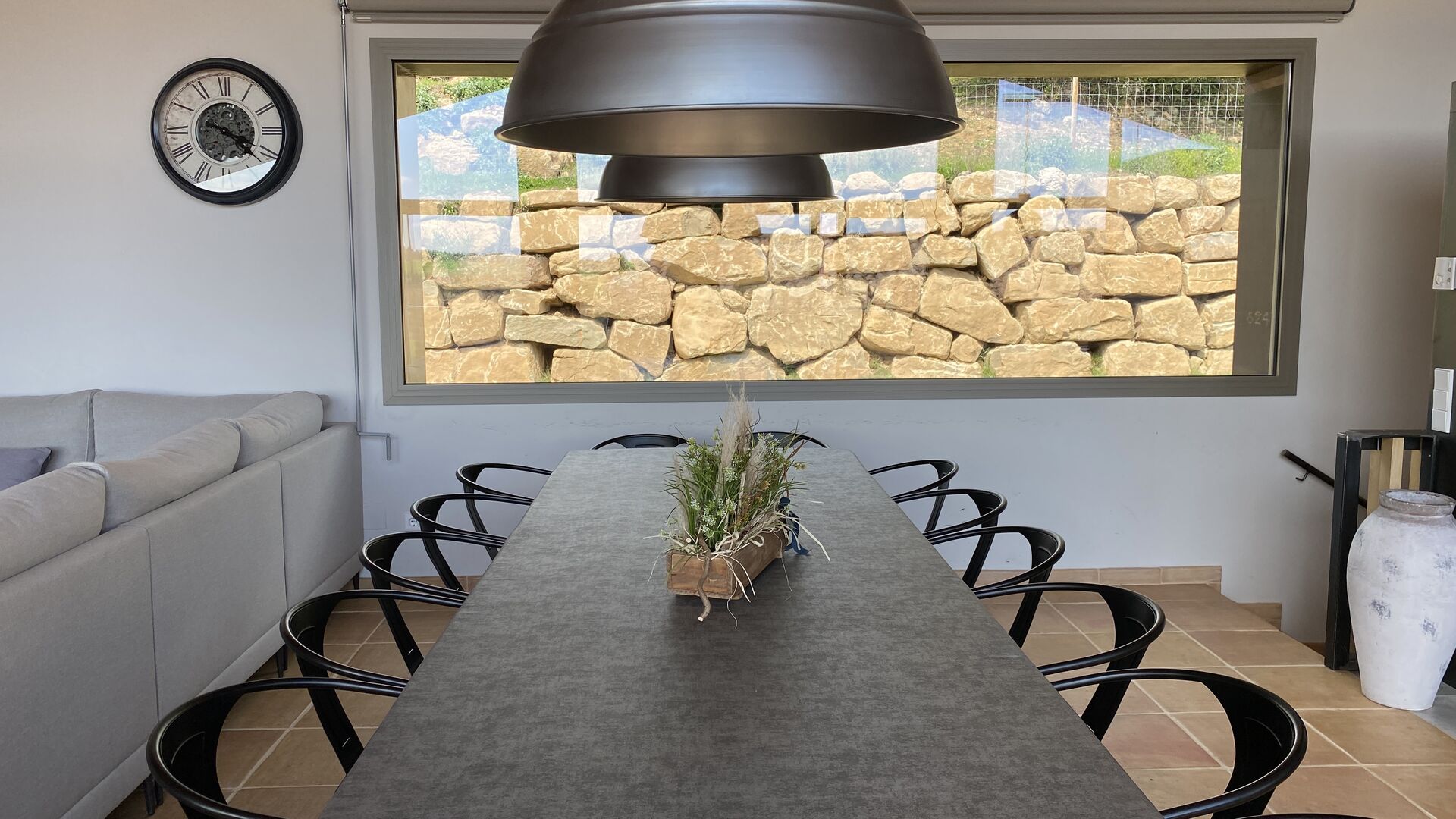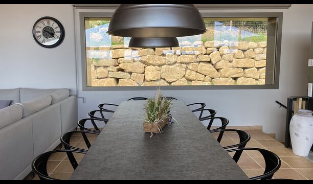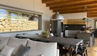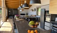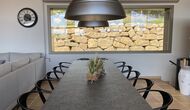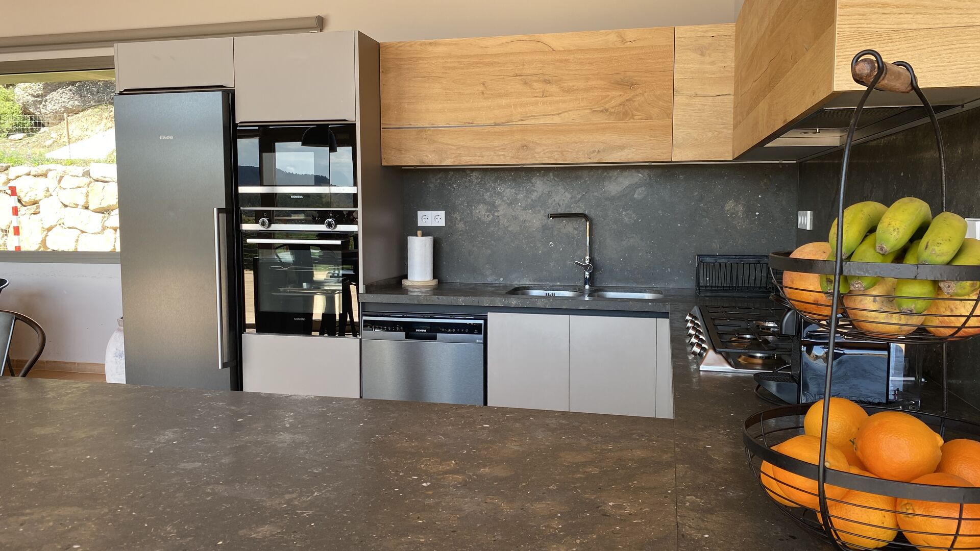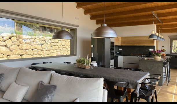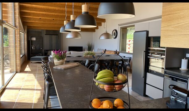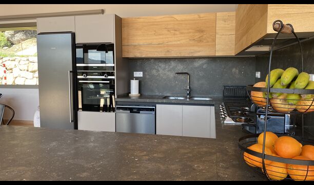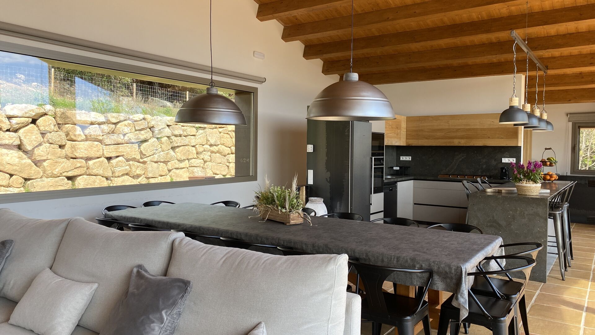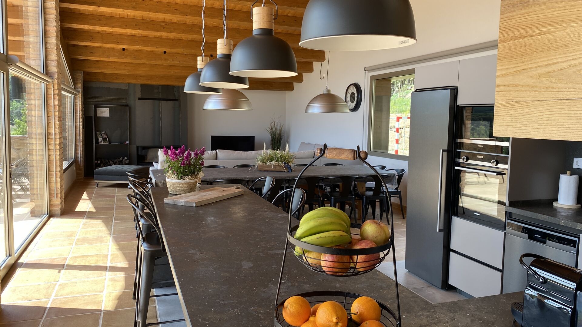 Huset har plads til 15 gæster. På øverste etage finder du det store åbne køkken og opholdsstue med pejs. Der er fantastiske rammer for madlavning og nydelse af måltider med panoramaudsigt og direkte adgang til den store terrasse. Du finder også en grill på den store terrasse, så det er også muligt at lave mad udenfor.