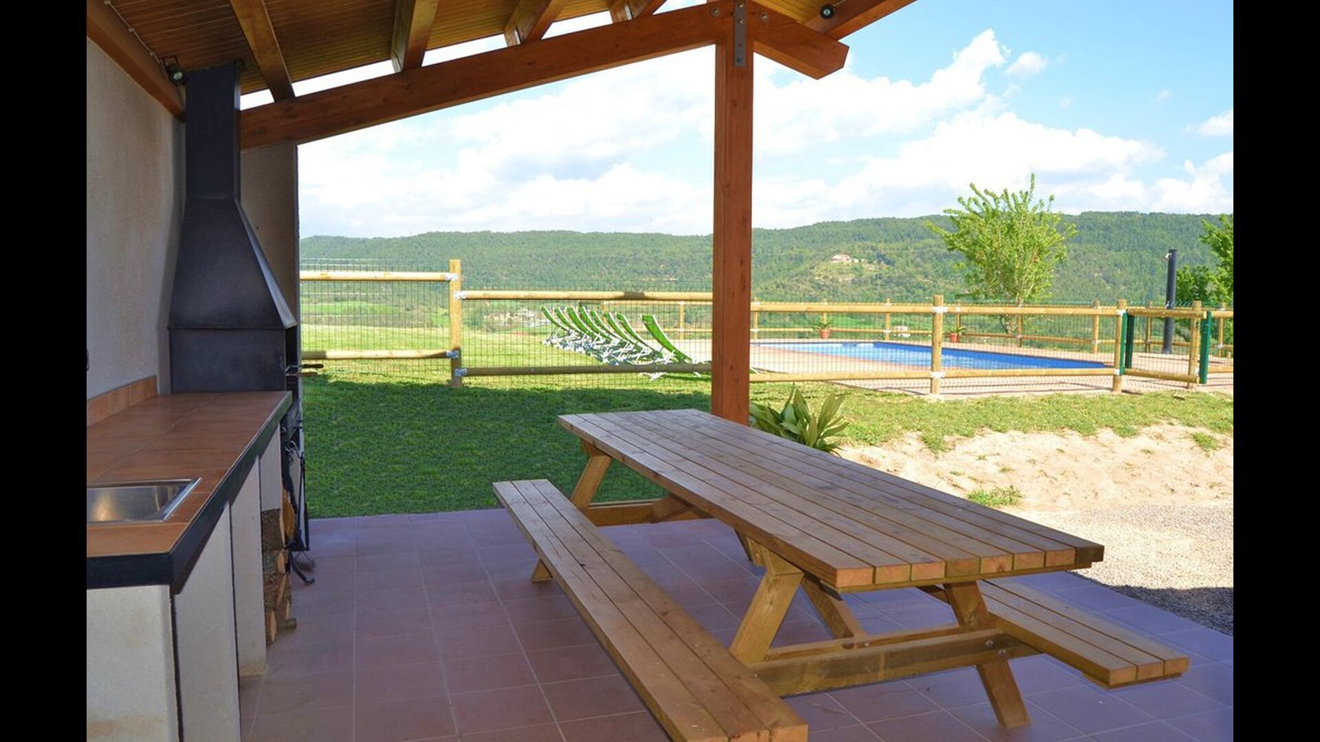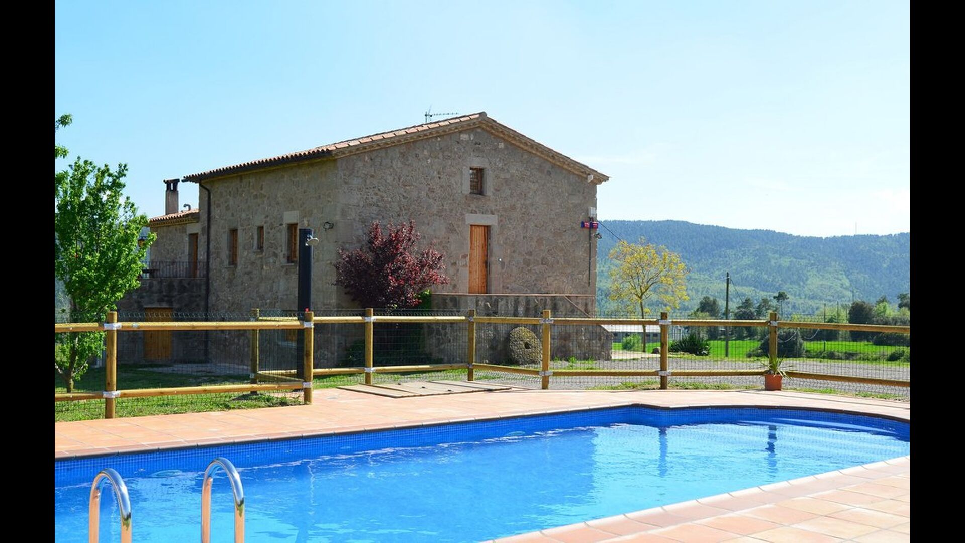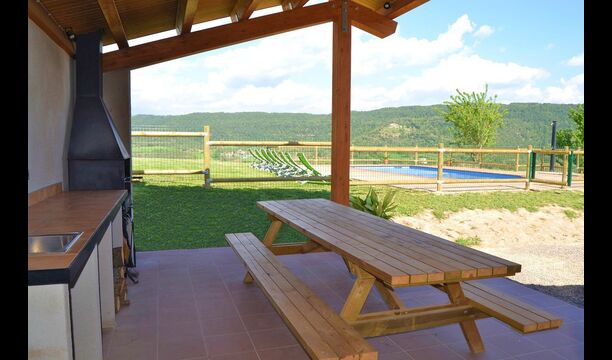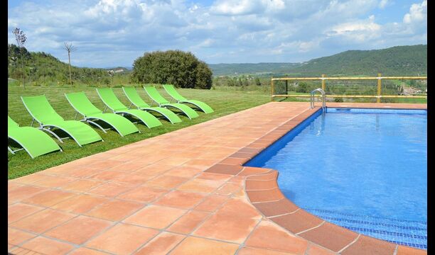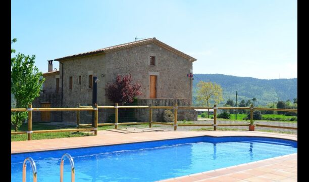 Can Pont Salta er et super lækkert feriehus på 450m2 med en helt unik beliggenhed på en bakketop med en meget smuk udsigt over den smukke dal Merles Valley. Fra grunden har i et fint udsyn til den lillebitte landsby Santa Maria de Merles, der ligger 1,5 km. fra huset og fra huset er en lille sti, til landsbyen. Huset er gennemrenoveret og fremstår i dag meget lækkert. Udendørsarealet er stort og huset swimmingpool område er perfekt placeret med udsyn over dalen. I forbindelse med swimmingpoolområdet er bygget en overdækket terrasse med BBQ og udekøkken. Herfra er der desuden adgang til et spille rum med bordtennis og bordfodbold. At poolen og den overdækkede terrasse er placeret tæt er oftest en rigtig god idé i et feriehus, da man her kan trække sig lidt tilbage i skyggen og samtidigt være en del af børnenes leg i swimmingpoole. Vil man hellere dase er der i Can Pont Salta liggestole til alle. I haven er der desuden også et mindre legestativ til de helt små i gruppen.