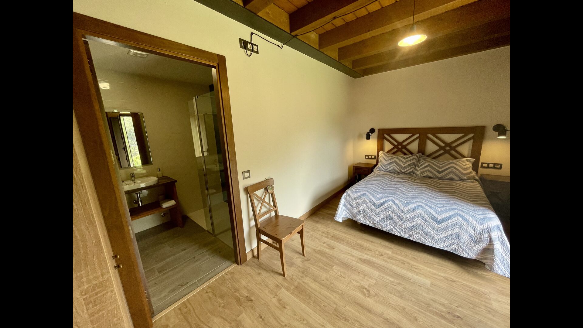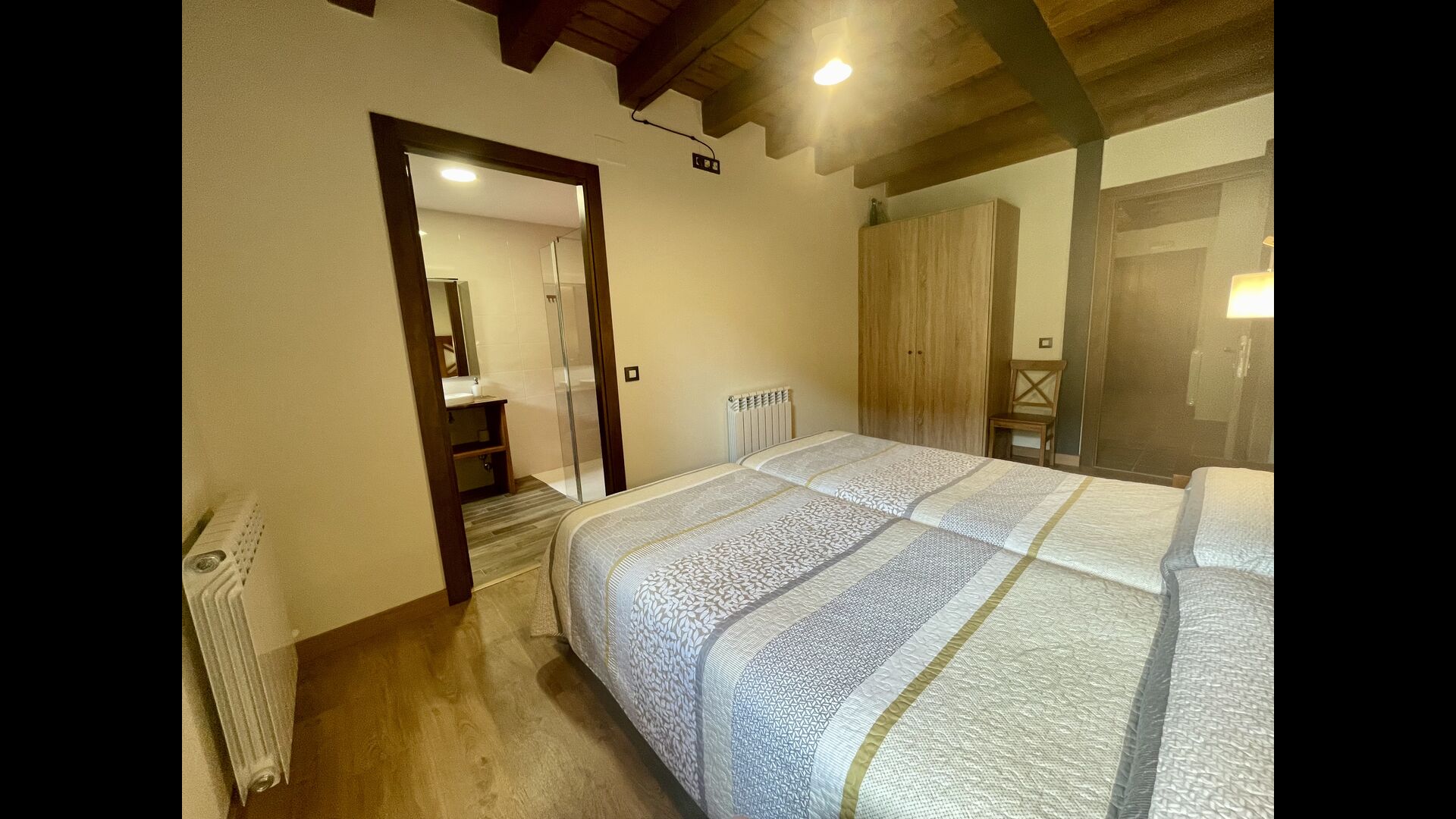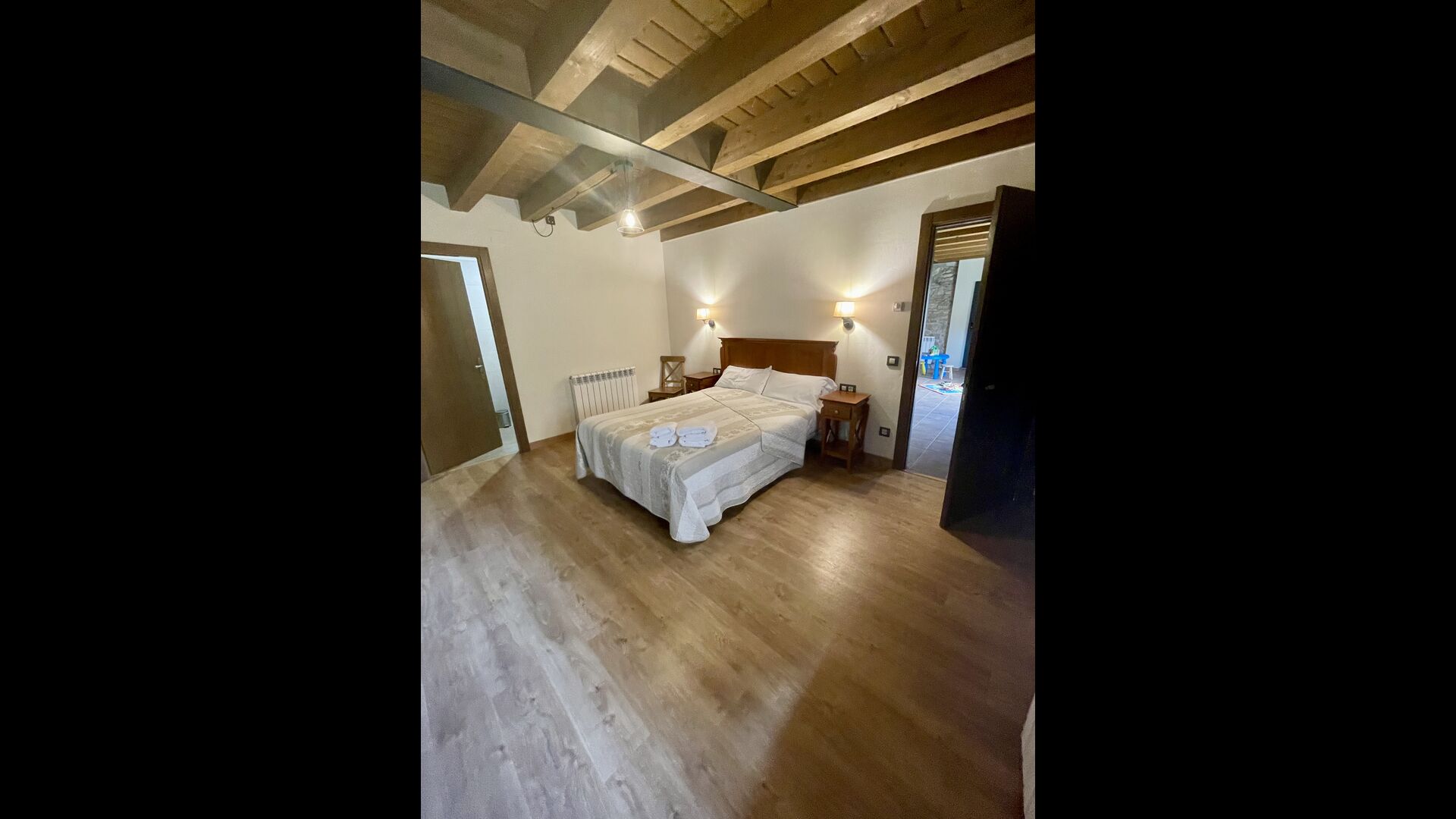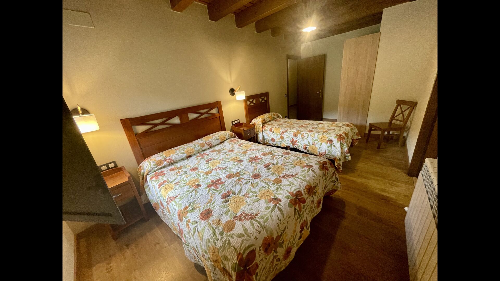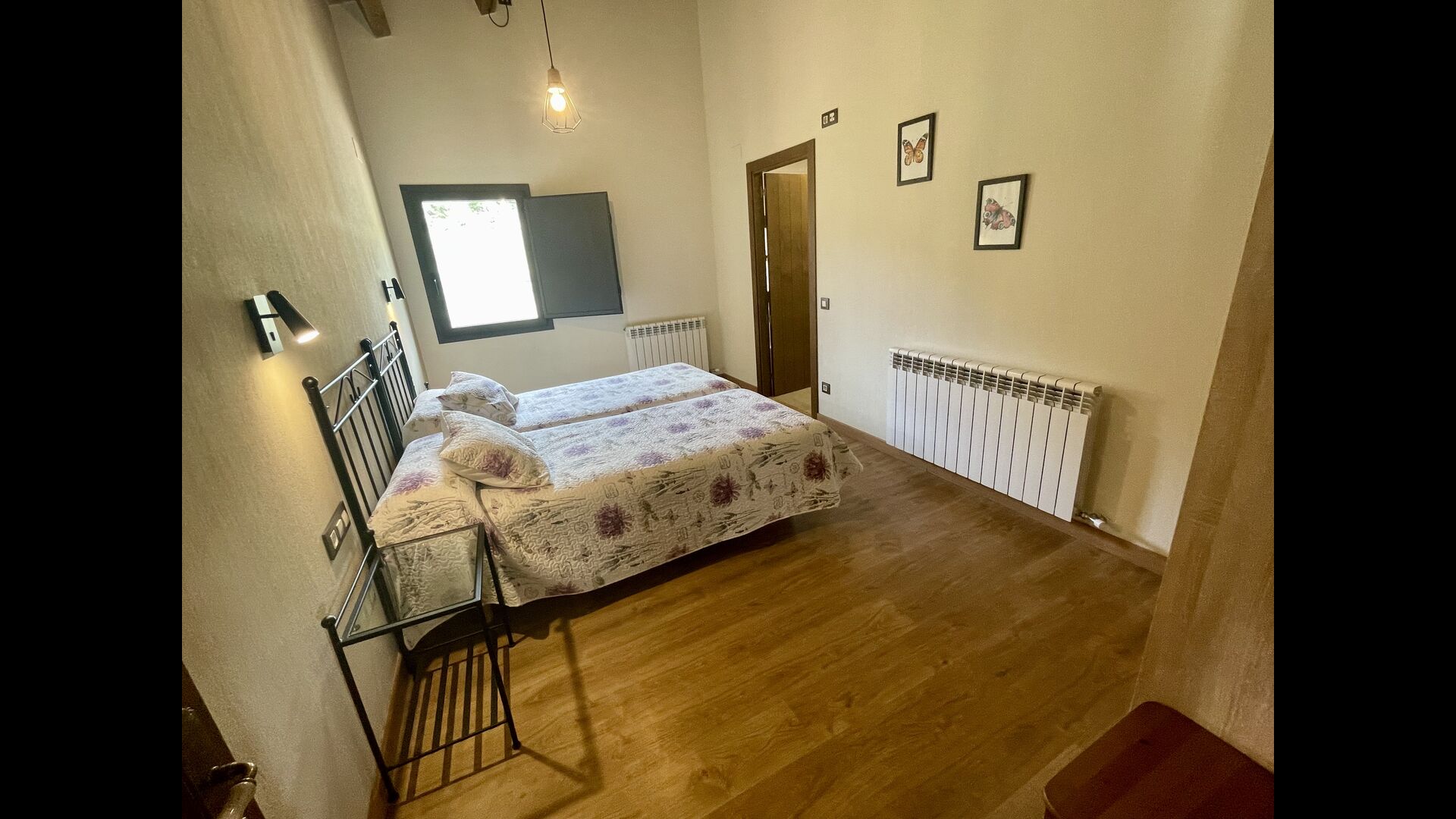 På første sal finder du 2 dobbeltværelser med deres henholdsvise badeværelser, 1 3-personersværelse med dets badeværelse, og 1 værelse med 2 enkeltsenge med et badeværelse.