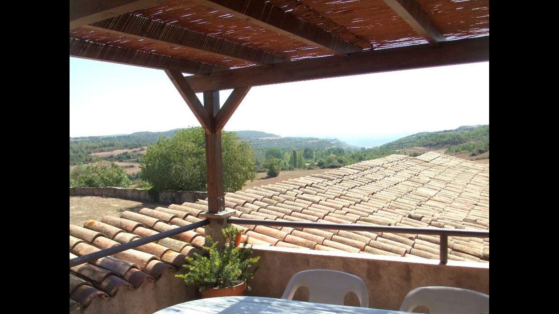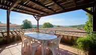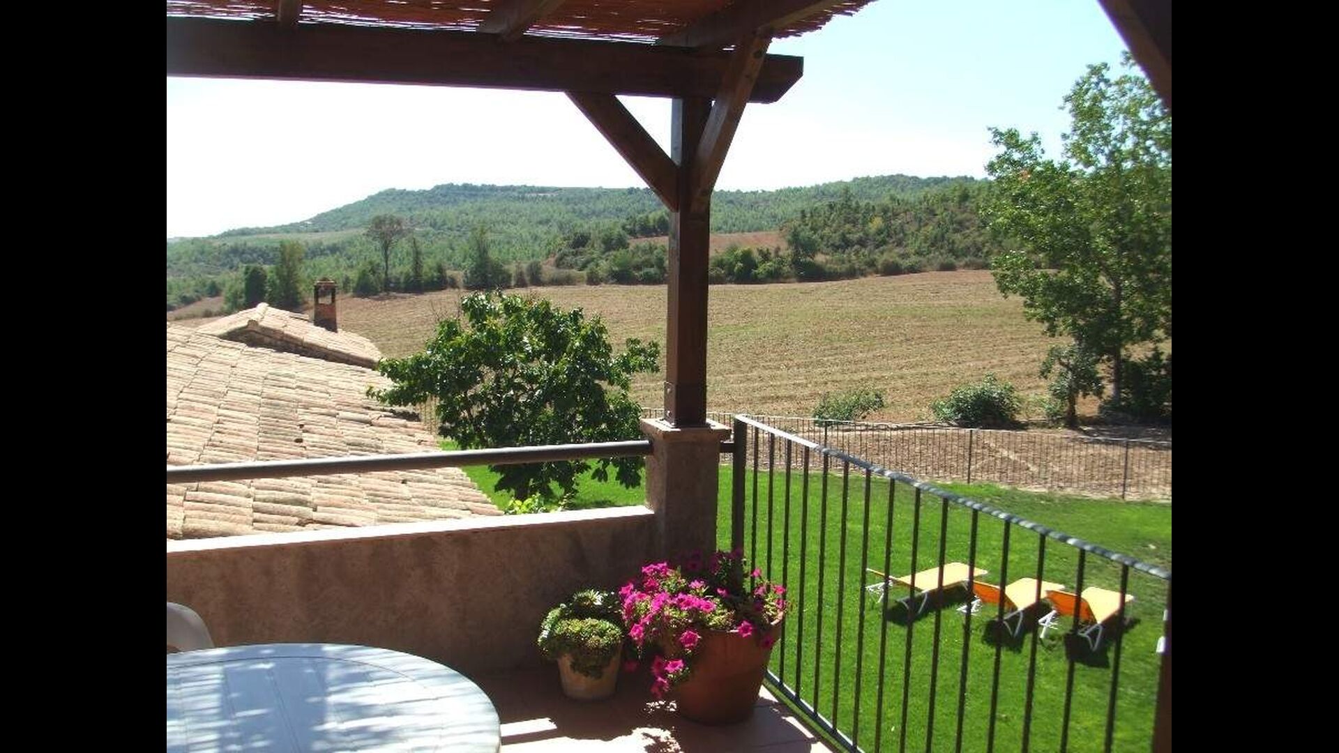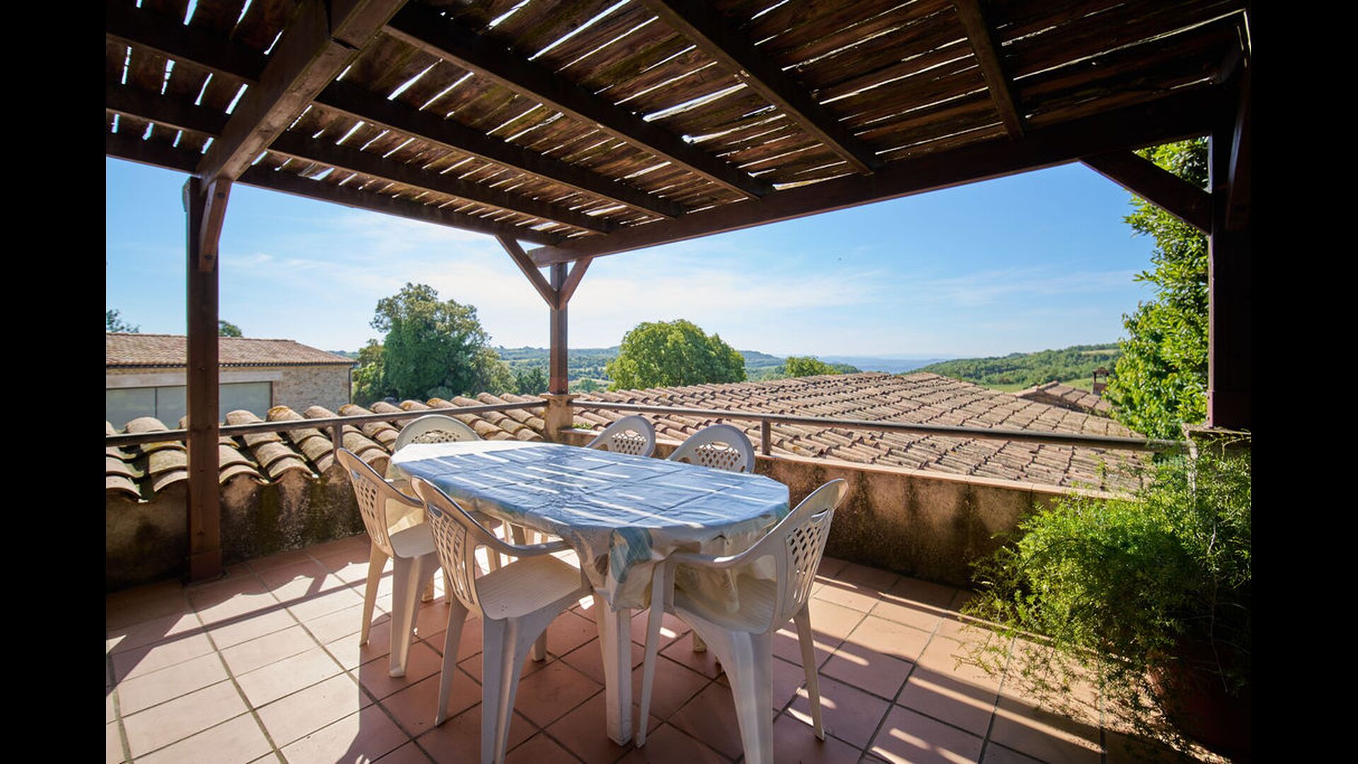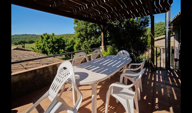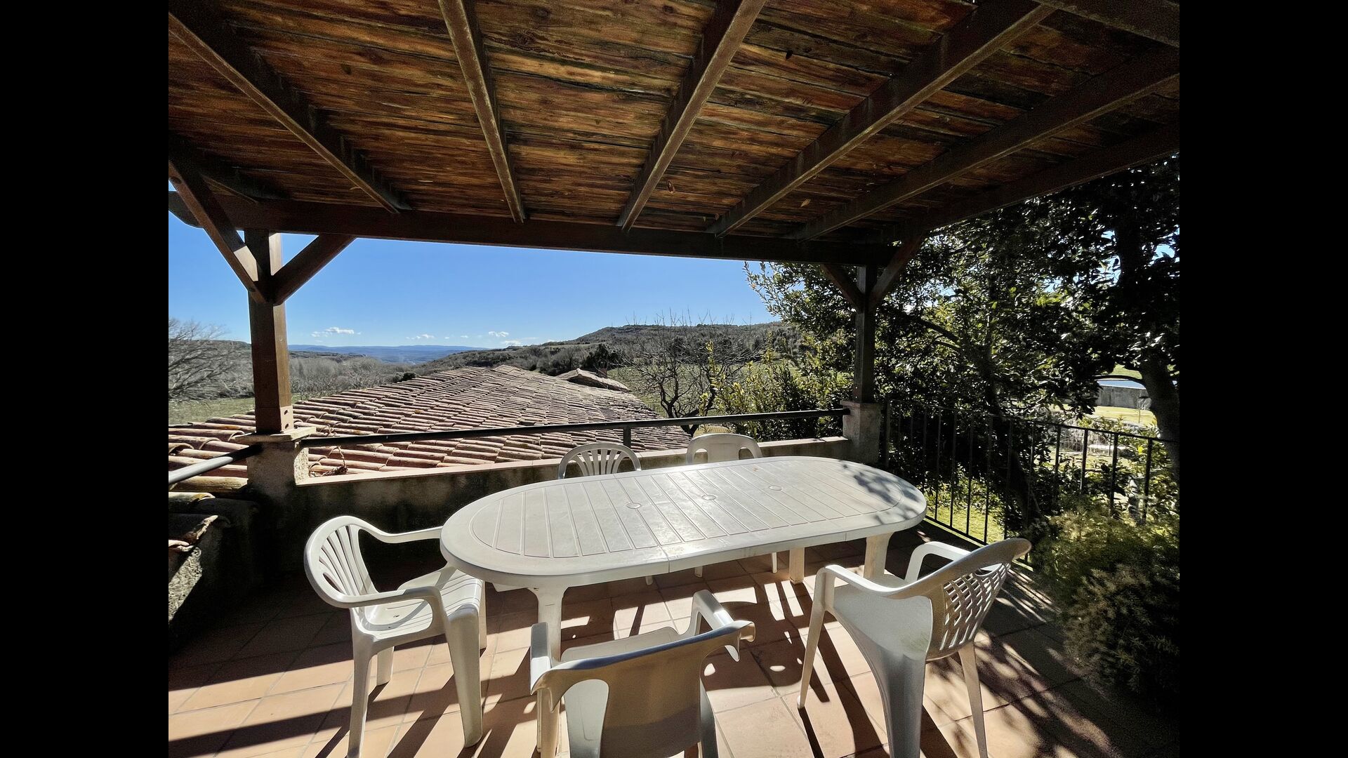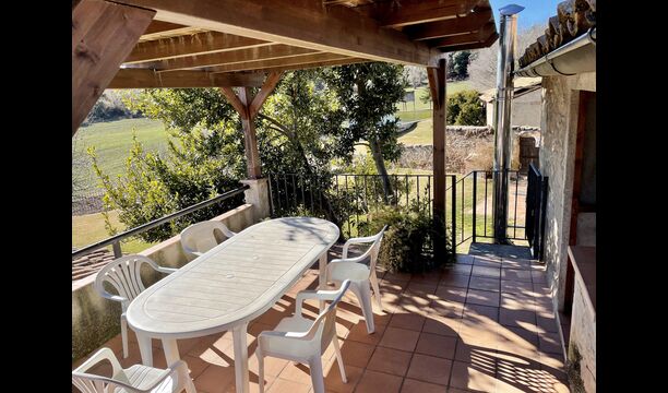 Fra køkkenet er der direkte udgang til en overdækket terrasse i første sals højde, med fantastisk udsigt over landskabet med Pyrenæerne i baggrunden. Terrassen har spisebord og er et oplagt sted at nyde sine måltider.