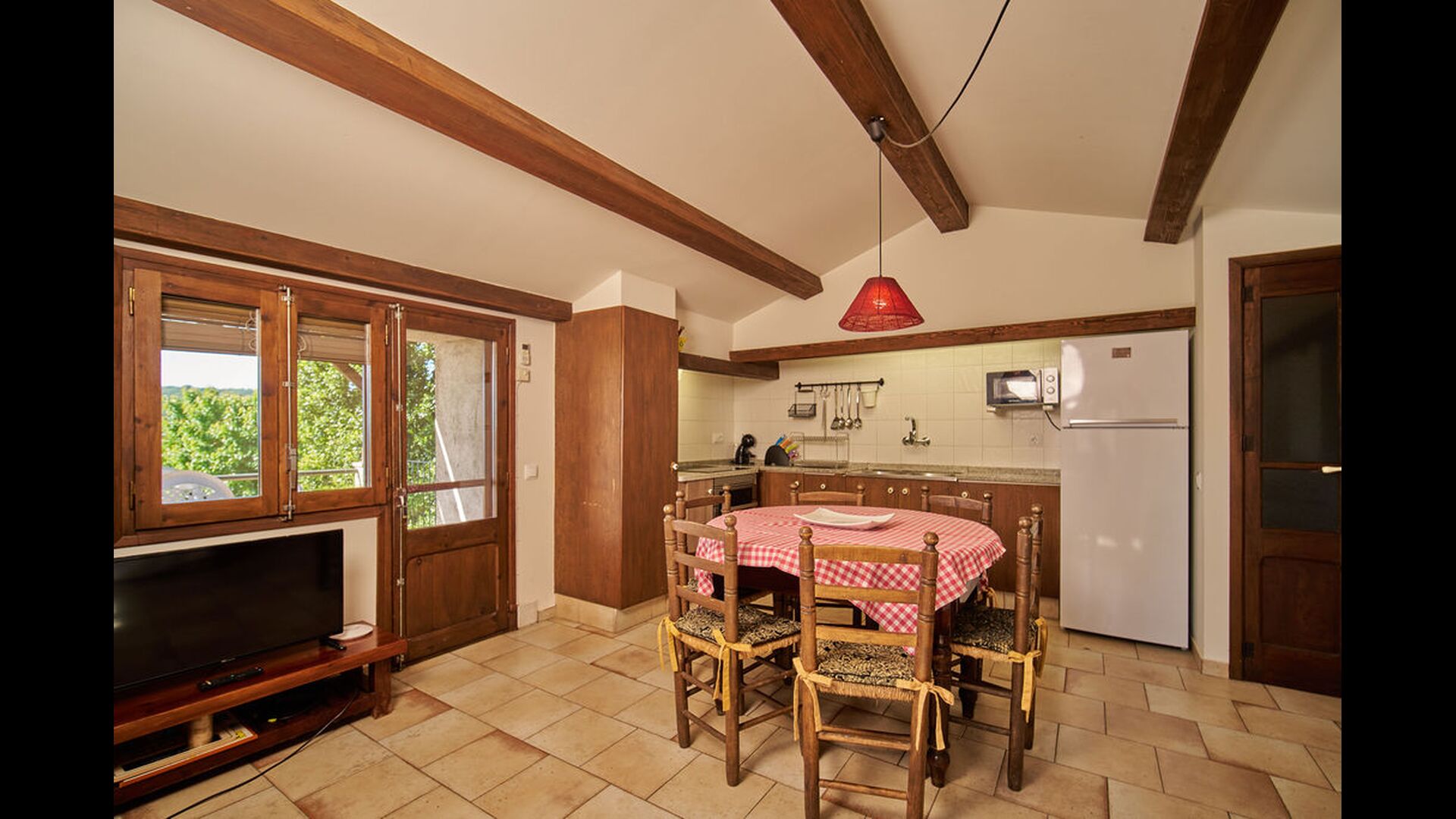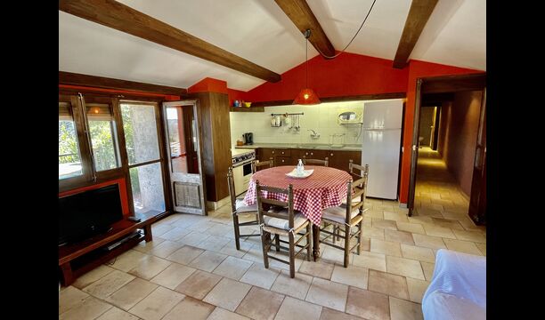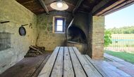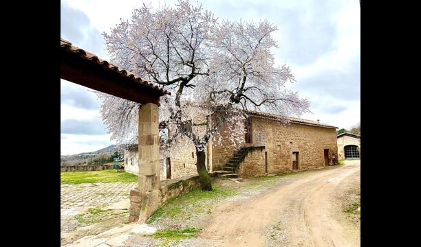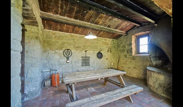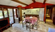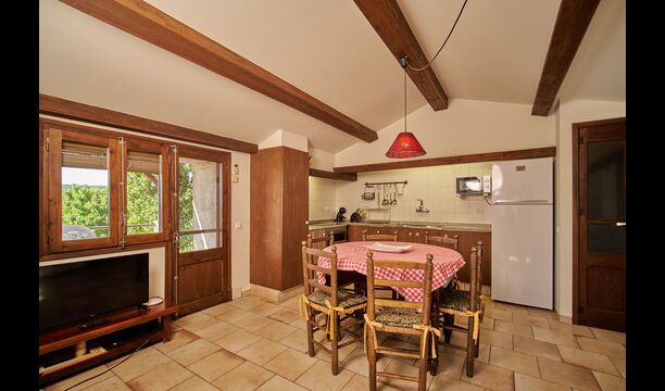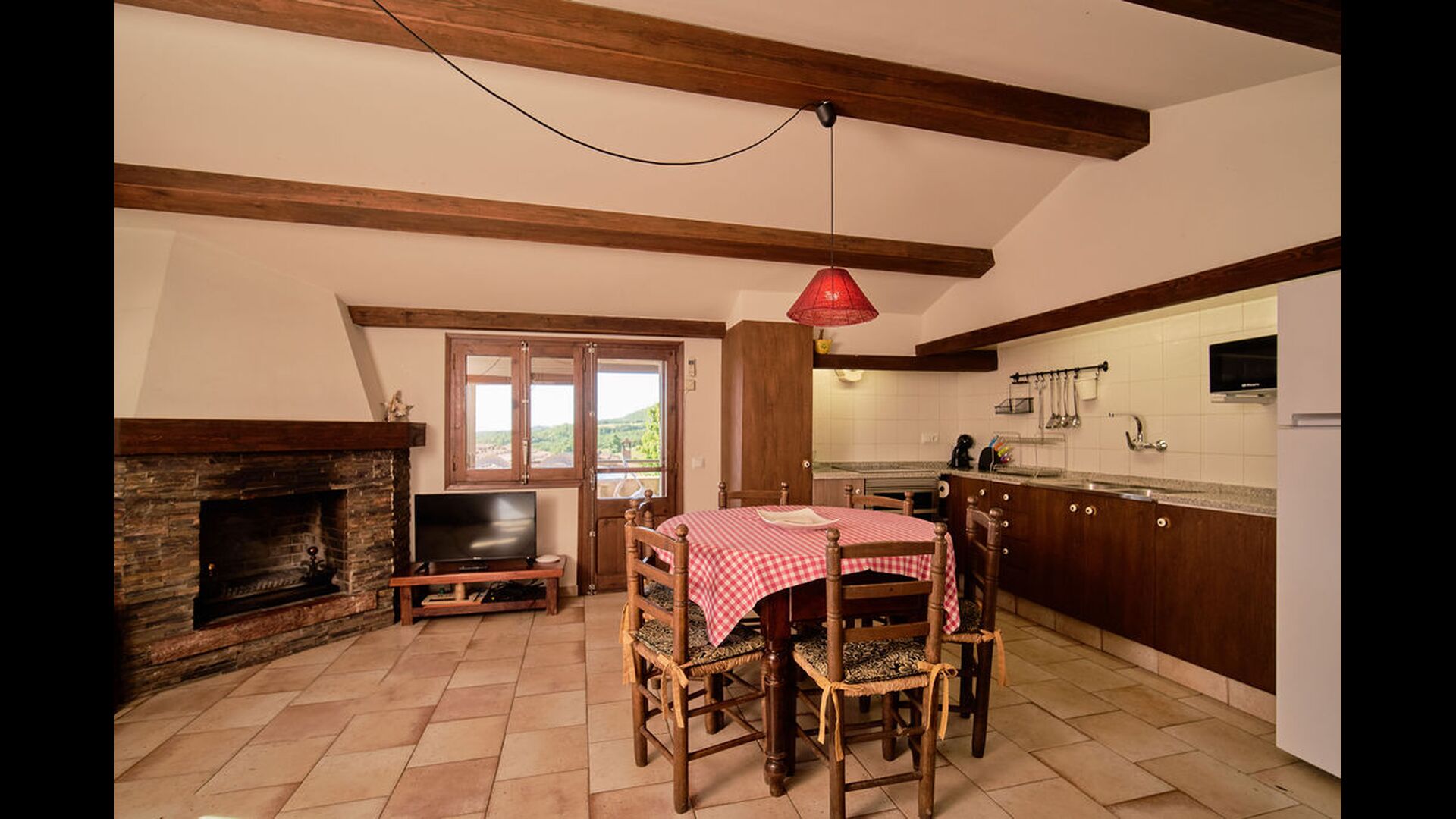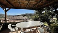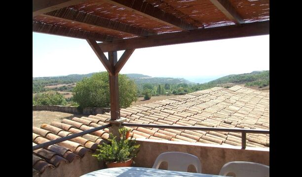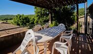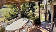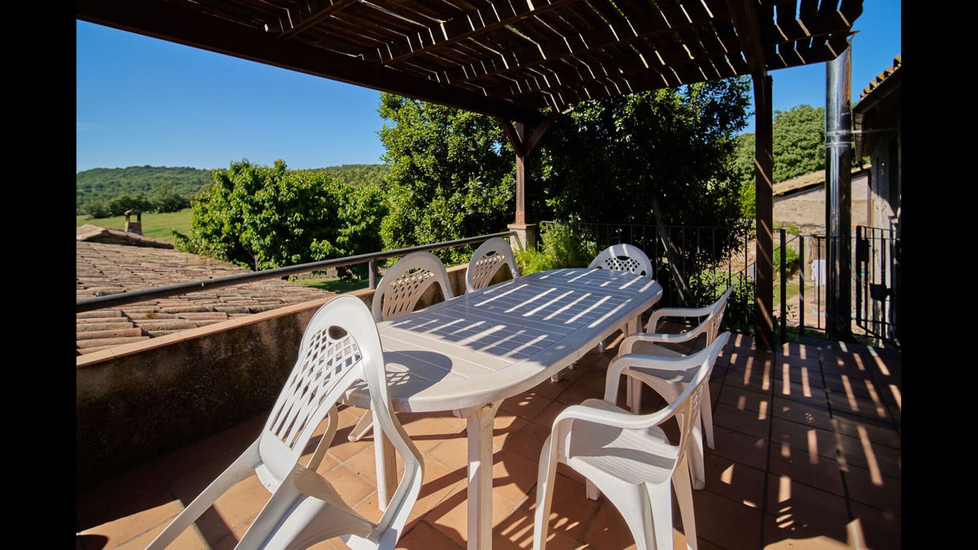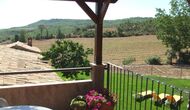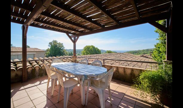 Fra køkkenet er der direkte udgang til en overdækket terrasse i første sals højde, med fantastisk udsigt over landskabet med Pyrenæerne i baggrunden. Terrassen har spisebord og er et oplagt sted at nyde sine måltider.