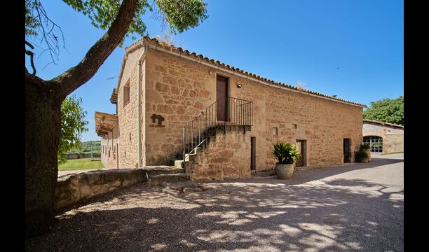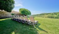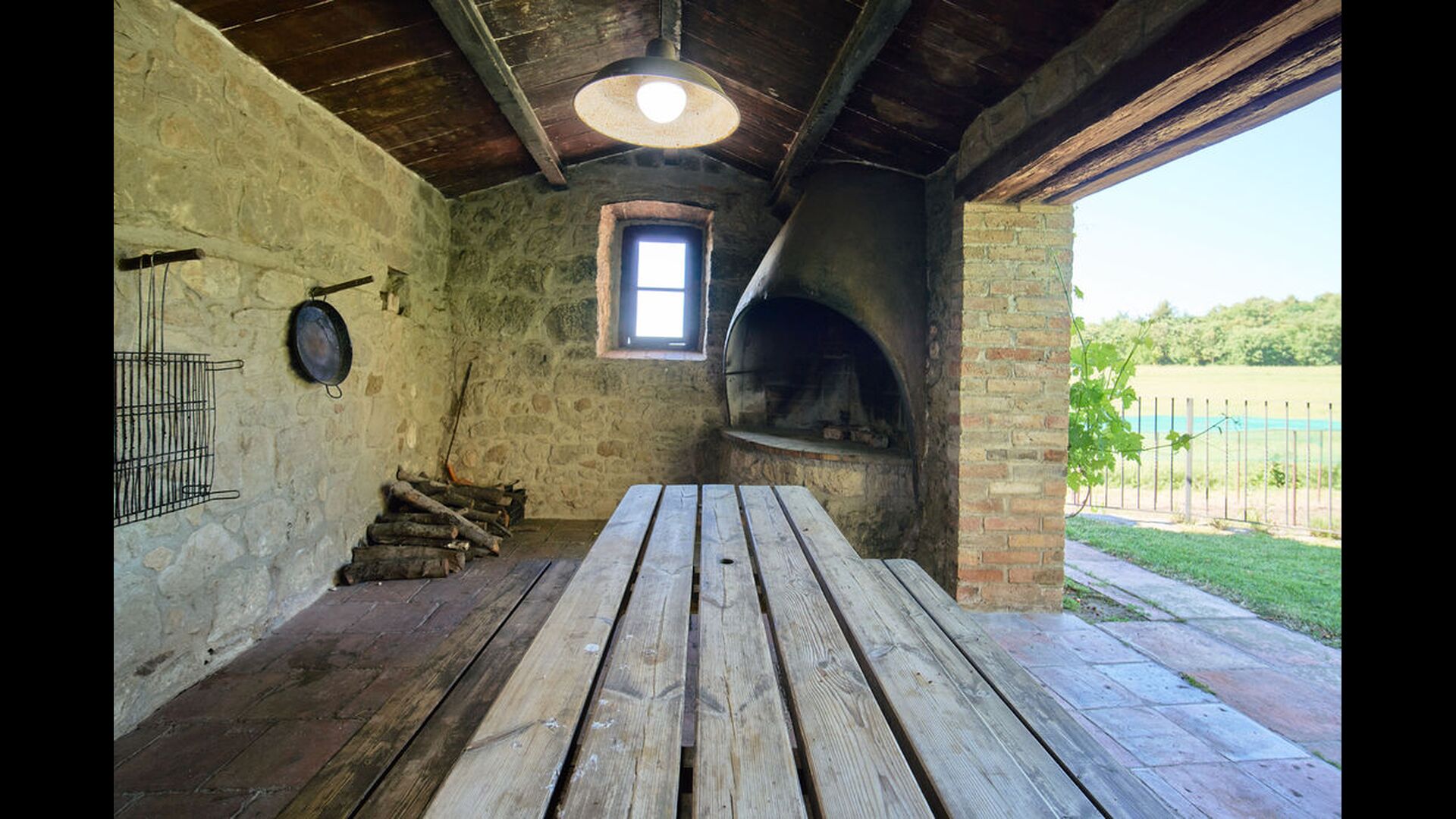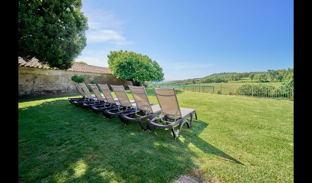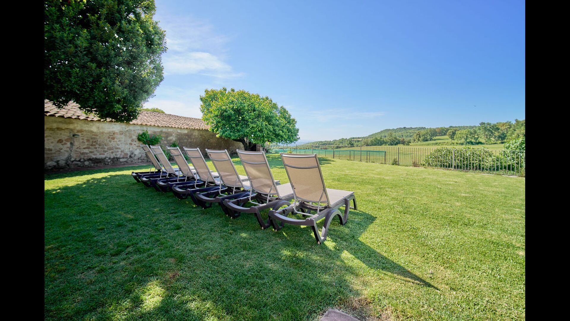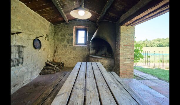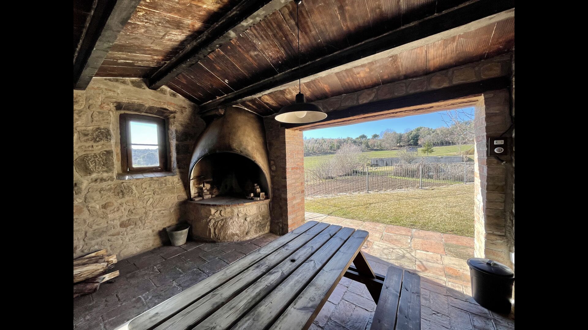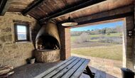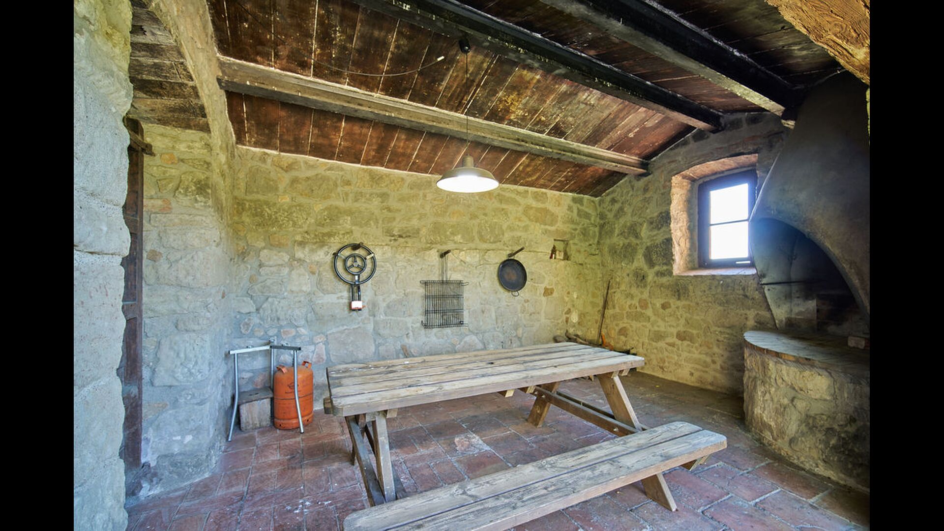 Fra køkkenet er der direkte udgang til en overdækket terrasse i første sals højde, med fantastisk udsigt over landskabet med Pyrenæerne i baggrunden. Terrassen har spisebord og er et oplagt sted at nyde sine måltider.