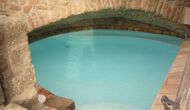 Fra terrassen er der en trappe ned til den børnevenlige have med gyngestativ og mulighed for boldspil. Swimmingpoolen, som har hegn til beskyttelse af mindre børn, ligger et par trin nede, og på smukkeste vis bygget ind i en naturlig klippe, som altid har været på stedet. Tag en dukkert, eller sæt dig på bænken i vandet og få lidt aqua-massage. Nederst i haven er der en anden terrasse med bord og grill.