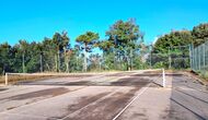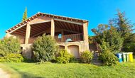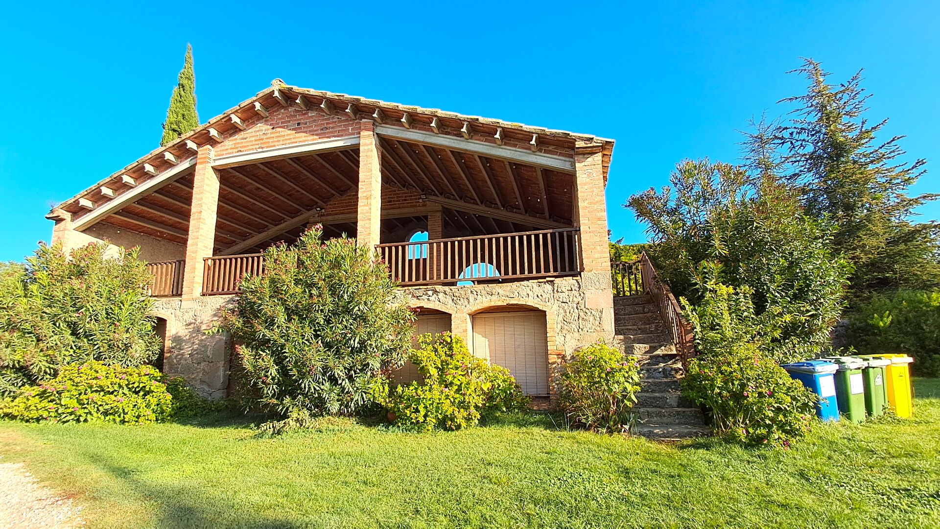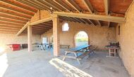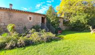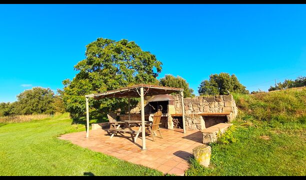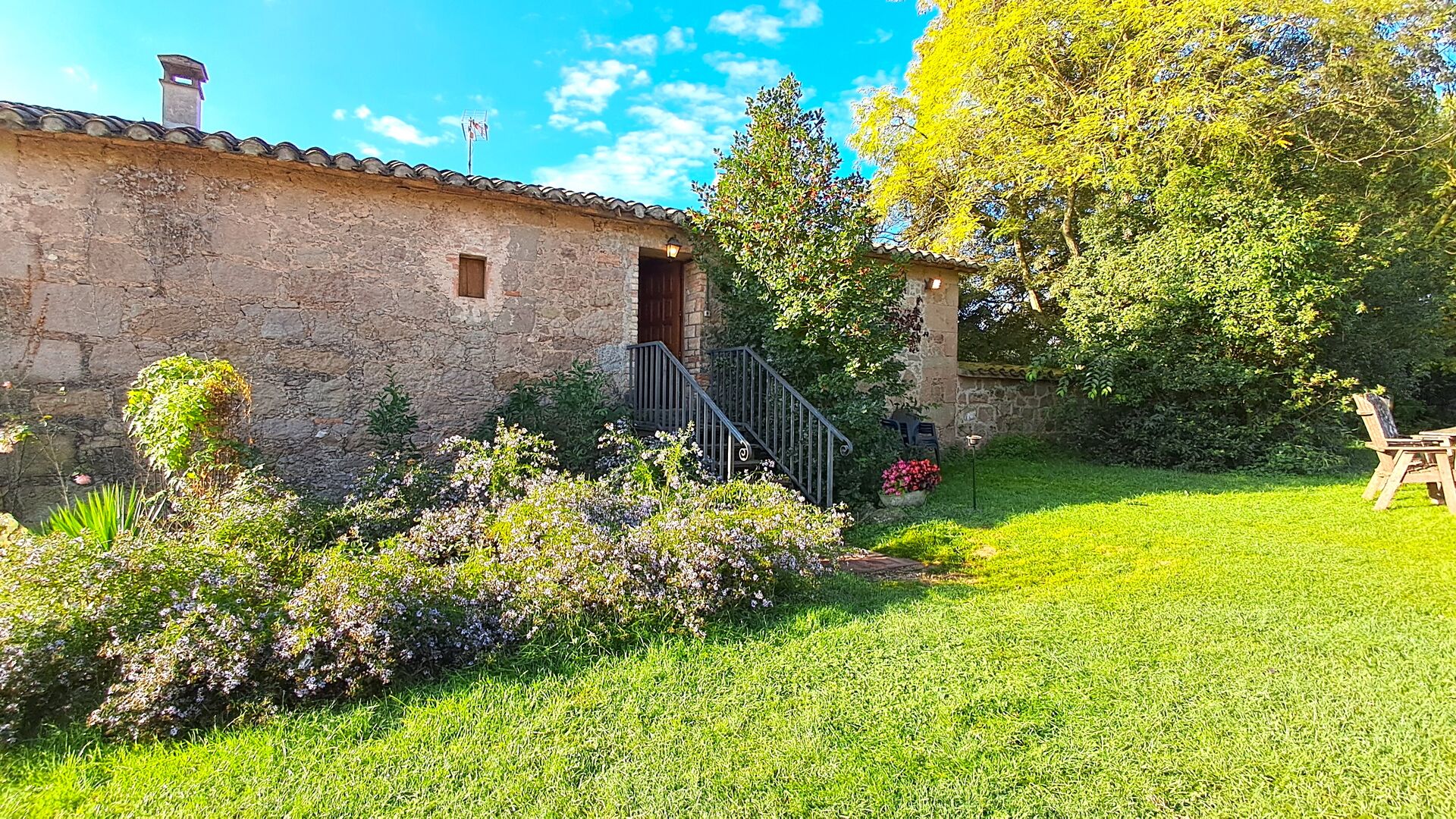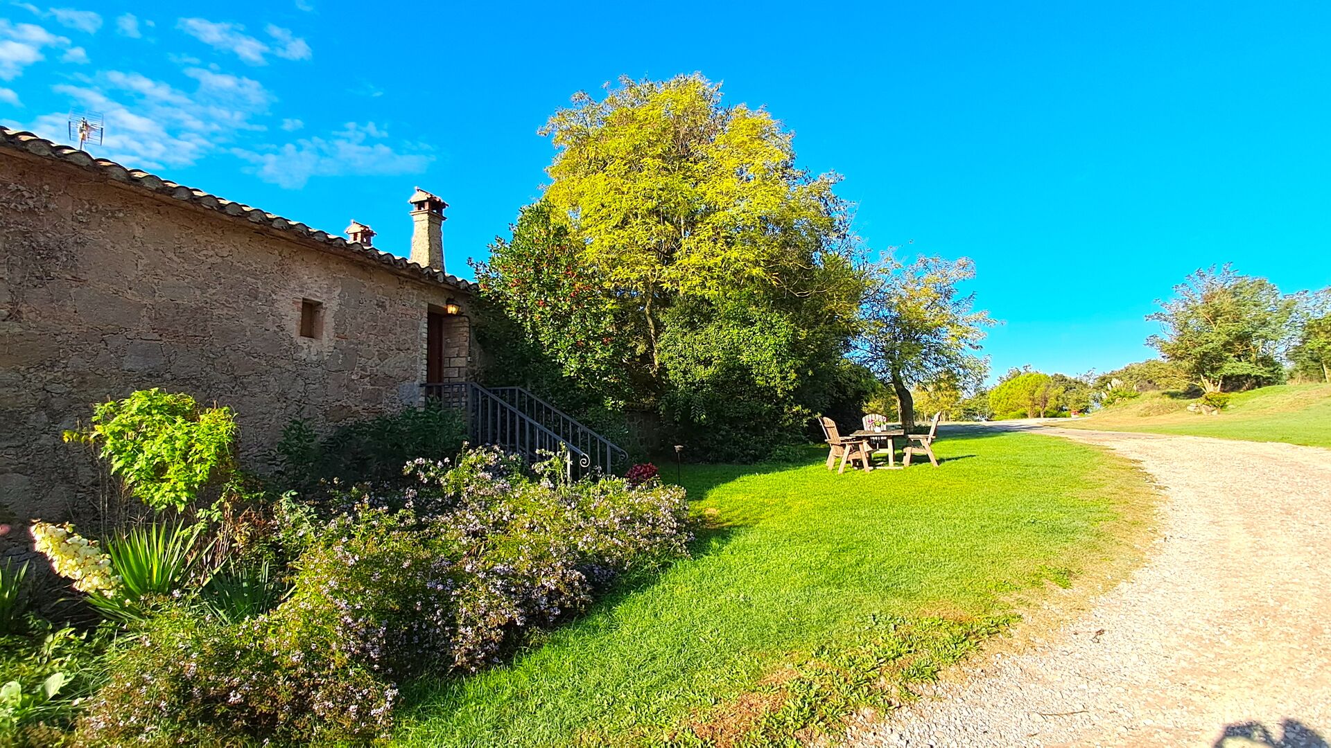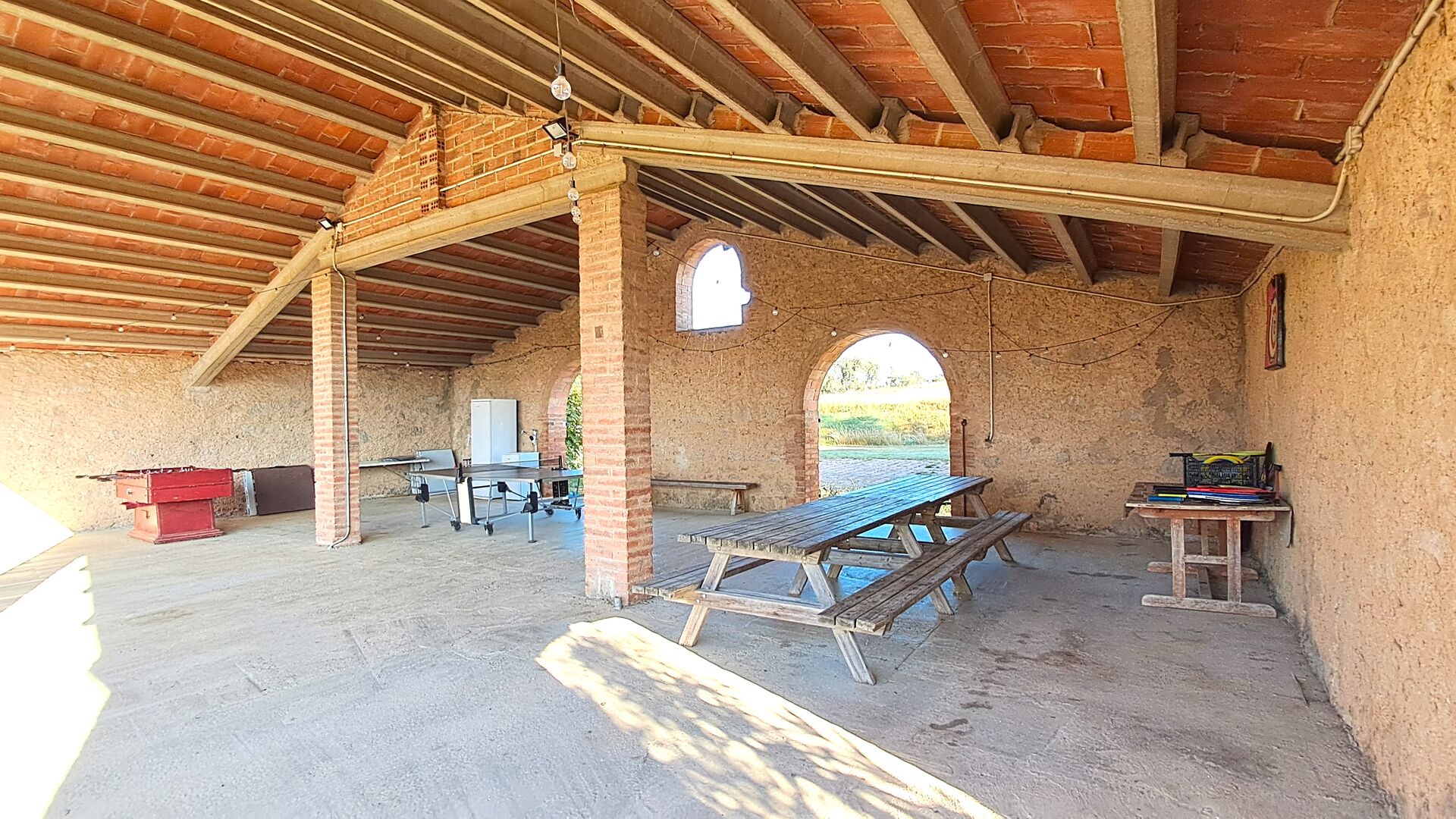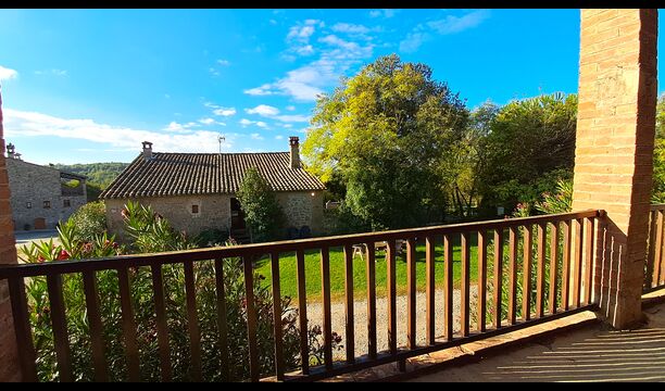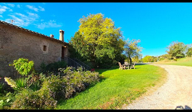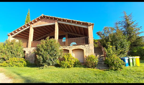 Udenfor er huset omgivet af græsplæne og træer. Overfor huset ligger terrassen med aktivitetsområde er ideel hvis man vil spise udendørs, og der er en smuk udsigt over det catalanske landskab. På den ene side af huset ligger fodboldbanen og tennisbanen, som er med asfalt