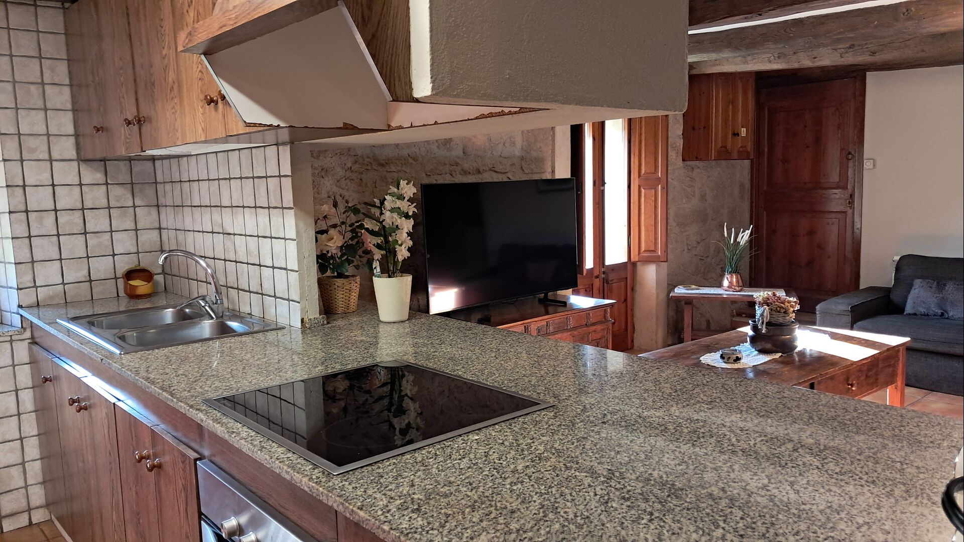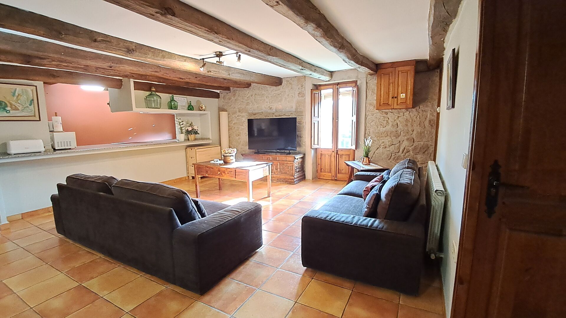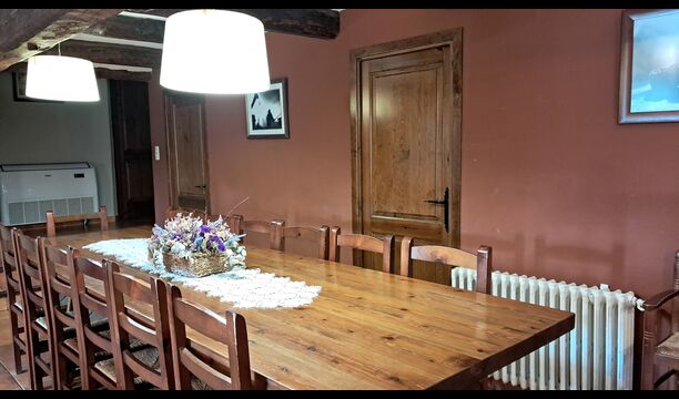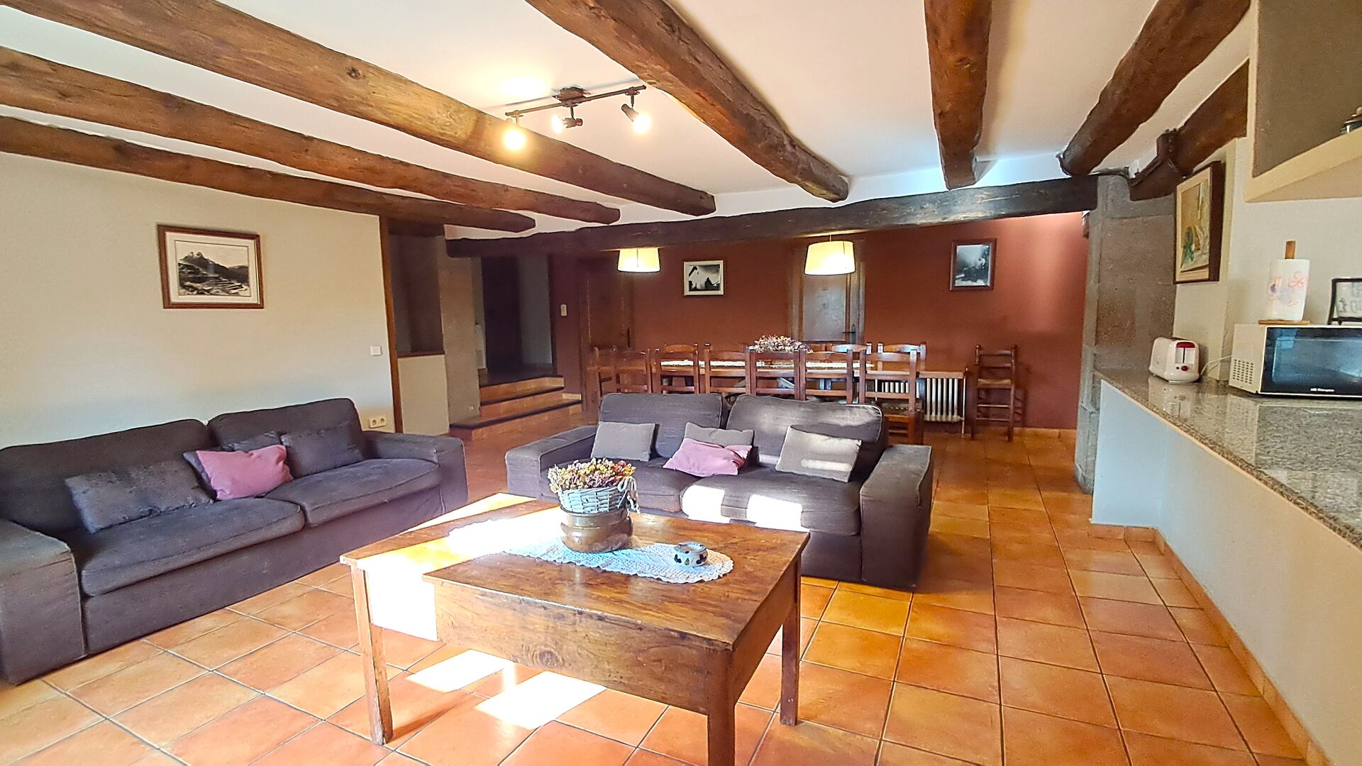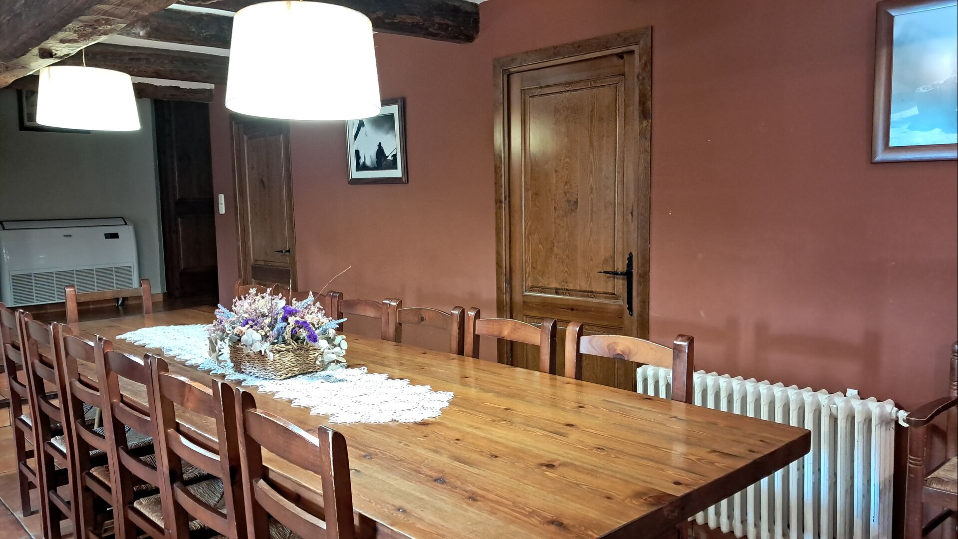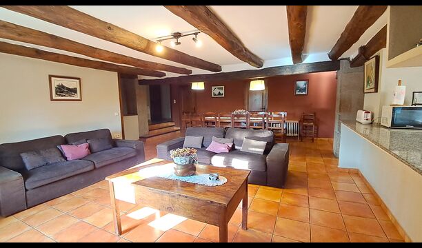 Når man træder ind af den smukke hoveddør, kommer man først til et stort alrum med åbent køkken, sofahjørne med TV og musikanlæg og pejs, samt et langt spisebord med plads til alle. I den anden ende er der adgang til de 6 dobbeltværelser, 4 med enkeltsenge og 2 med dobbeltsenge. Der er fire badeværelser med badekar eller brusekabine.