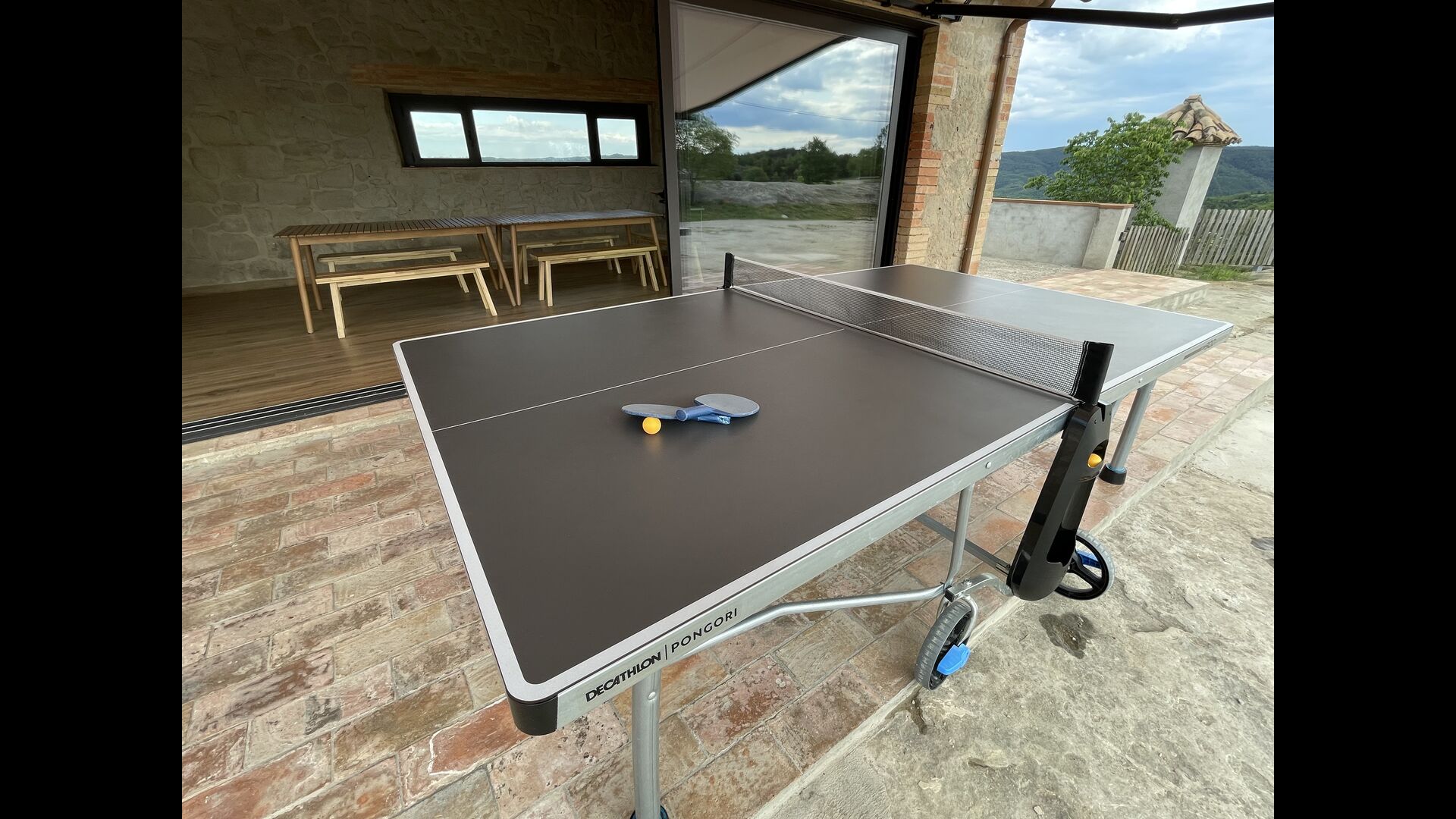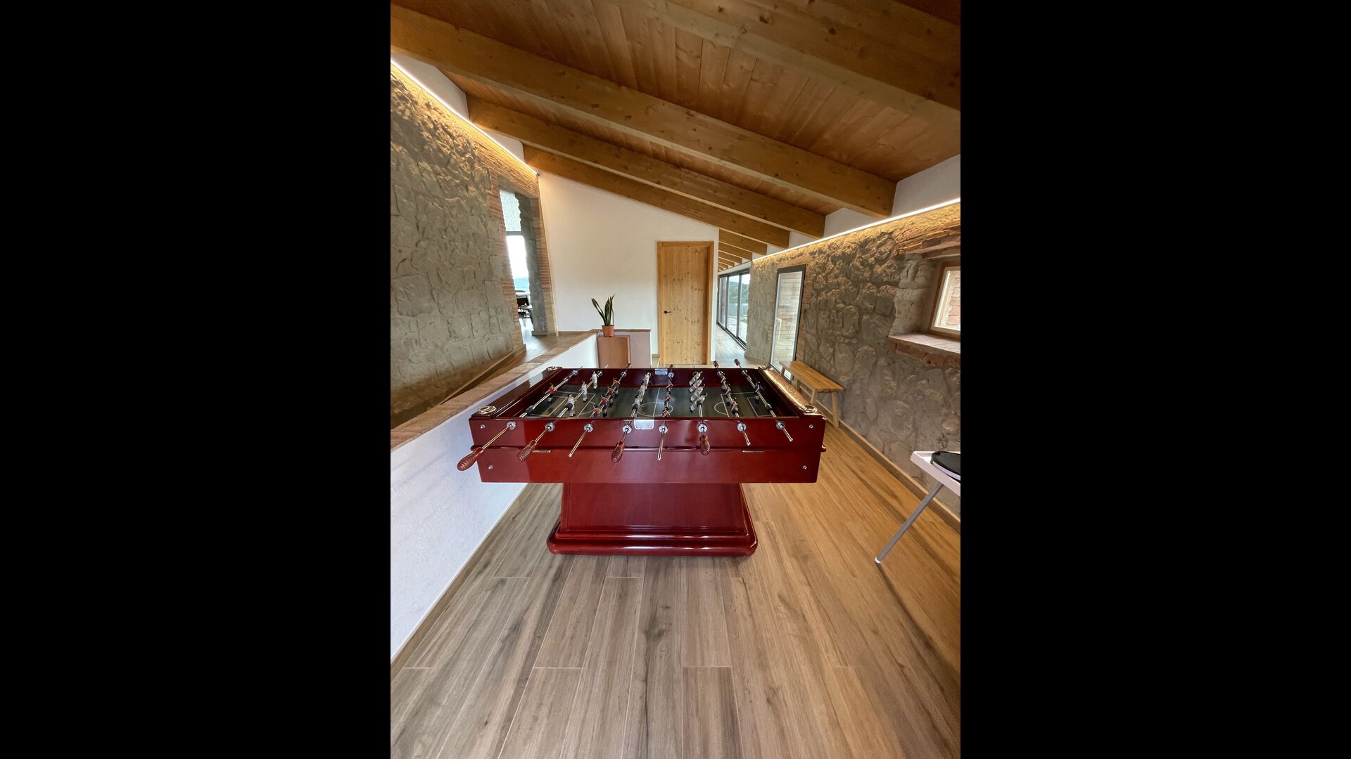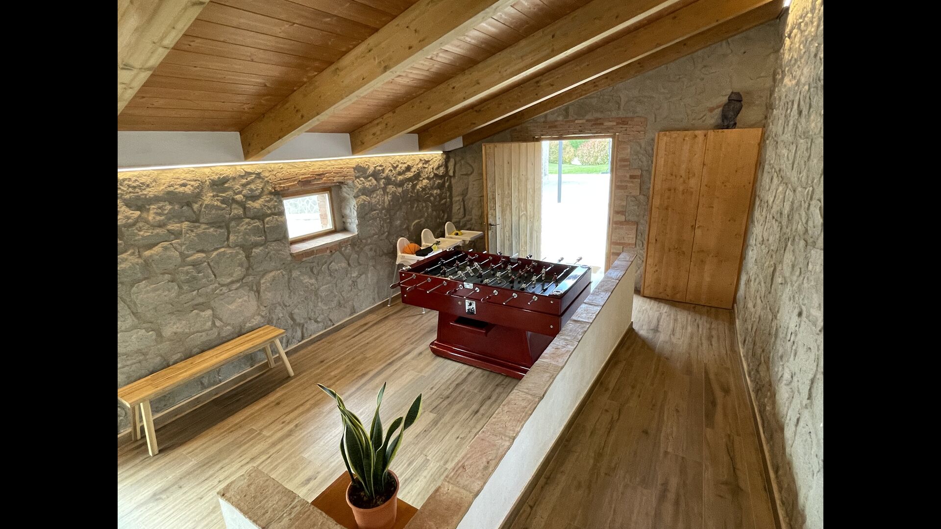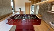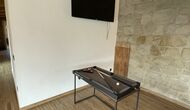 Når du kommer ind fra jordniveau, finder du en bordfodbold-opstilling og et badeværelse. Også i stueetagen finder du et stort middagsbord, en grill-opstilling (med en muret grill), et vægmonteret fladskærms-tv og et lille poolbord.