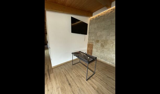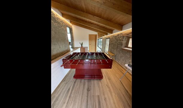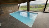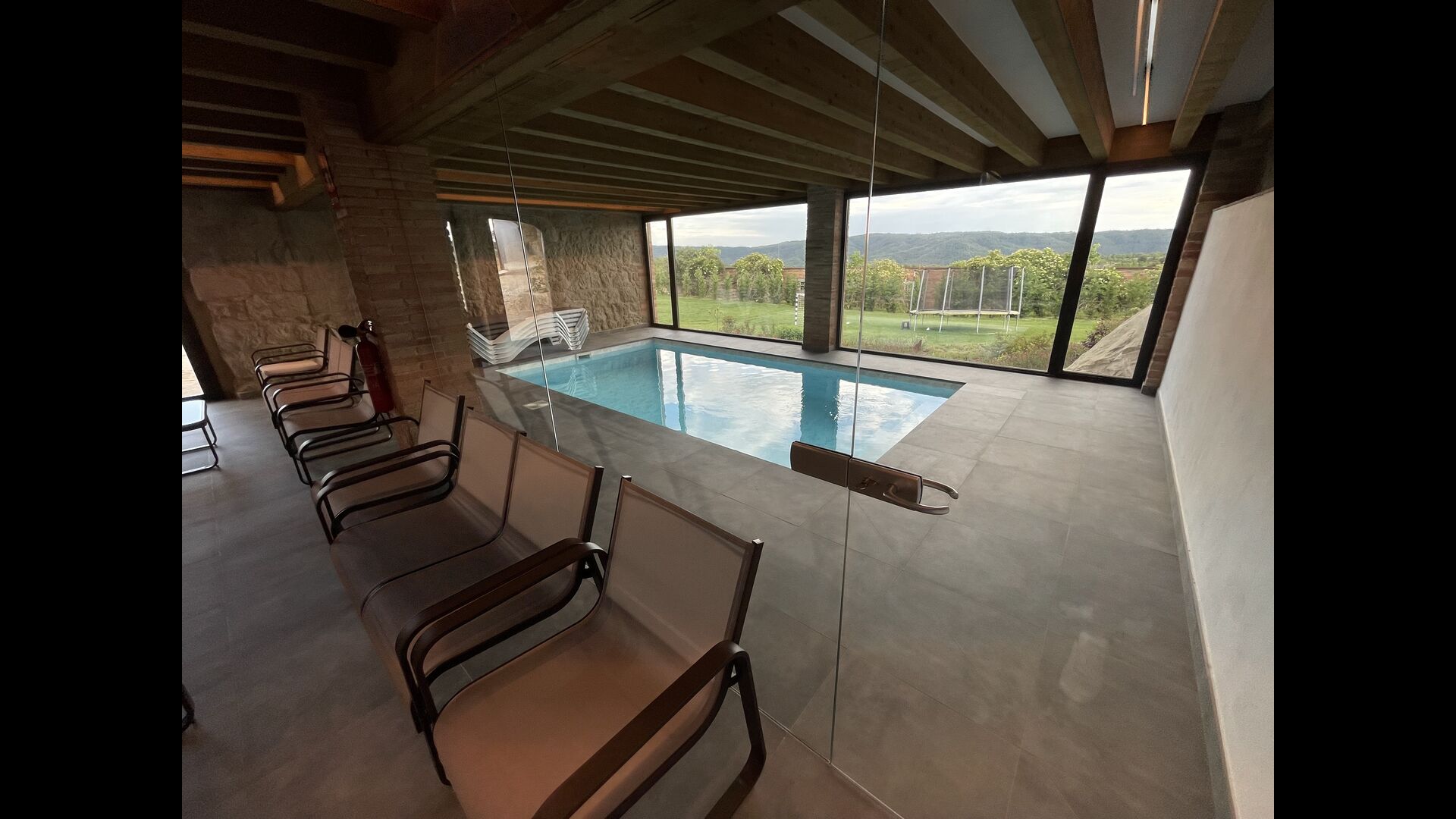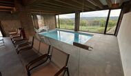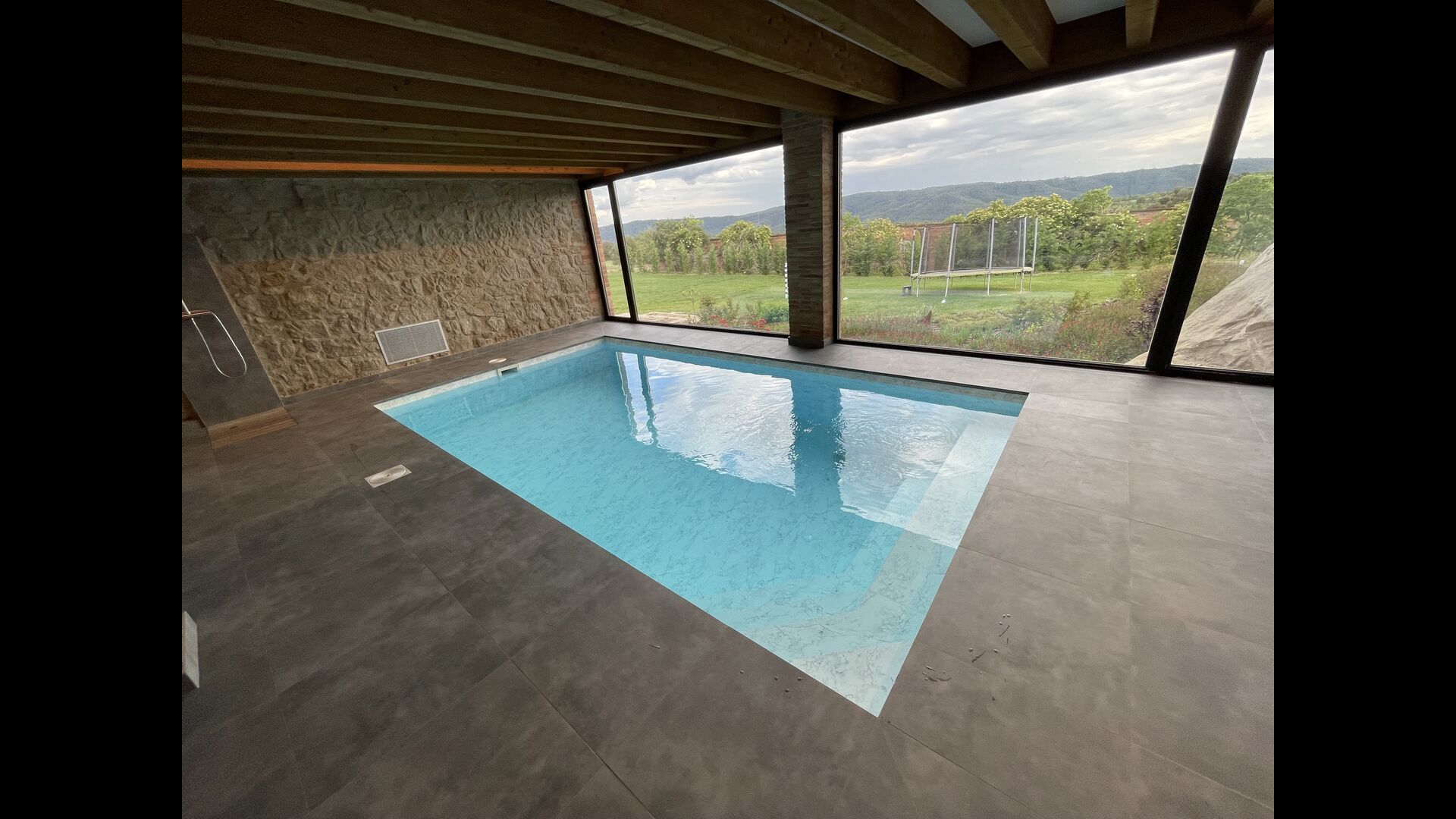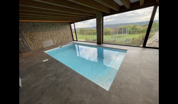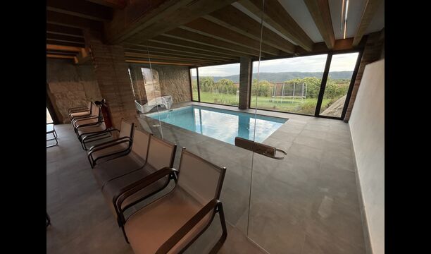 Når man kommer ned ad trappen fra stueetagen og ind i kælderen, afsløres et loungeområde sig med flere stole og en væg-monteret fladskærms-tv. Lige bag loungen er den indendørs swimmingpool – de to områder er adskilt af en glasvæg. Poolen er opvarmet og er 6 meter lang og 3 meter bred. Udover glasset, der adskiller longuen og swimmingpoolområdet, er der også store vinduer fra gulv til loft i rummet ud mod ejendommens have, så du kan kigge ud over fodboldbanen og de vidunderlige omgivelser i nærheden og udenfor fra komforten af det afslappende vand i poolen.