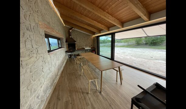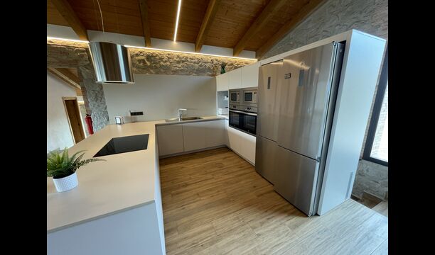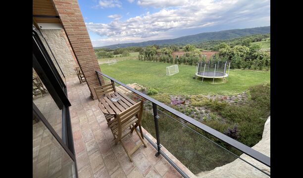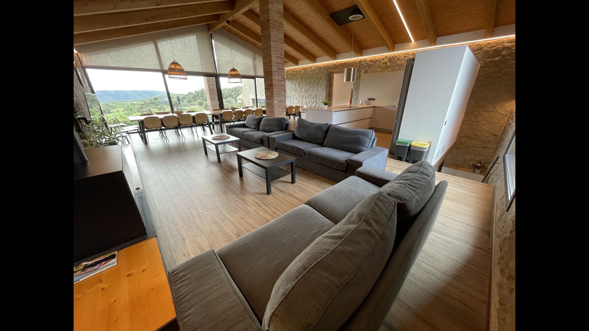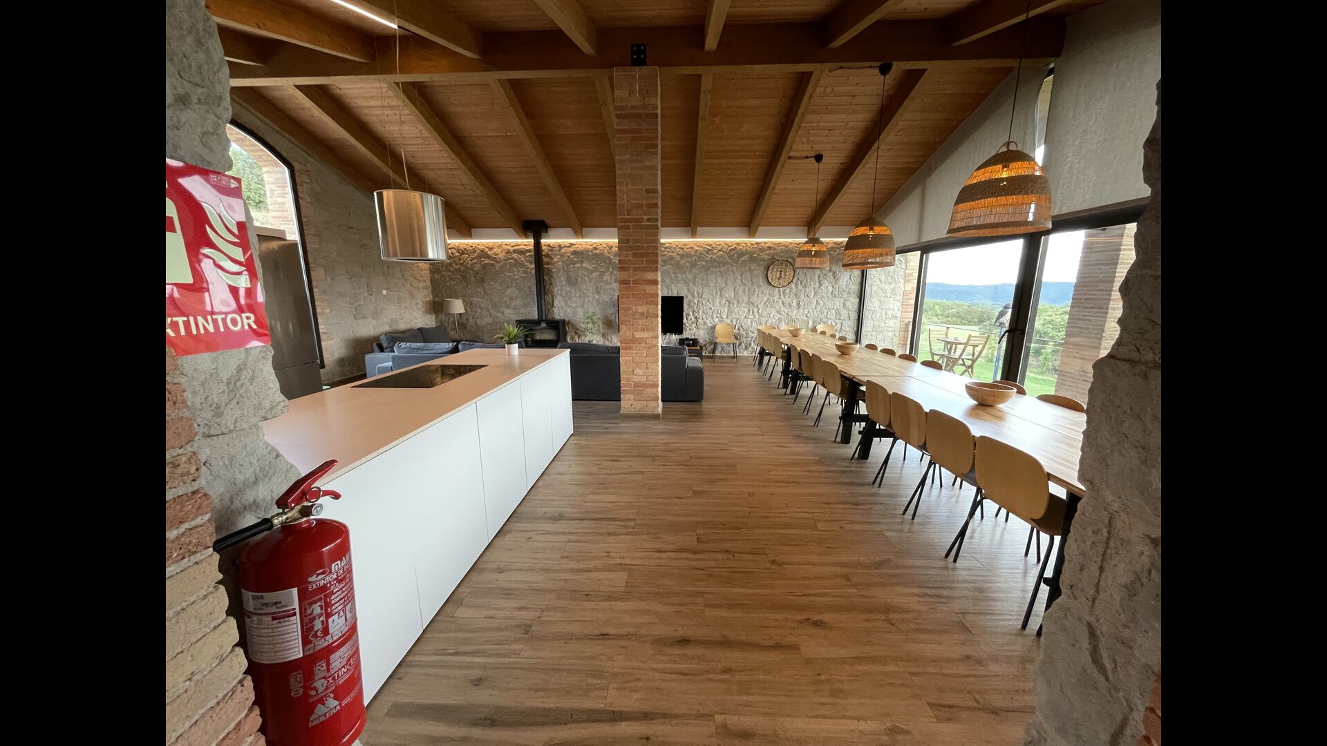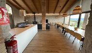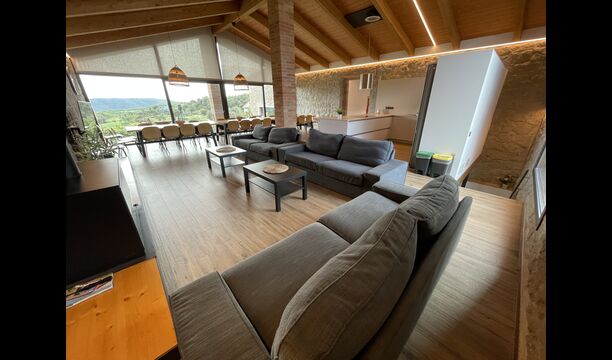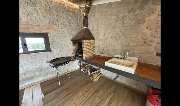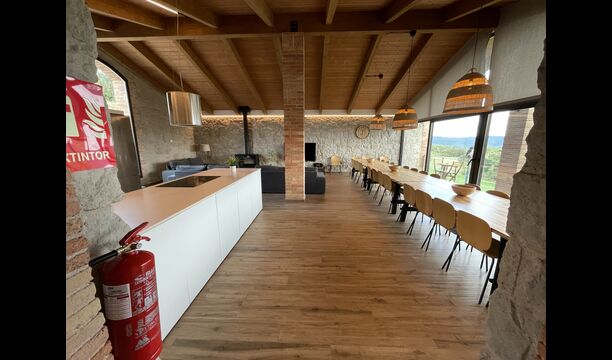 Første sal er lidt forhøjet over stueetagen. Når du træder ind, vil du finde et stort, rummeligt og hyggeligt værelse, der kombinerer et luksus-kvalitetskøkken på din venstre side med 2 køleskabe, ovne, et komfur strong og alt andet tilbehør, redskaber og hjælpemidler passer til et moderne, udsøgt køkken. På din højre side er et meget stort middagsbord, der kan passe til mange mennesker. Med et gulv-til-loft vinduer med udsigt over haven nedenfor, vil du have en fremragende udsigt, mens du spiser middag med venner og familie, spiller kort/brætspil eller nyder samtaler om natten over en flaske lækker catalansk vin. Hvis du ønsker at nyde udsigten under friluft, er der også en vidunderlig stor altan med små sofaborde og stole. Sidst men ikke mindst har rummet også et stort, komfortabelt sofahjørne med et tv og en pejs. Hvis du vil hvile benene lidt, eller nyde en god film med dine rejsekammerater, er sofa det perfekte sted at gøre det.