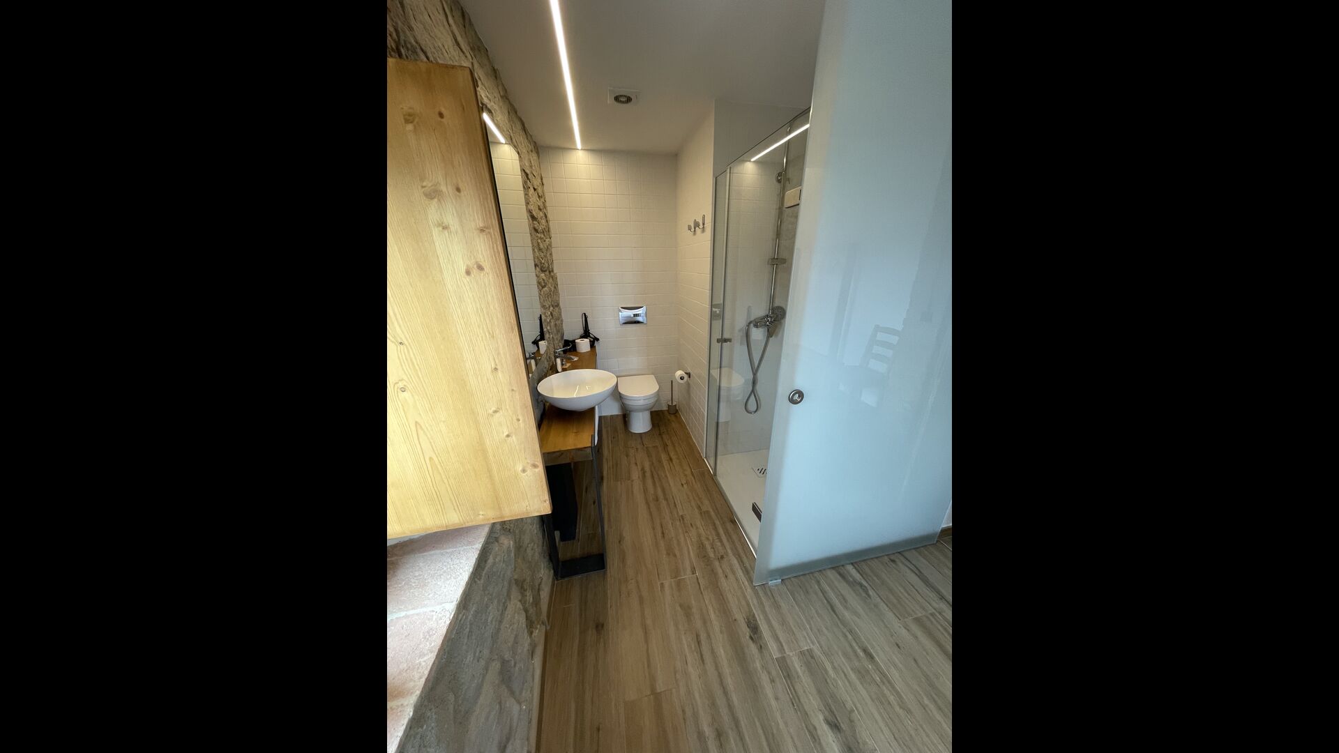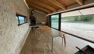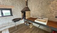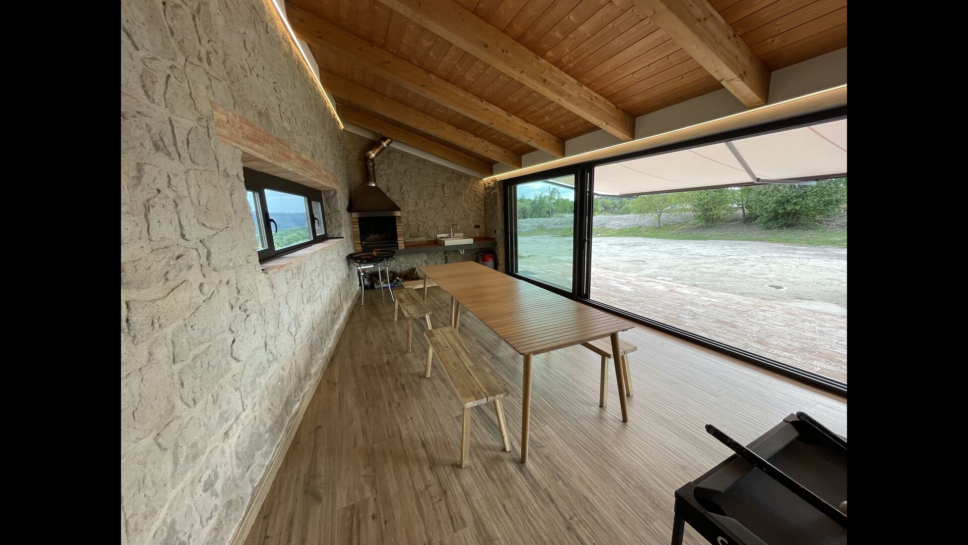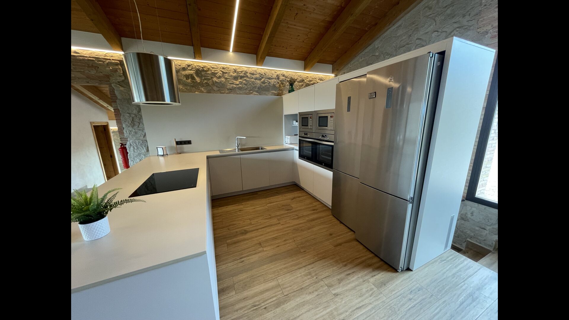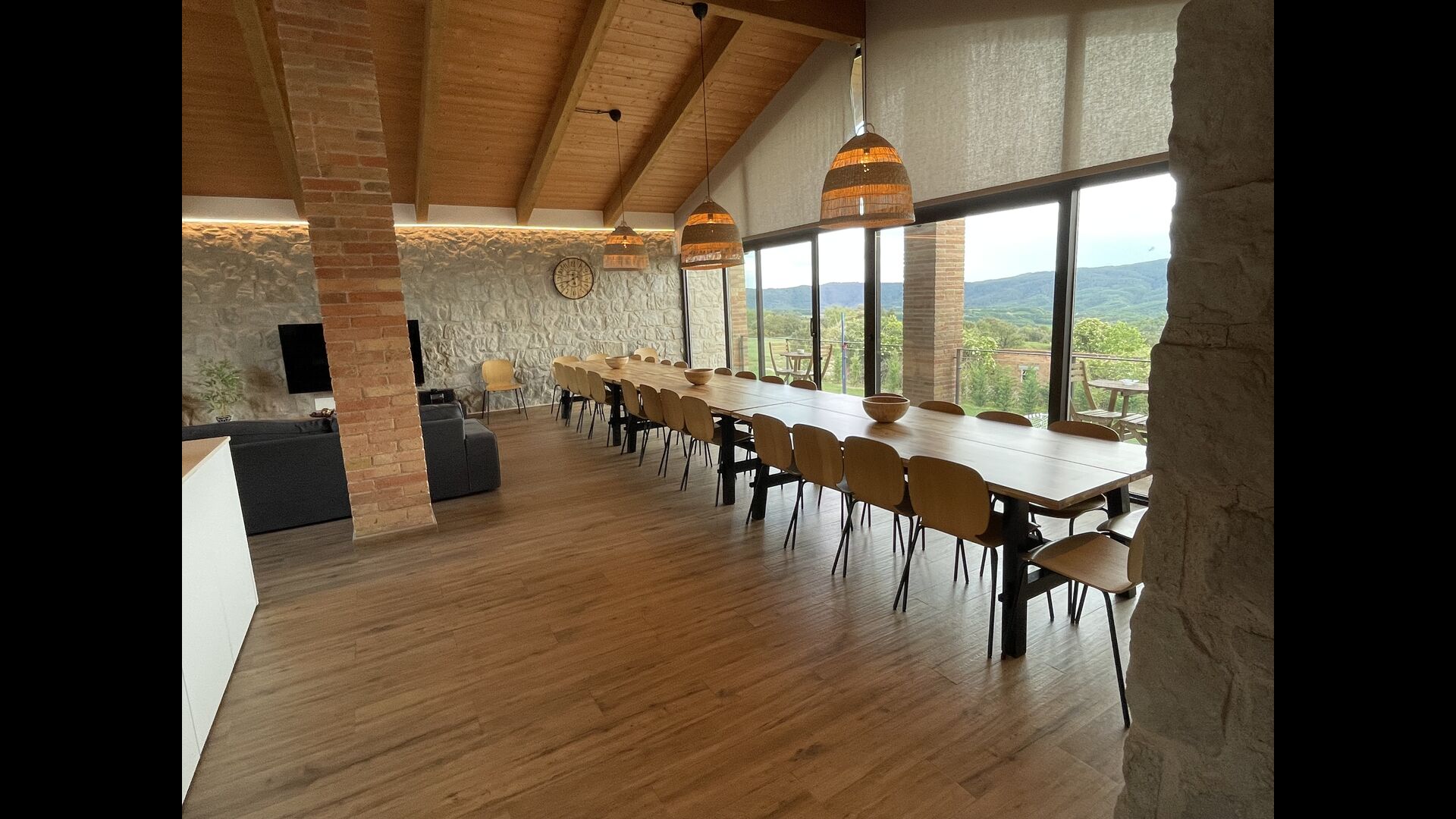 Første sal er lidt forhøjet over stueetagen. Når du træder ind, vil du finde et stort, rummeligt og hyggeligt værelse, der kombinerer et luksus-kvalitetskøkken på din venstre side med 2 køleskabe, ovne, et komfur strong og alt andet tilbehør, redskaber og hjælpemidler passer til et moderne, udsøgt køkken. På din højre side er et meget stort middagsbord, der kan passe til mange mennesker. Med et gulv-til-loft vinduer med udsigt over haven nedenfor, vil du have en fremragende udsigt, mens du spiser middag med venner og familie, spiller kort/brætspil eller nyder samtaler om natten over en flaske lækker catalansk vin. Hvis du ønsker at nyde udsigten under friluft, er der også en vidunderlig stor altan med små sofaborde og stole. Sidst men ikke mindst har rummet også et stort, komfortabelt sofahjørne med et tv og en pejs. Hvis du vil hvile benene lidt, eller nyde en god film med dine rejsekammerater, er sofa det perfekte sted at gøre det.