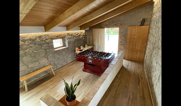 Casa Salvet er en førsteklasses, smuk, rummelig og aktivitetsrig catalansk ferieejendom af højeste kvalitet. Ejendommen kan huse op til 30 personer og består af et vidunderligt, renoveret hus, der bevarer sin klassiske charme, samtidig med at det er fyldt til randen med faciliteter og luksus som der forventes af et moderne feriehus. Sammen med selve huset har det en massiv have med en stor swimmingpool, en trampolin, bordtennis og en fodboldbane – for ikke at nævne en sublim, mindre bygning kaldet Porxoen, udstyret med grill-udstyr, en højkvalitets stue/køkkenområde med en terrasse med udsigt over fodboldbanen; og under køkkenet er der en dejlig indendørs swimmingpool – også med frit udsyn til fodboldbanen udenfor, samt de omkringliggende områder. Ved siden af det indendørs swimmingpoolområde er der en lounge med et fladskærms-tv.