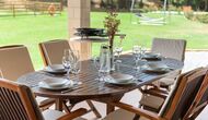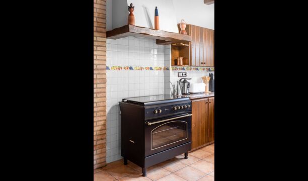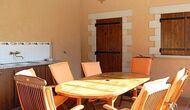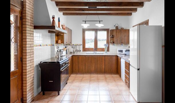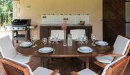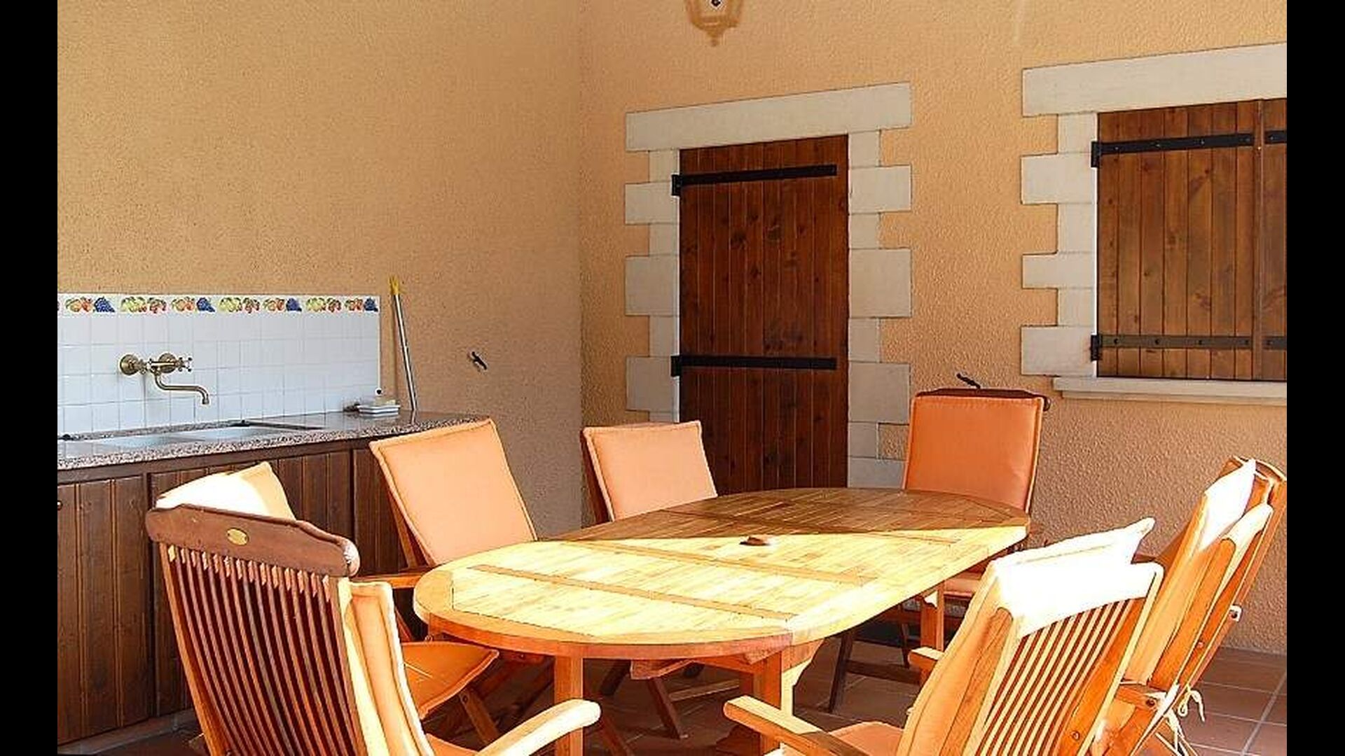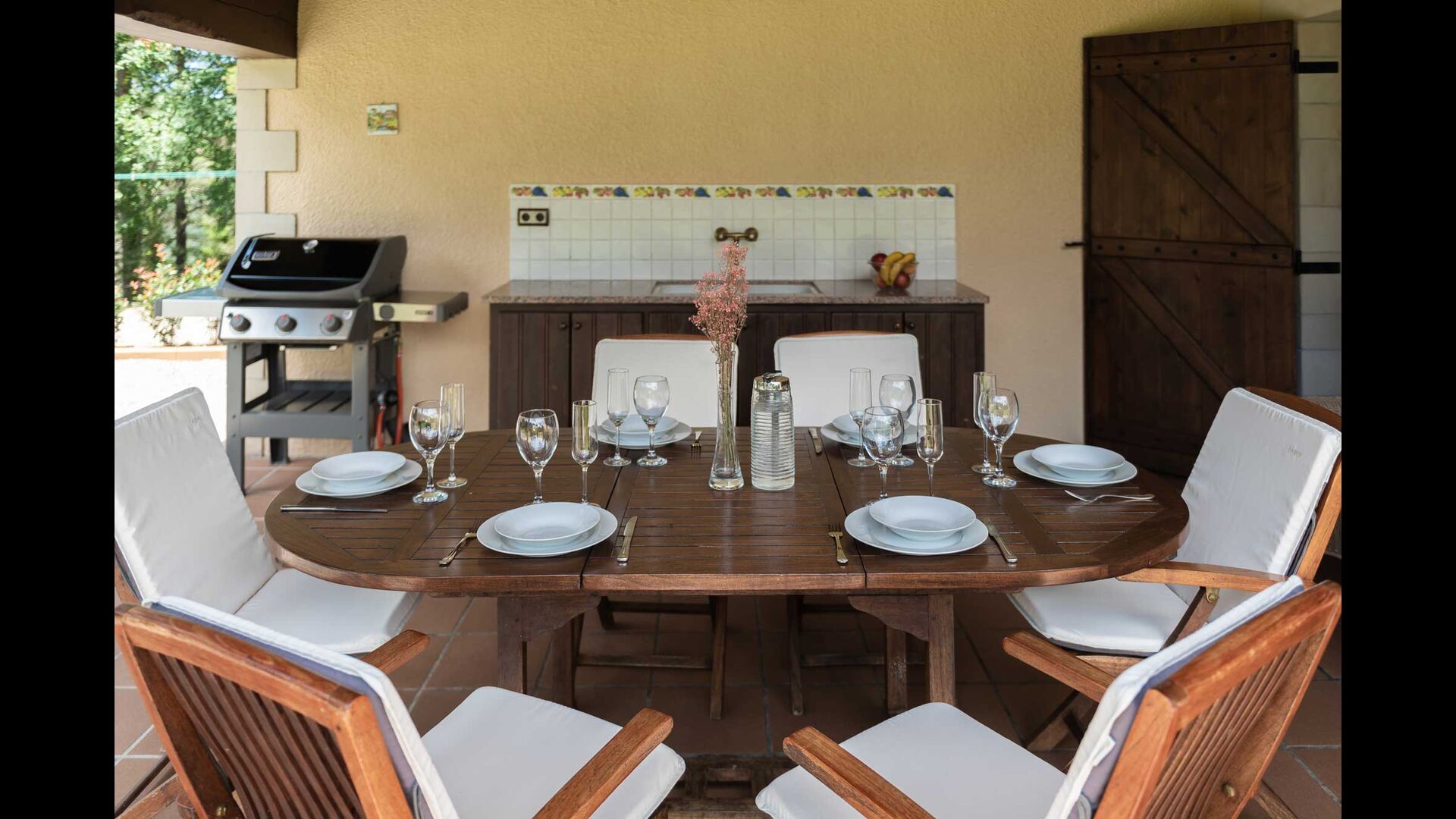 Fra køkkenet, som er veludstyret med blandt andet mikroovn, opvaskemaskine, køleskab, indbygget ovn mm. har man direkte adgang til terrasseområdet, hvor der desuden er et udekøkken med barbecue. Der er desuden et mindre rum med vaskemaskine, strygebræt og stor fryser.
