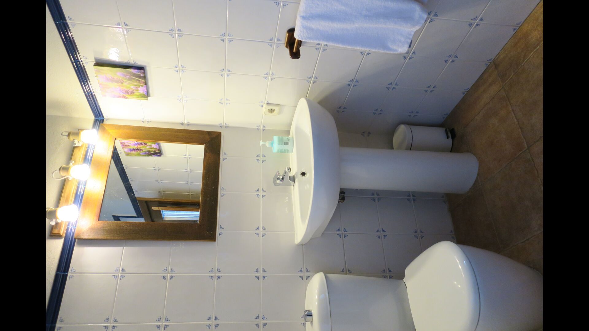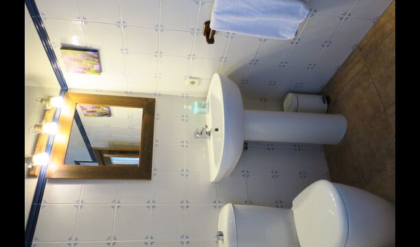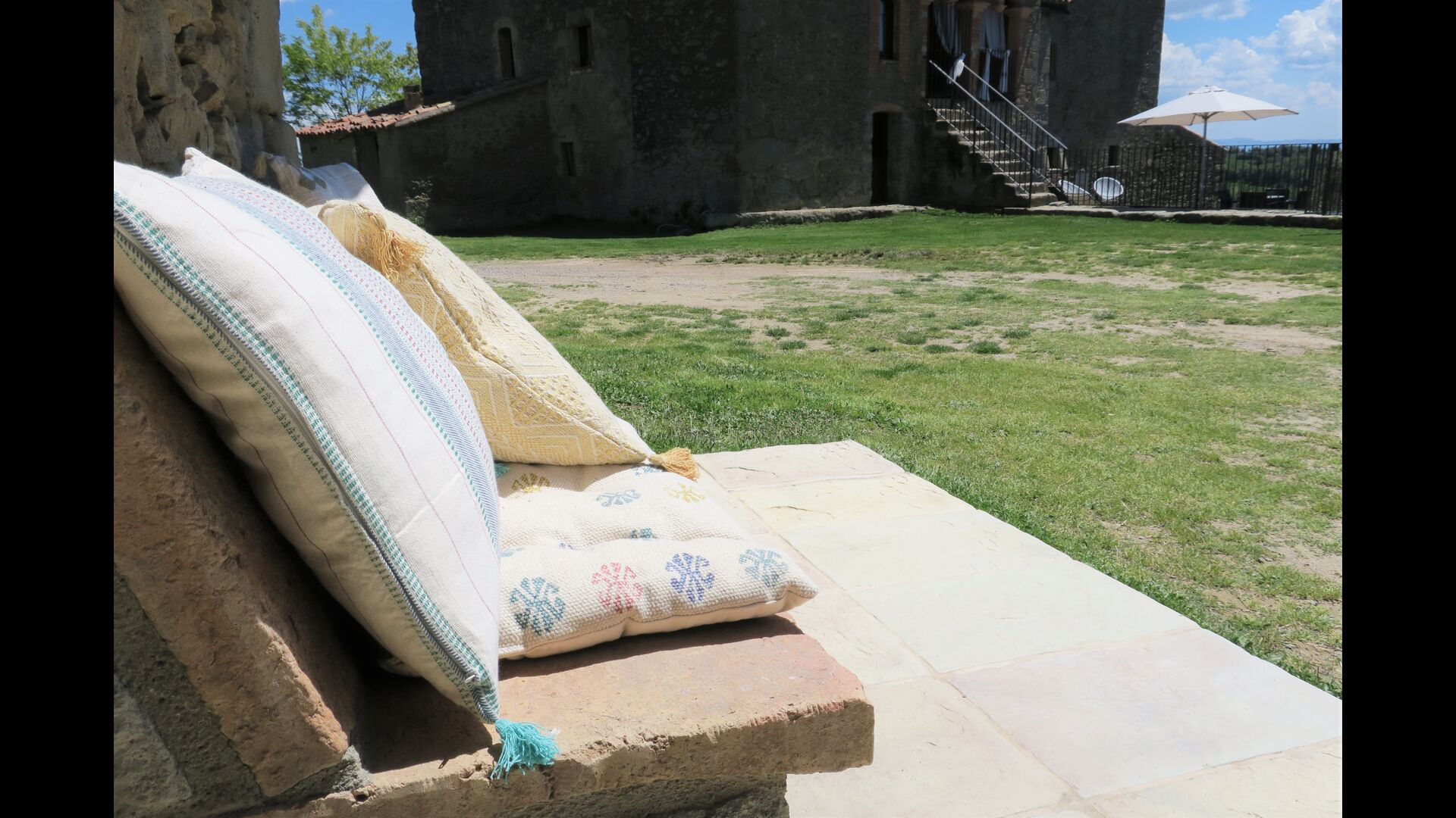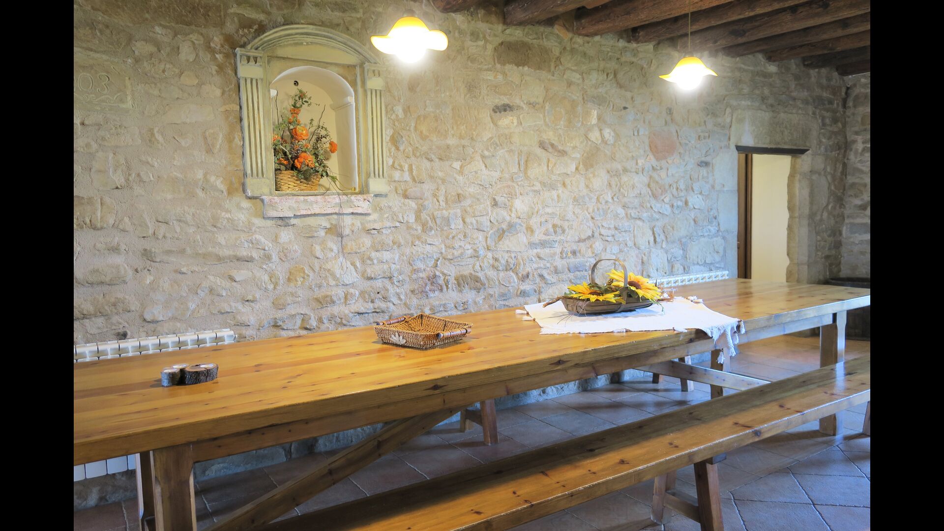 Husets indgang ligger nogle trin oppe, hvor der er endnu en mindre terrasse. Huset har en stor stue med langbord og et fuldt udstyret køkken. Der er i alt 4 dobbeltværelser med dobbeltseng og et værelse med 3 enkeltsenge. Hertil er der mulighed for to yderligere ekstra senge, så man kan bo op til 13 personer i huset. Der er 2 badeværelser til deling. Et niveau nede er der et sofaområde med fladskærms-TV og udsigt over landskabet.