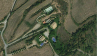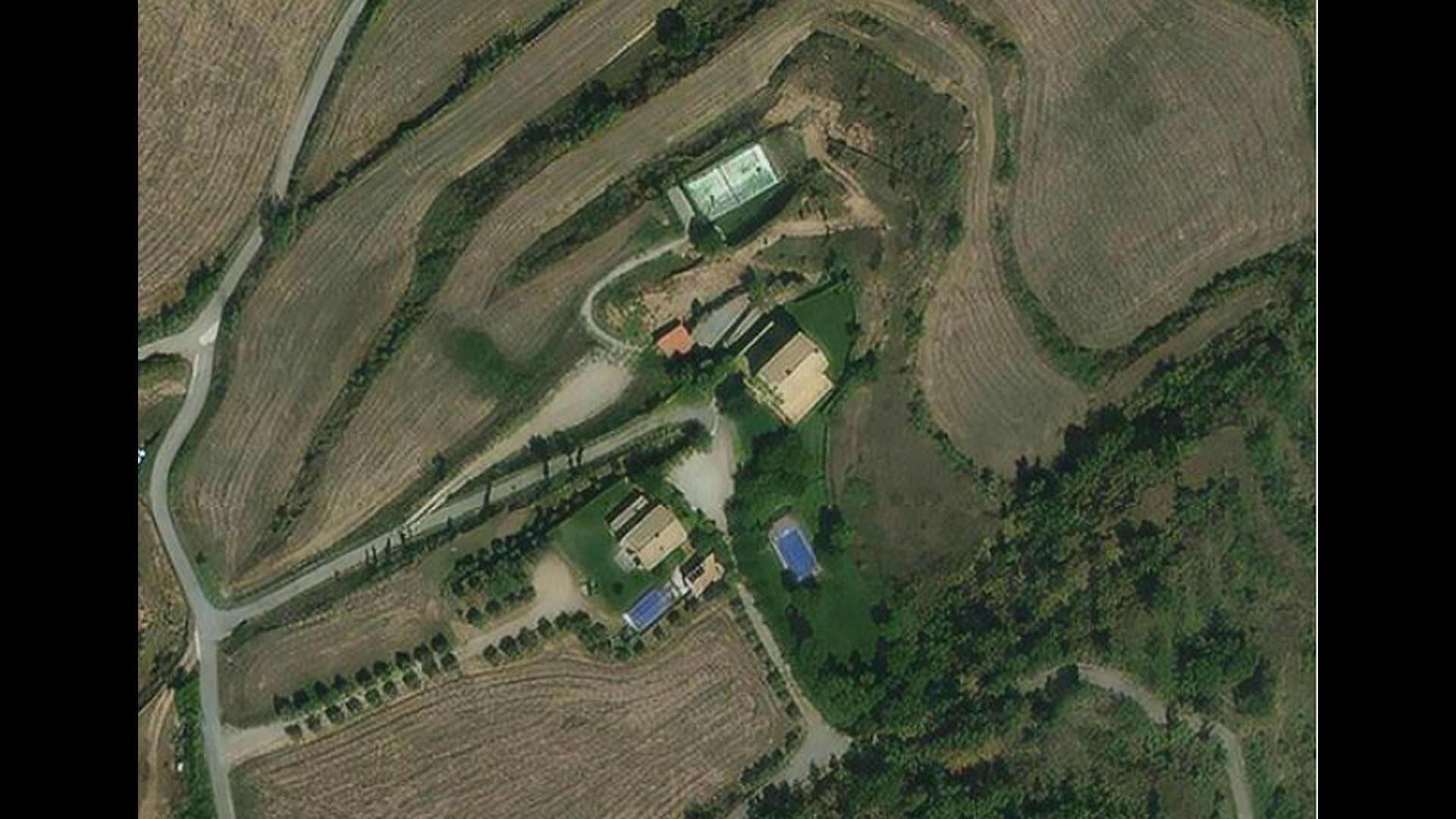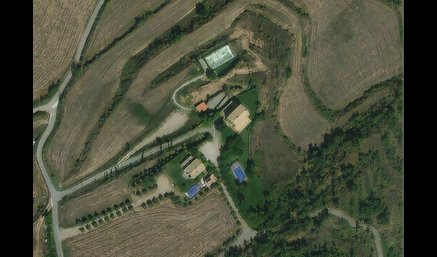 Satellitbillede af de to huse inkluderet i lejen samt Padel tennisbanen som ligger nedenfor husene