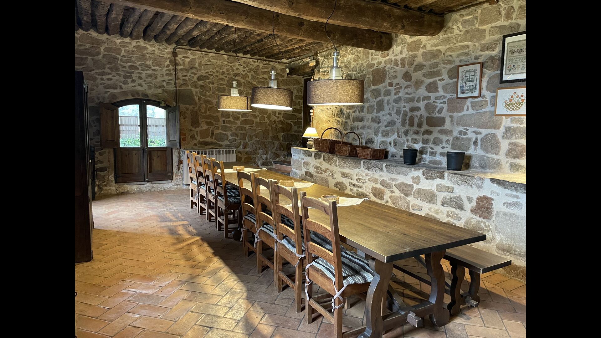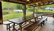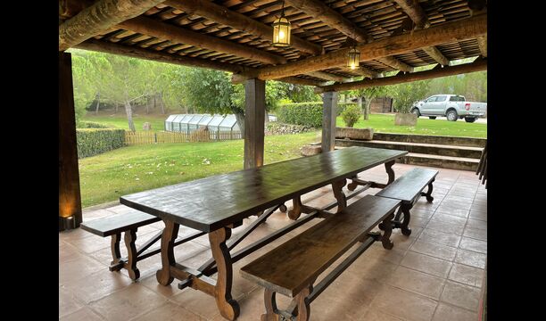 Når ejendommen udlejes samlet, bliver terrassen i det store hus gjort klar, så hele gruppen kan spise sammen og hygge sig sammen.