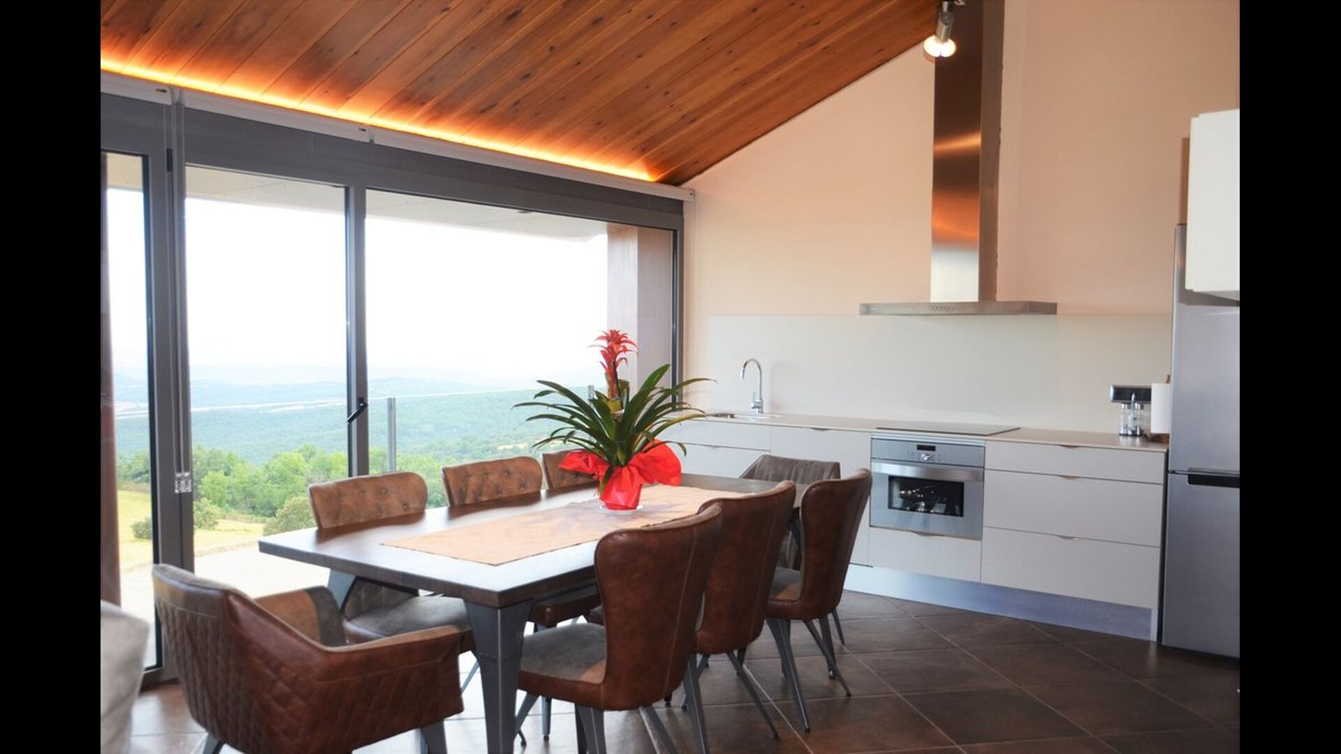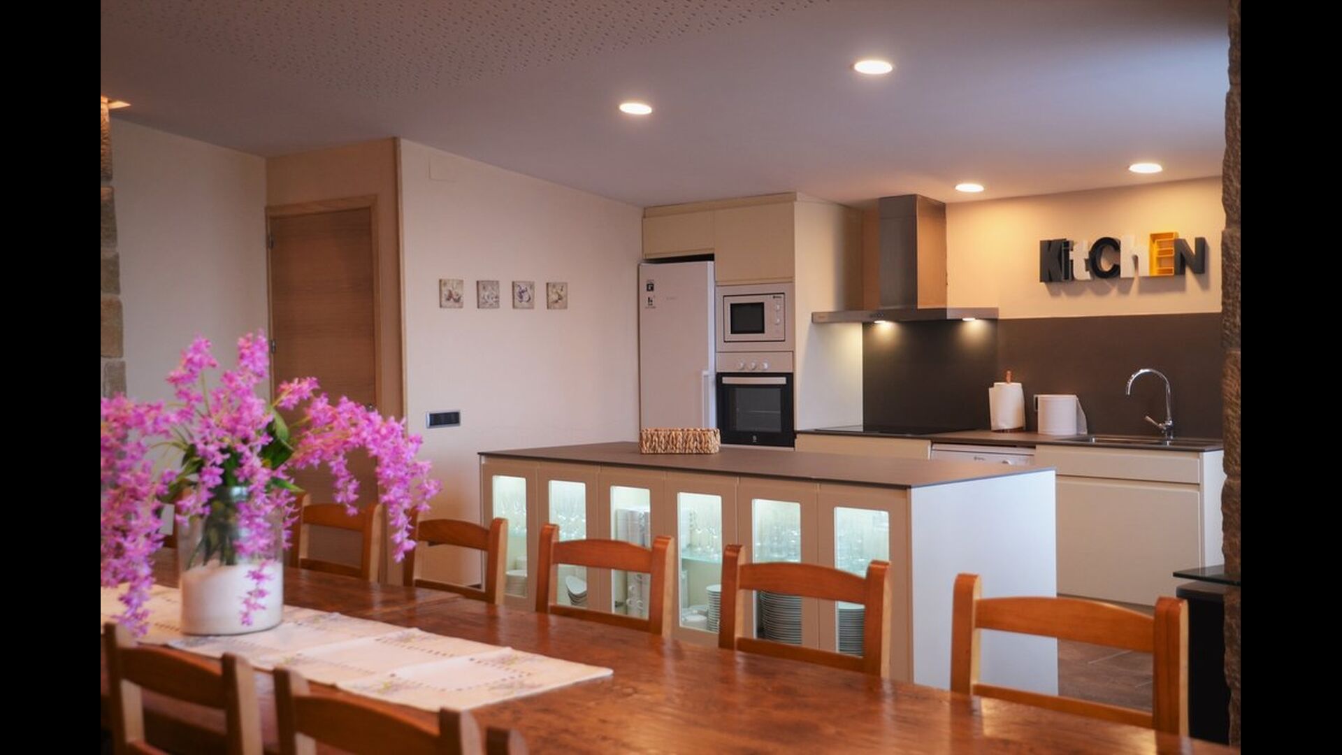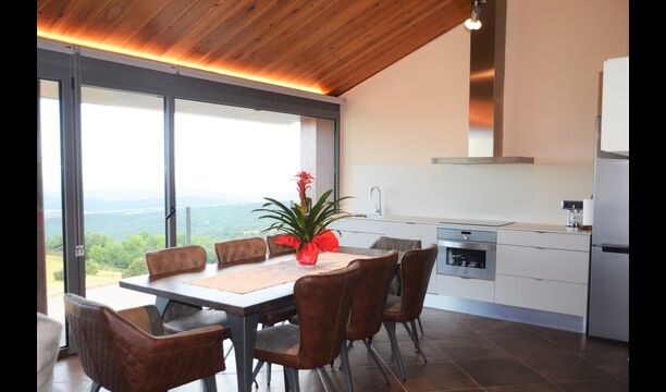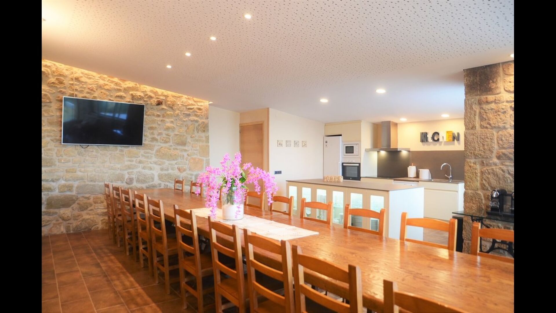 Når man kommer ind i huset stueetage, vil man finde et stort åbent køkken- og spiseområde. Køkken er fuldt udstyret og der er et stort middagsbord, hvor hele rejsegruppen kan sidde og nyde hinandens mad og selskab. Stueetagen har også et loungeområde med komfortable sofaer og stort fladskærmsfjernsyn, hvor man dermed også har gode mulighed for at slappe af indenfor i huset.
