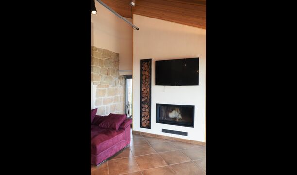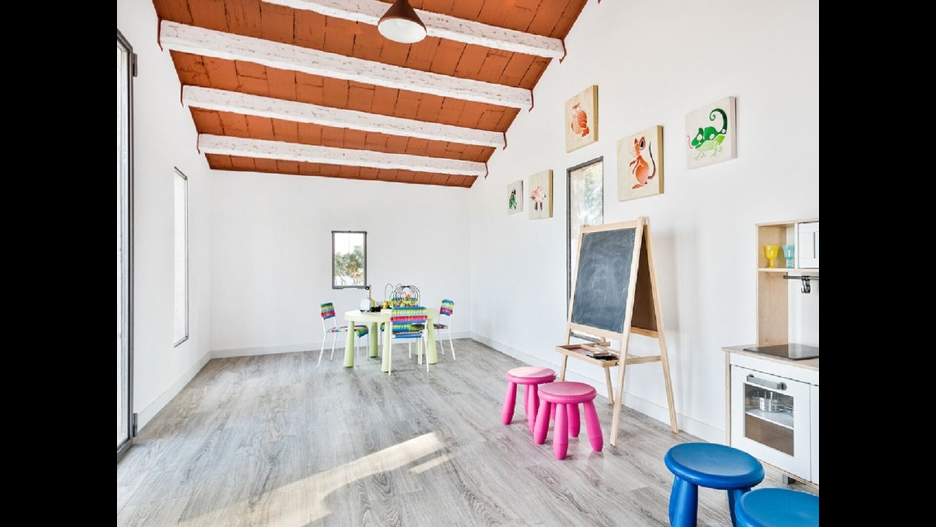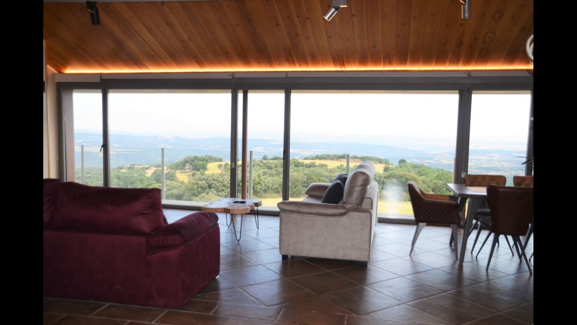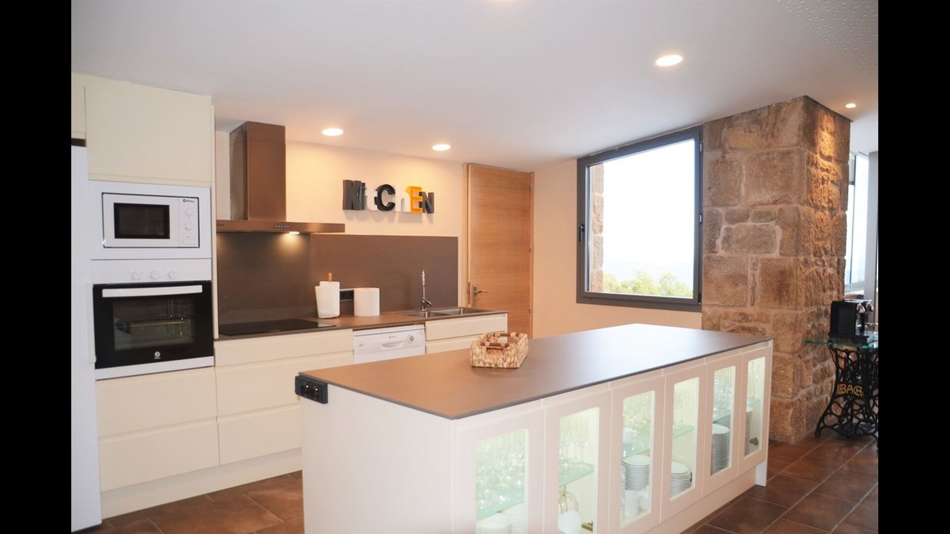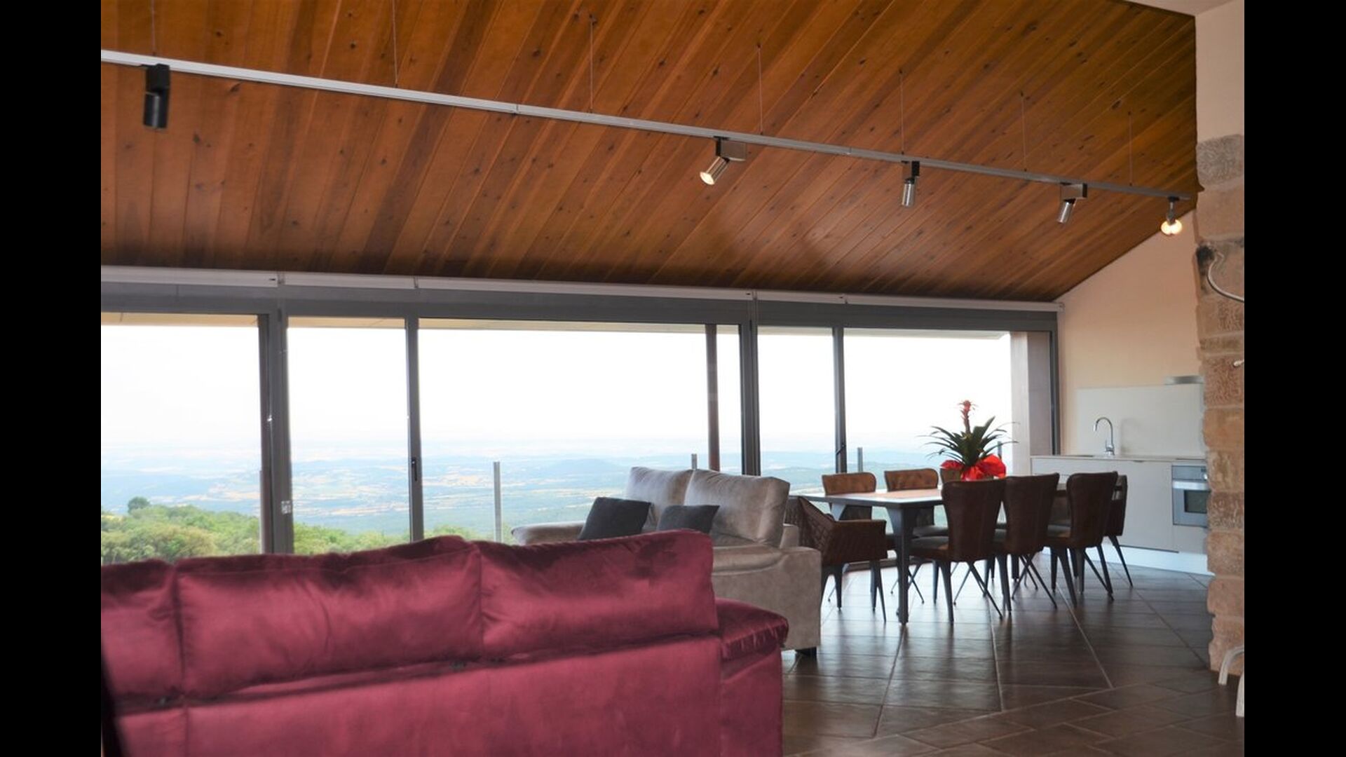 Når man kommer ind i huset stueetage, vil man finde et stort åbent køkken- og spiseområde. Køkken er fuldt udstyret og der er et stort middagsbord, hvor hele rejsegruppen kan sidde og nyde hinandens mad og selskab. Stueetagen har også et loungeområde med komfortable sofaer og stort fladskærmsfjernsyn, hvor man dermed også har gode mulighed for at slappe af indenfor i huset.