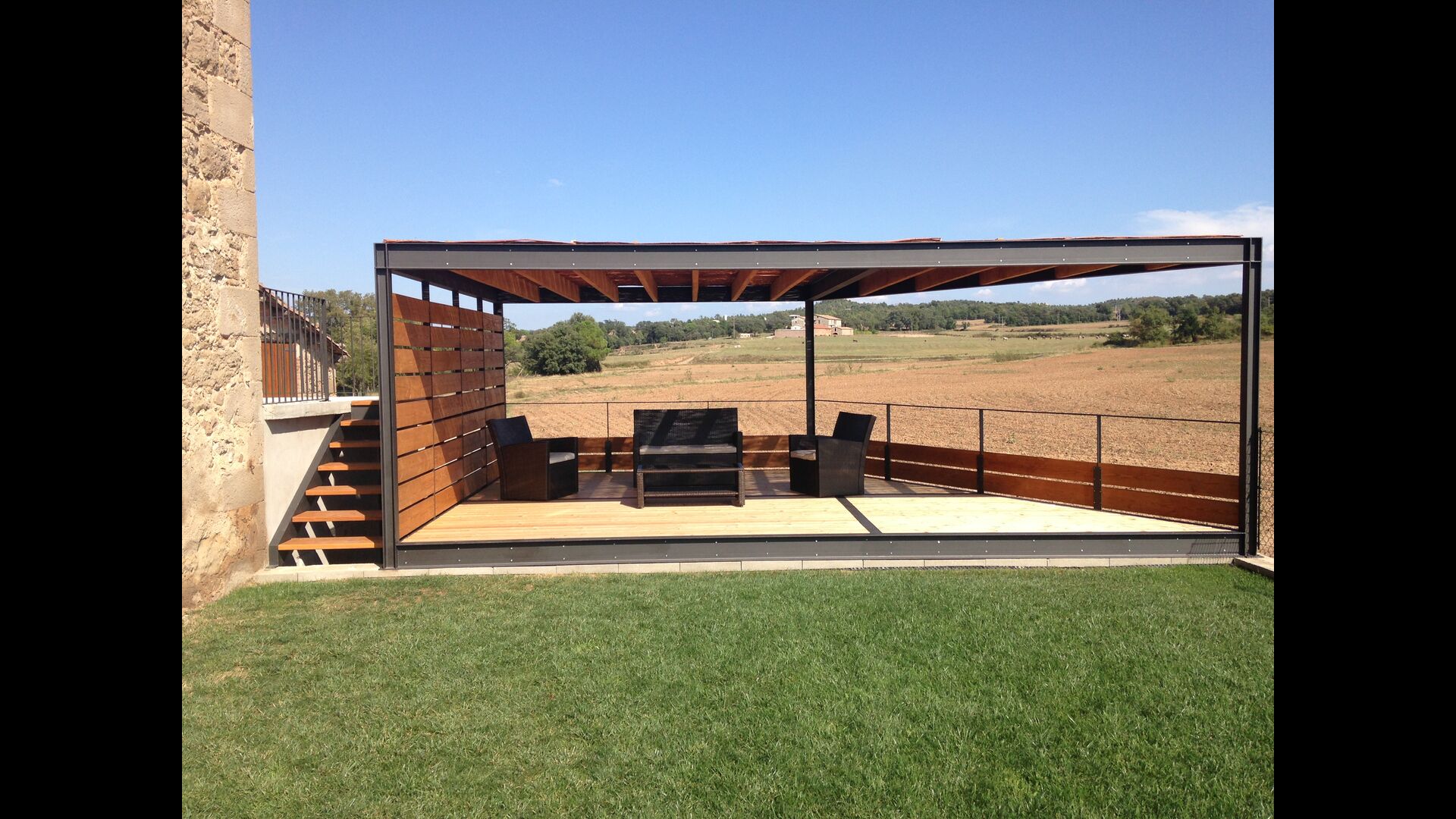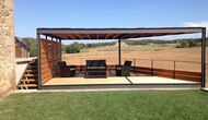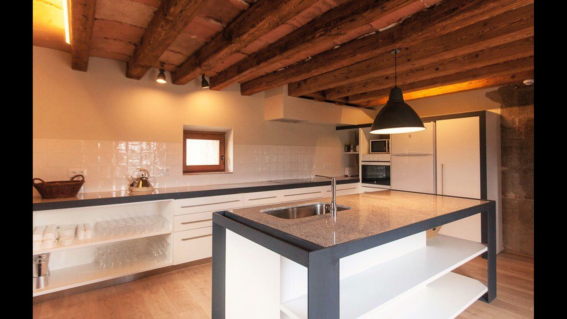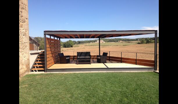 I designet af udeområdet har man gennemtænkt, hvordan sommerferien kan optimeres. Fra den overdækkede terrasse er der direkte udsyn til poolen så man i ro og mag kan sidde og nyde børnene boltre sig i poolen mens man nyder et glas Cava i skyggen eller slapper af i de sene aftentimer. Man har sågar bygget to køkkener. Et sommerkøkken med direkte udgang til poolen, så man nemt kan tilberede sommermiddagen, hente kølige drikkevarer og bringe servicen frem og tilbage uden at skulle op i køkkenet på første etage. Maden kan også tilberedes i BBQ området i haven. Denne detalje gør bare ferien så meget mere komfortabel og vi tvivler at, det ellers meget lækre første etage køkken, vil blive brugt under et sommerophold.