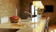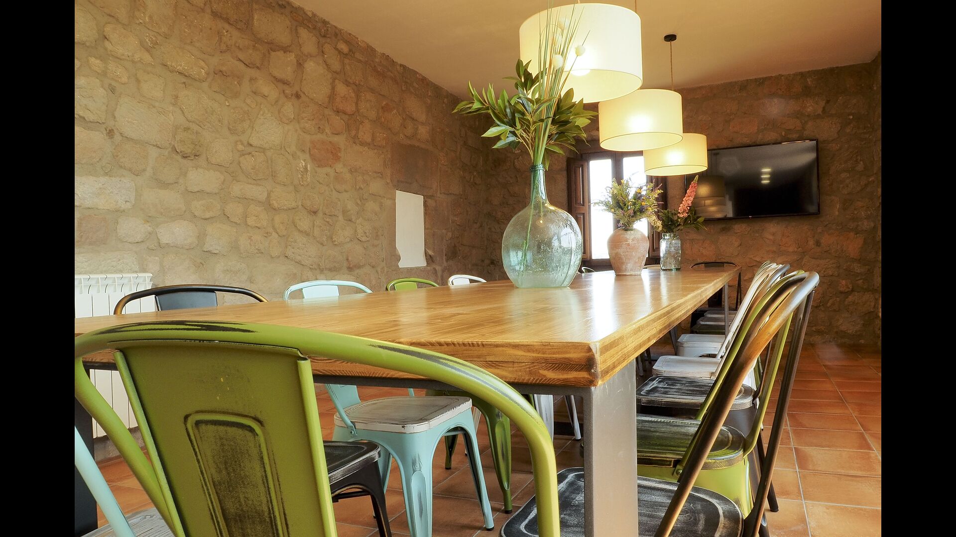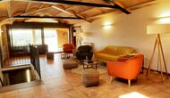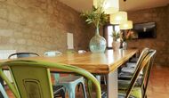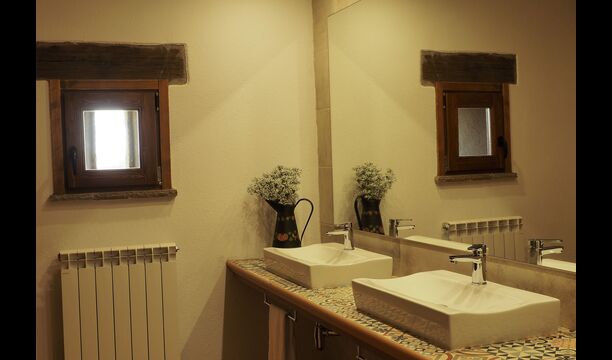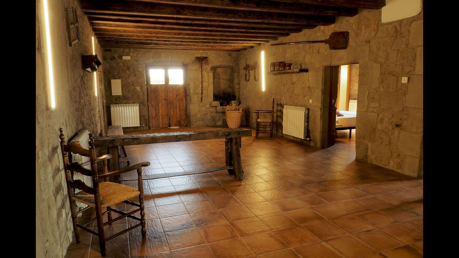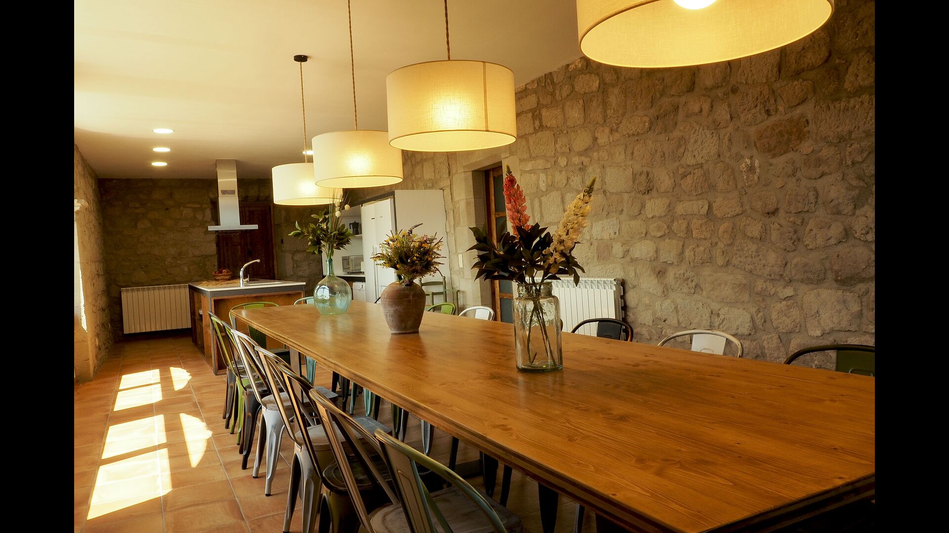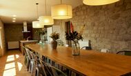 Det store og fuldt udstyrede køkken ligger i stueetagen. Dens åbne plads gør det til et godt sted at tilberede store måltider til hele gruppen. I forlængelse af køkkenet er spisepladsen med et langt træbord. Området har plads til, at hele gruppen kan spise sammen. Ved siden af køkkenet og spisepladsen er den rummelige stue med komfortable sofaer og en hyggelig pejs på stueetagen. Otte af dobbeltværelserne er også placeret på stueetagen. Hvert soveværelse er udstyret med tv og eget badeværelse.
