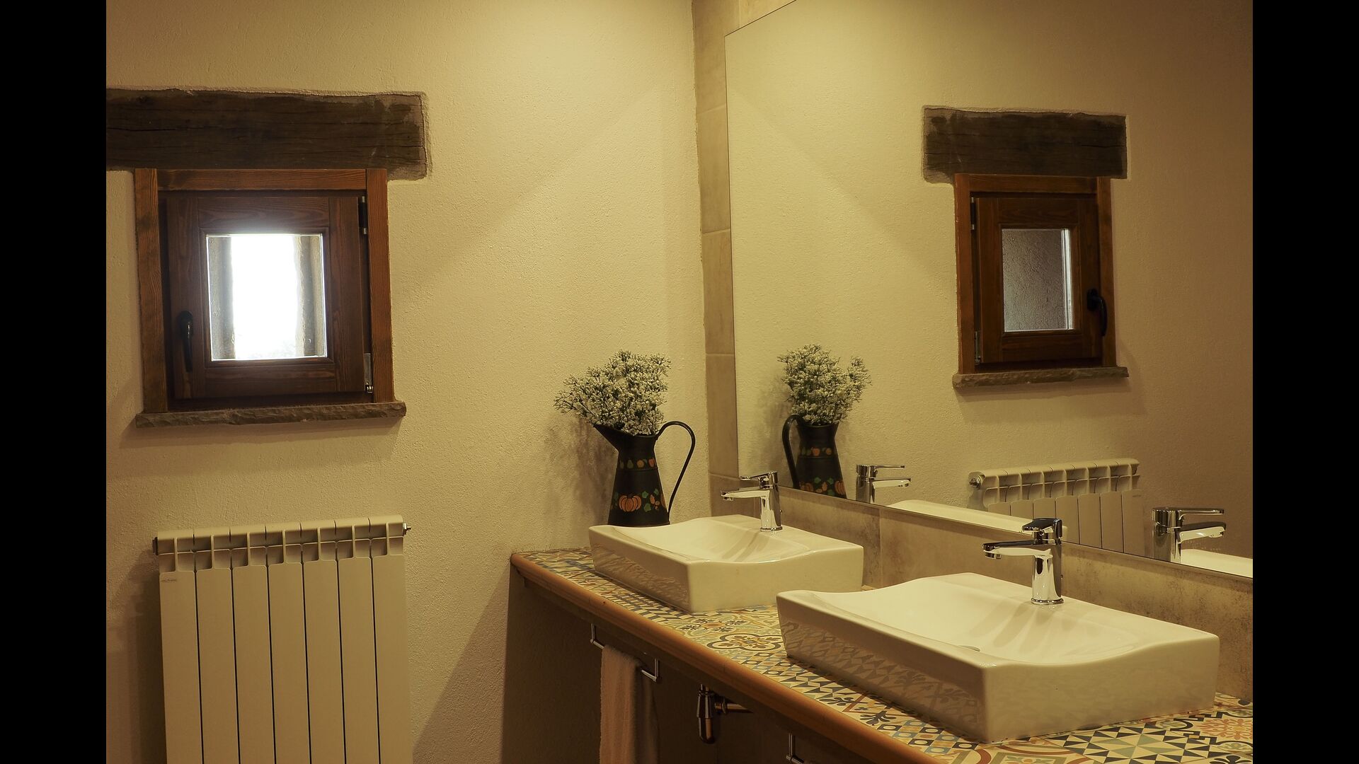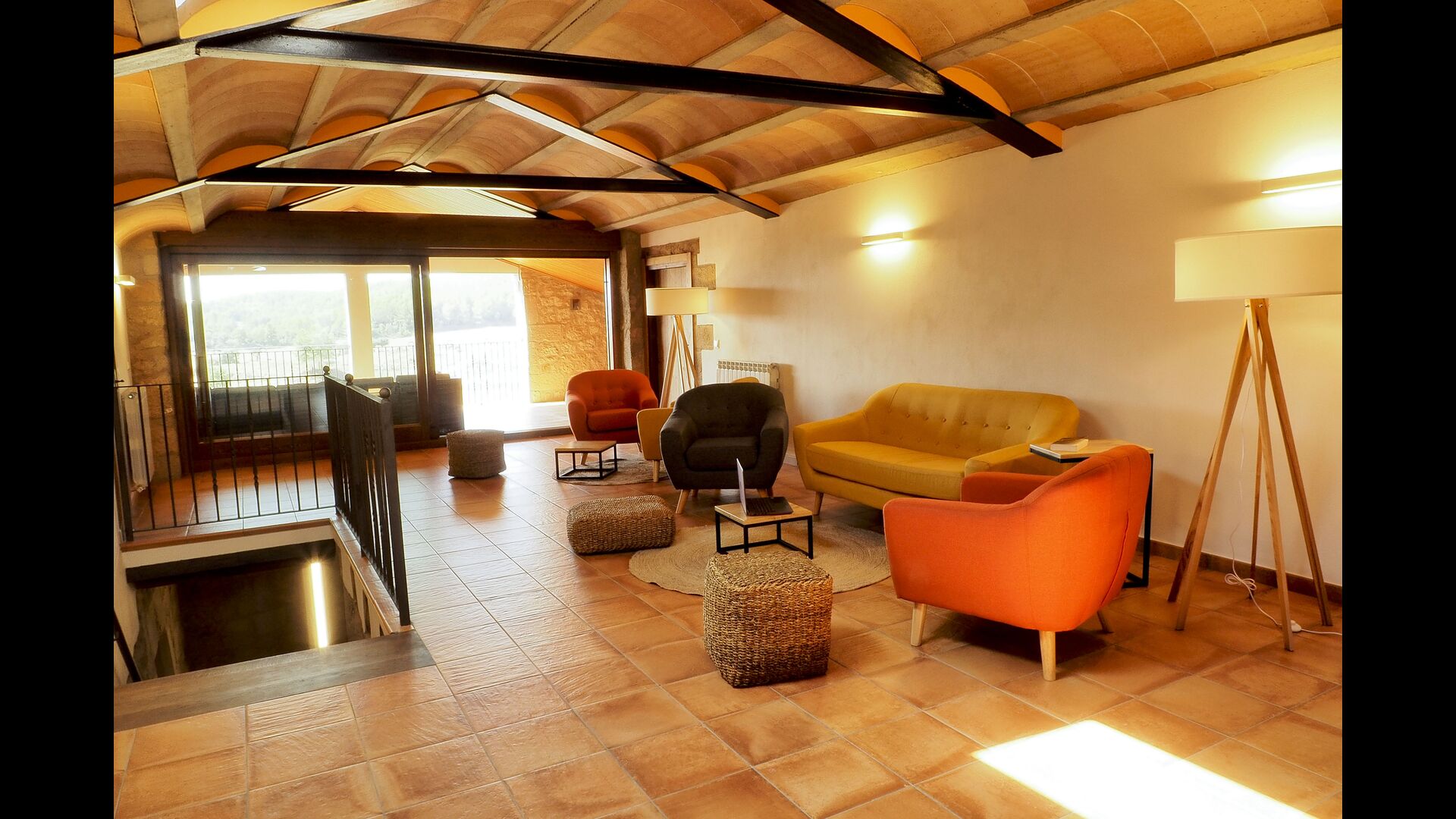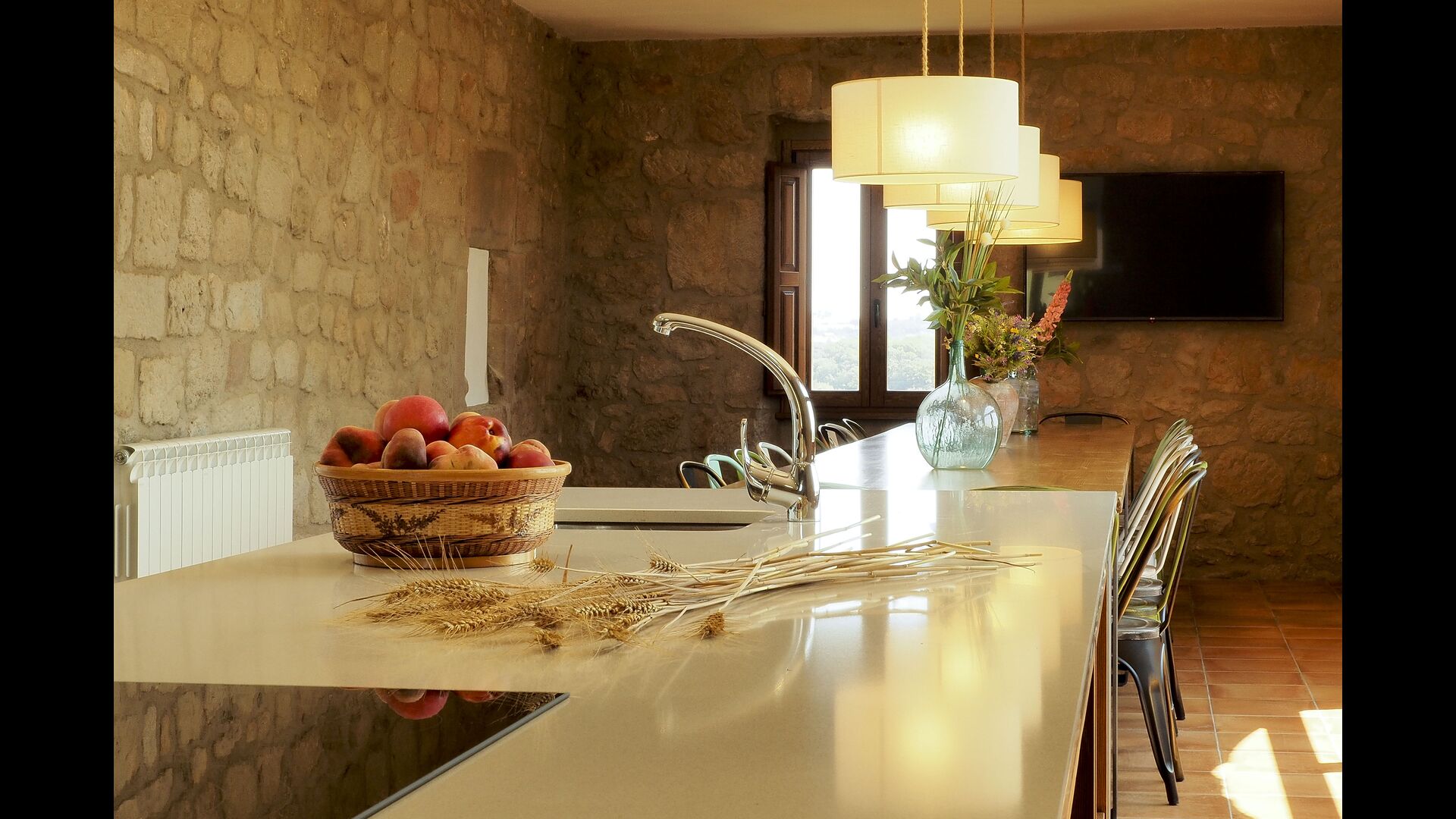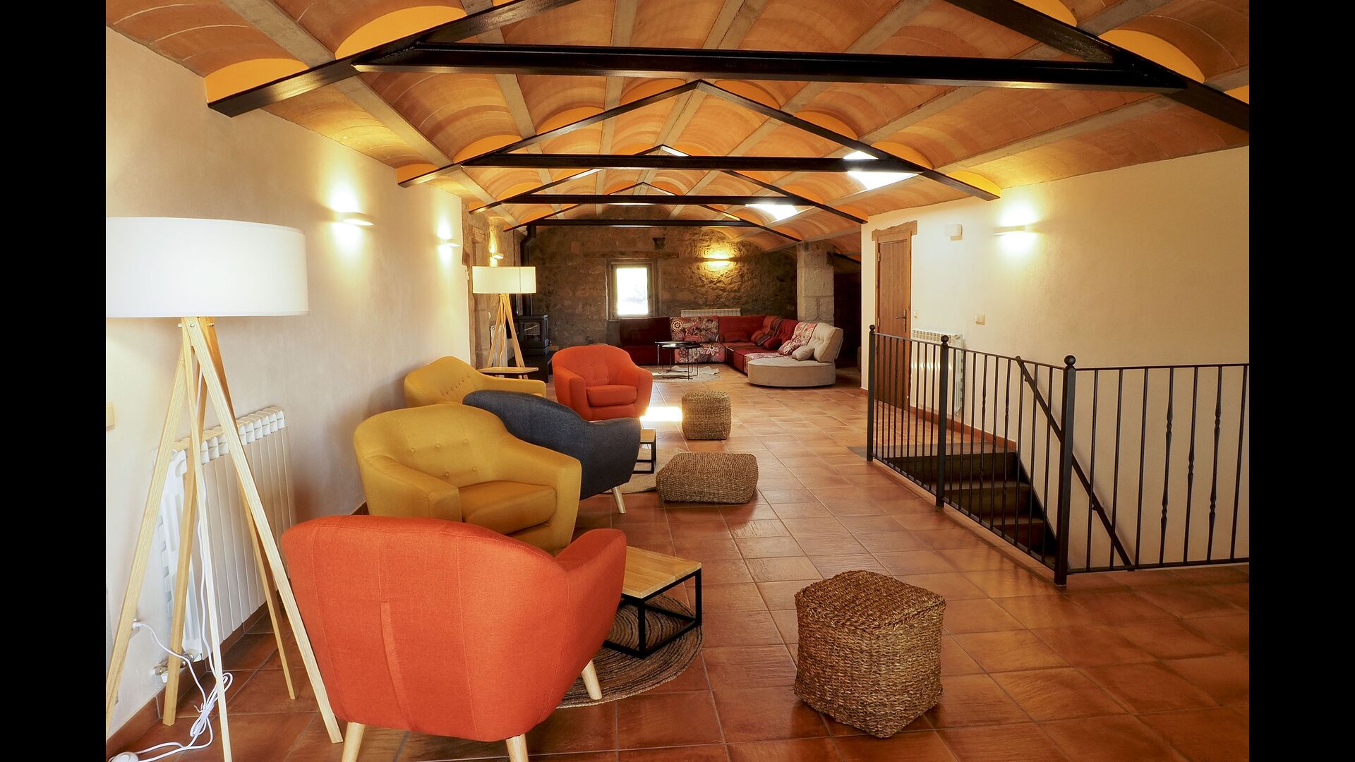 Det store og fuldt udstyrede køkken ligger i stueetagen. Dens åbne plads gør det til et godt sted at tilberede store måltider til hele gruppen. I forlængelse af køkkenet er spisepladsen med et langt træbord. Området har plads til, at hele gruppen kan spise sammen. Ved siden af køkkenet og spisepladsen er den rummelige stue med komfortable sofaer og en hyggelig pejs på stueetagen. Otte af dobbeltværelserne er også placeret på stueetagen. Hvert soveværelse er udstyret med tv og eget badeværelse.
