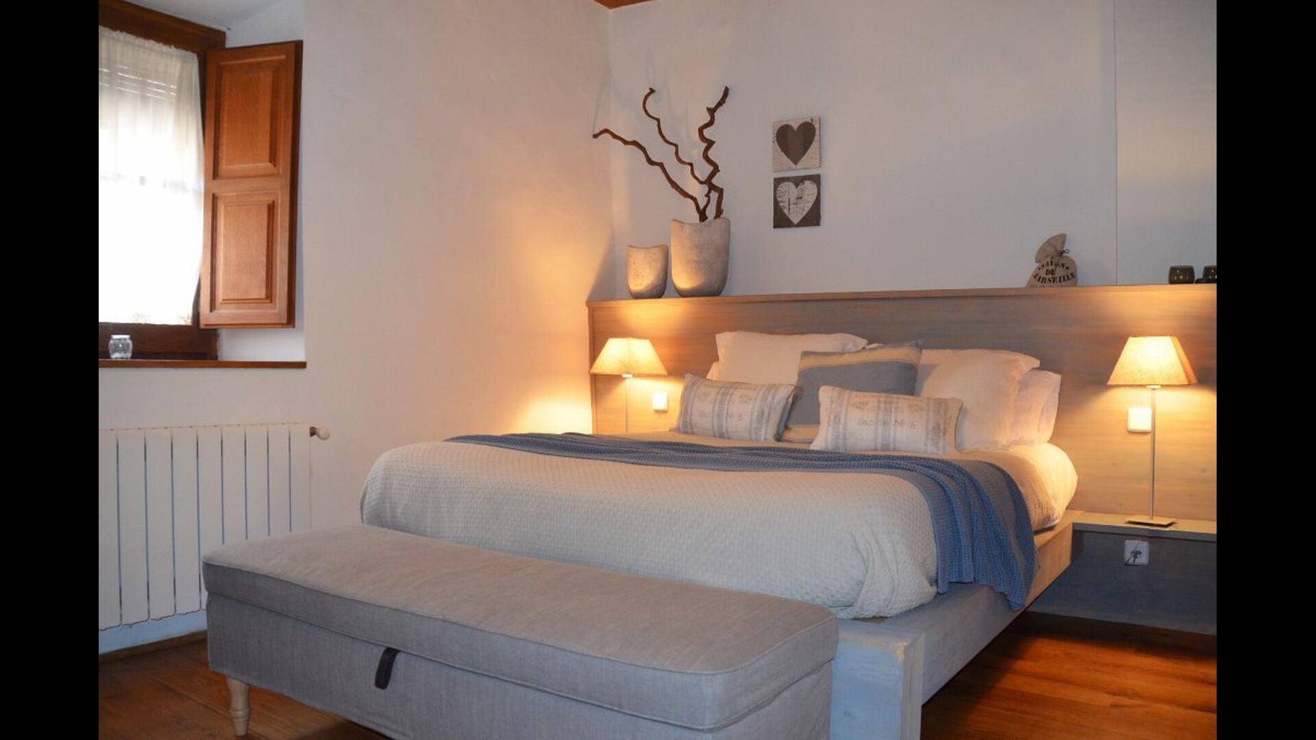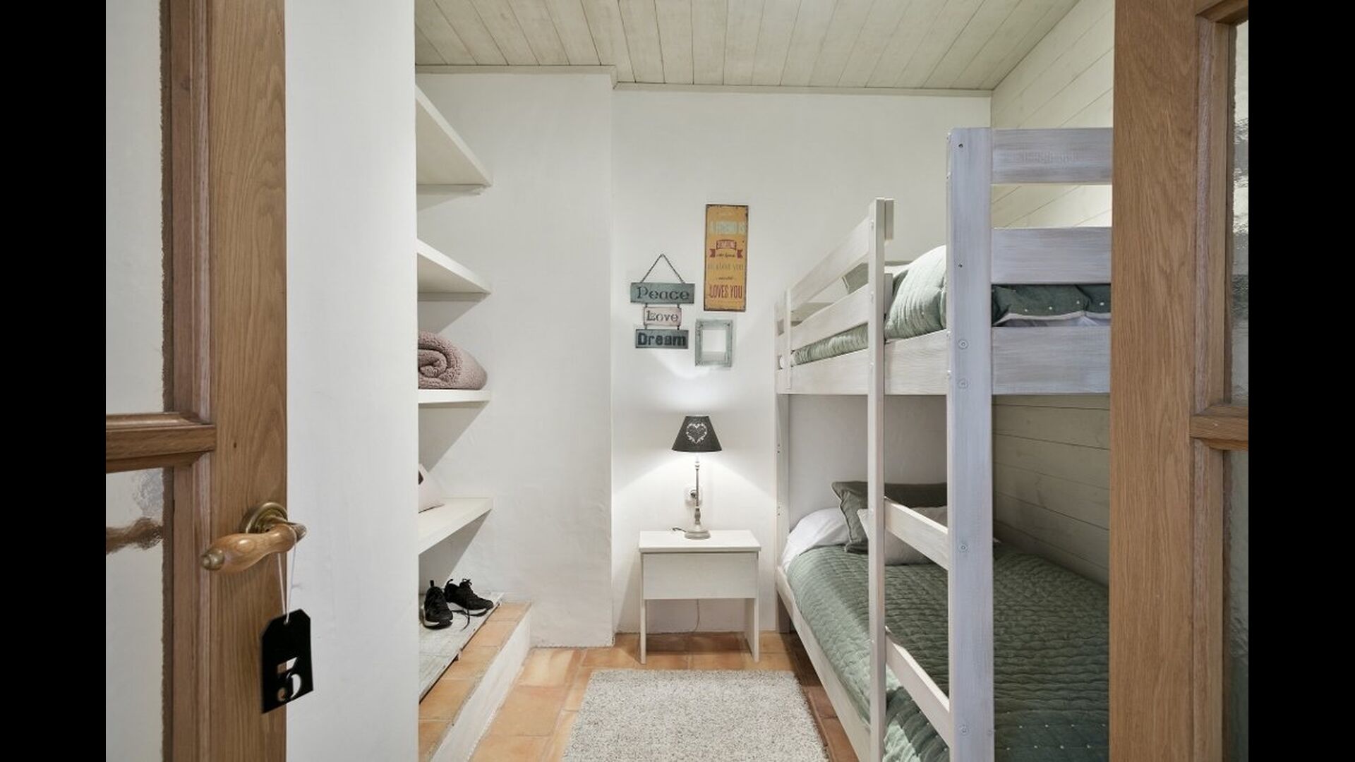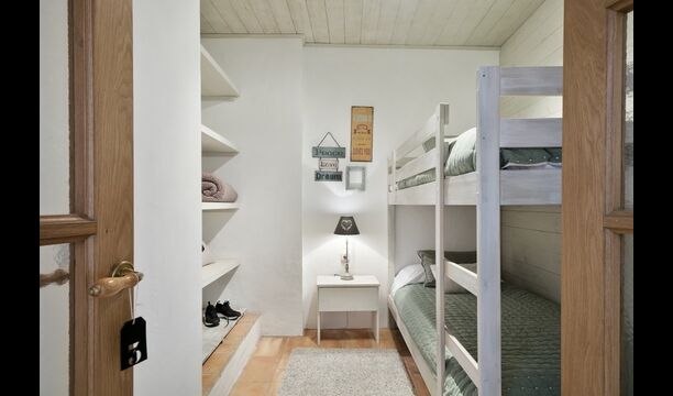 Når man træder ind i huset, vil man finde et soveværelse på hver side; begge indrettet til perfektion med en-suite badeværelse (ét af dem med badekar) samt fladskærmsfjernsyn og moderne flotte dekorationer. Længere nede af gangen er de to sidste soveværelser på første sal, det første med en dobbeltseng og en enkeltseng - også med en-suite badeværelse. Det andet har køjeseng. Ligeledes er disse to organiseret i en meget moderne og komfortabel stil. Fire ud af de i alt fem soveværelser befinder sig på stueetagen – det sidste, på anden sal, har to enkeltsenge, men der er selvfølgelig mulighed for at slå dem sammen. Ved trappen til anden sal, er der desuden en hyggelig lille opholdsstue, der er åbent helt op til tredje sal.