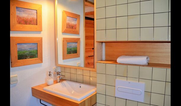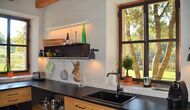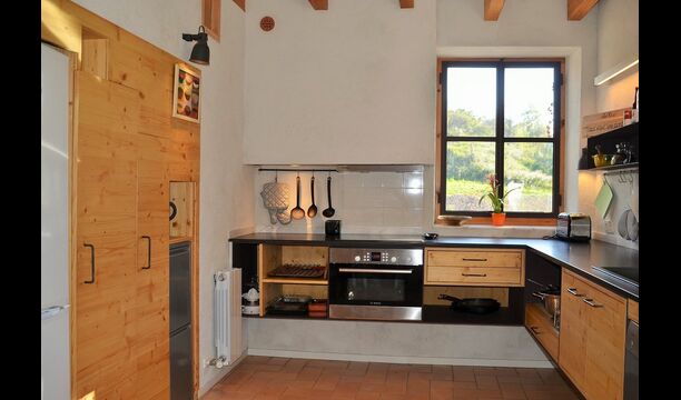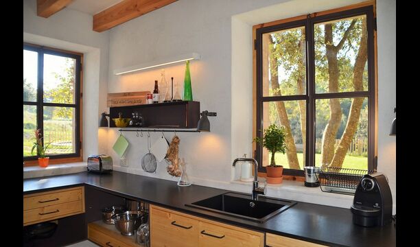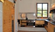 Ferieboligen har en flot, åbent køkken i meget moderne stil. Udover at det er lækkert indrettet, er det veludstyret med masser af køkkenfaciliteter – opvaskemaskine, kaffemaskiner, juicepresser, mikroovn, brødrister og meget andet. I stueetagen er der ligeledes et toilet, hvor der også er en vaskemaskine tilgængelig.