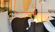 Stueetagen har et fællesområde med flot bjælkeloft og masser af lys. Der er et hyggeligt sofahjørne, hvor der er masser af plads til afslapning. I samme rum er der spisebord samt direkte udgang til en overdækket terrasse med siddemøbler.