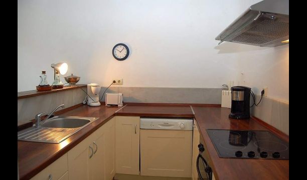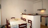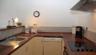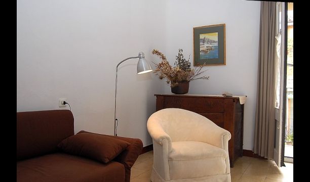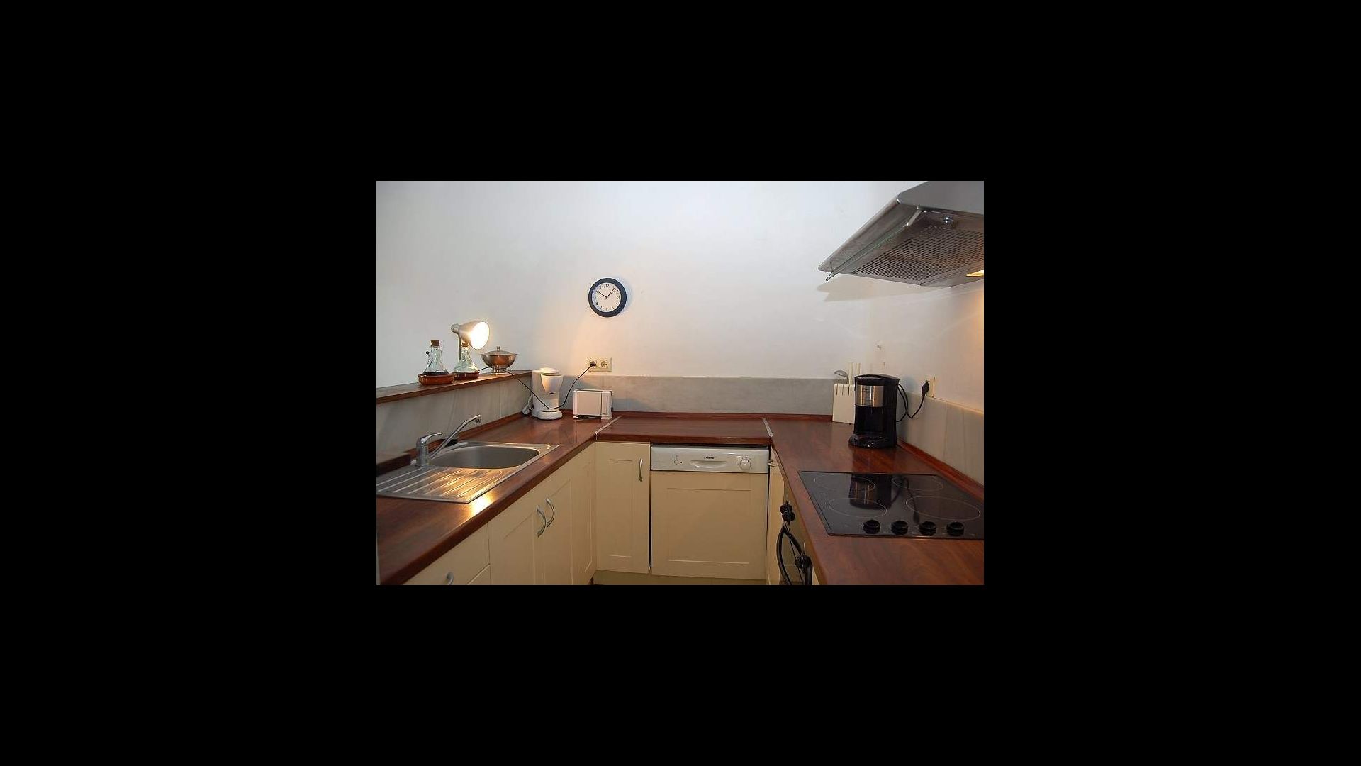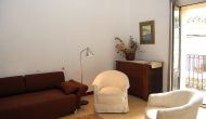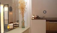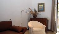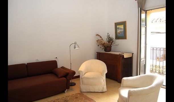 Den anden del af etagen er indrettet med en stue med sofaer samt en spisestue med stort spisebord og åbent køkken med behageligheder som opvaskemaskine, vaskemaskine, mikroovn, kaffemaskine og brødrister. Både stue og spisestue har balkon ud mod gaden. Der er desuden et moderne badeværelse med både brusekabine og badekar.