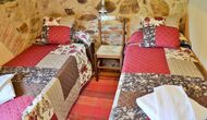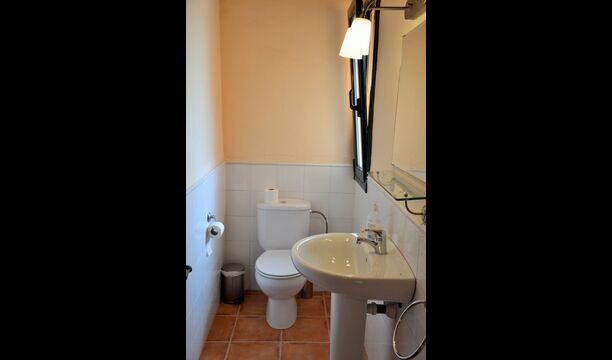 På første sal ligger de to komfortable soveværelser. De deles om et badeværelse med toilet og bruser, og der er et badeværelse bare med toilet.