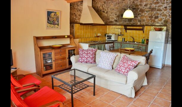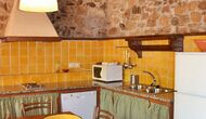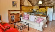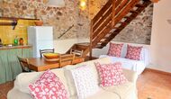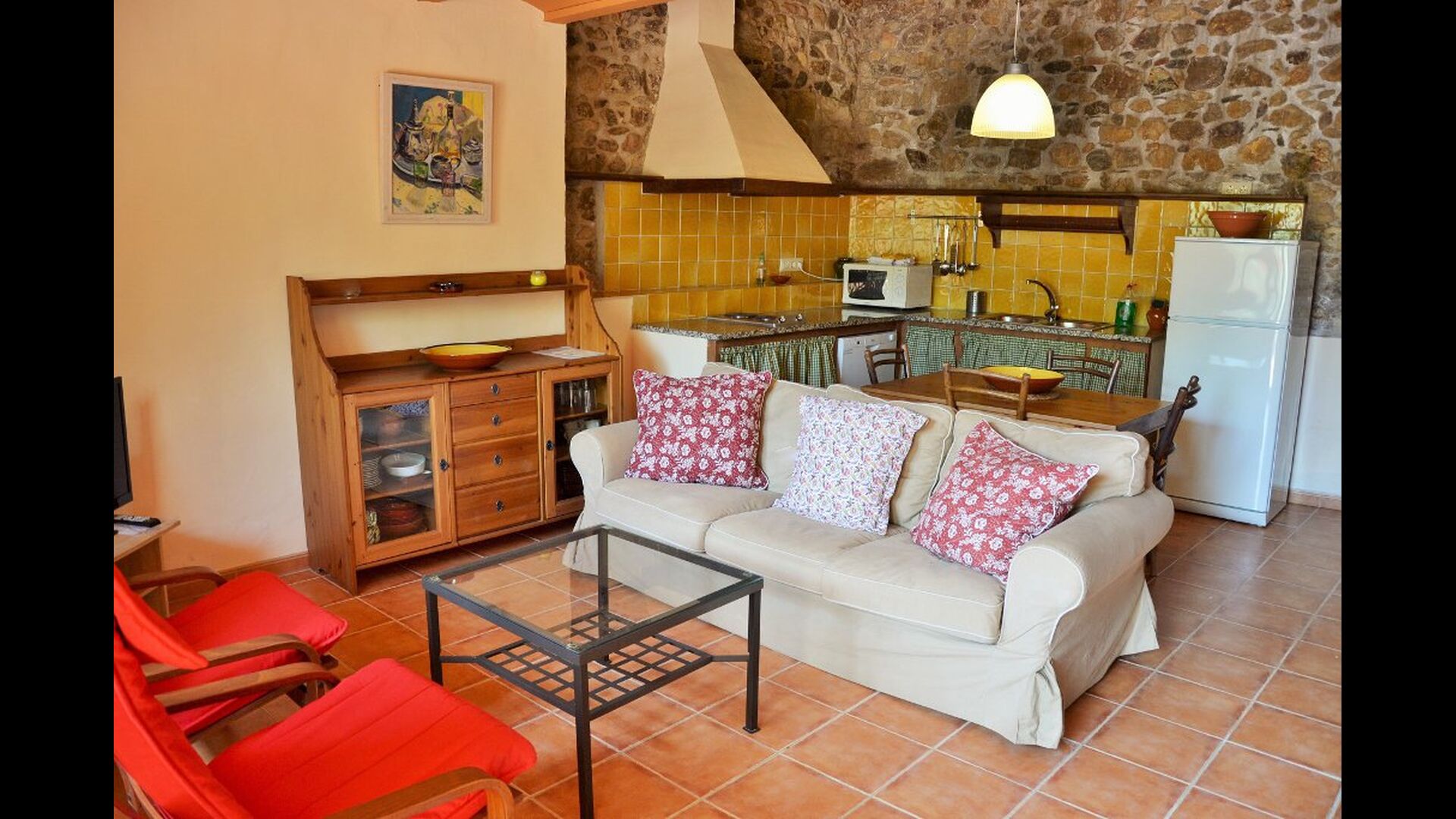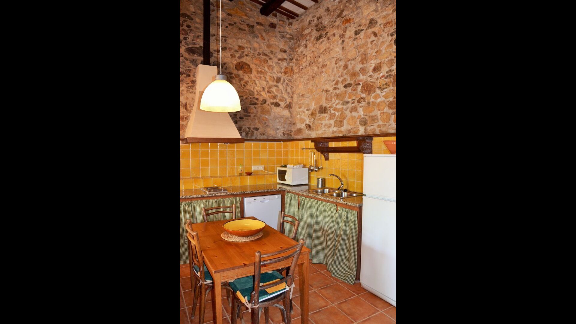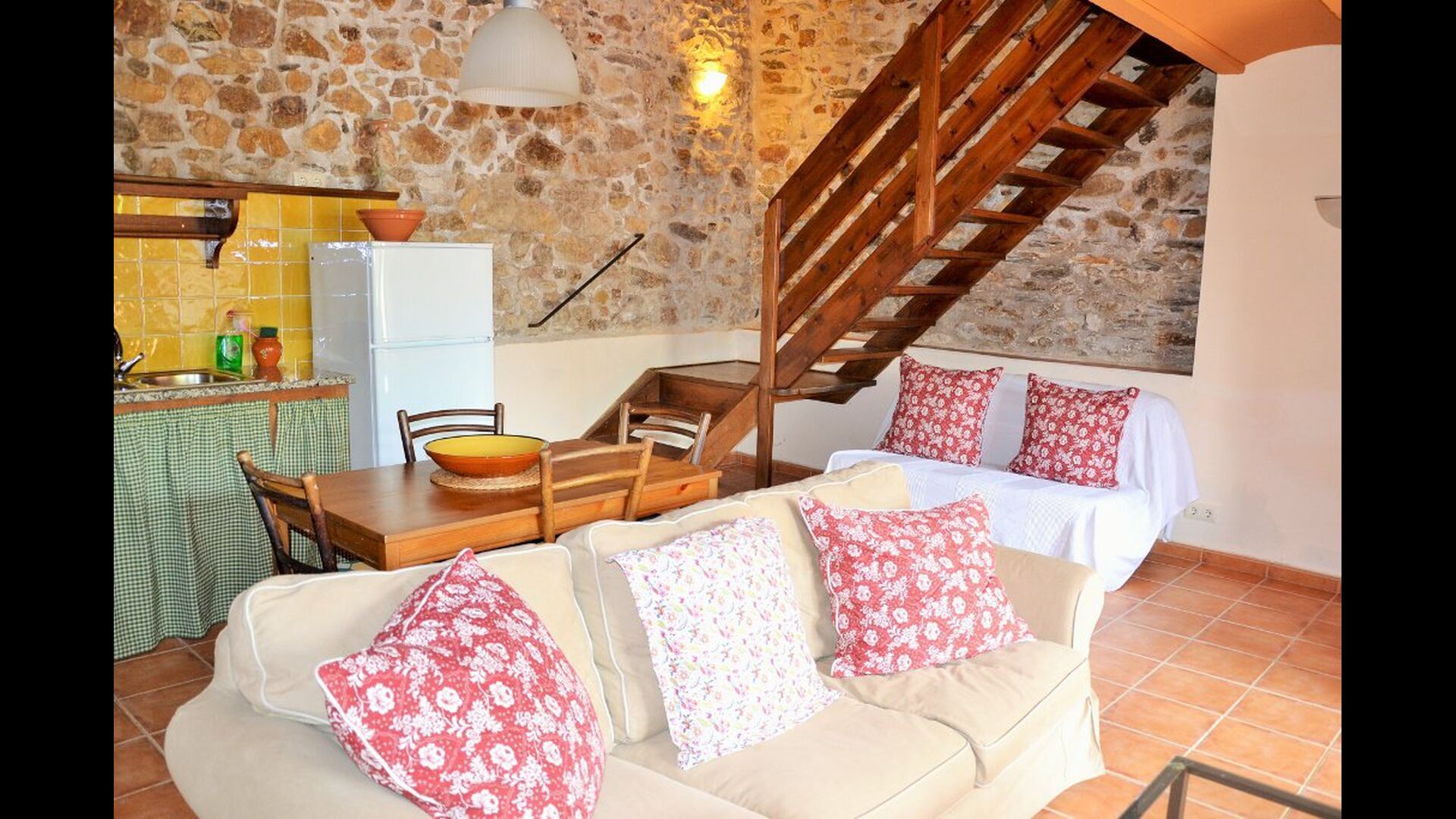 Stueetagen består af et fællesrum med sofaområde med TV, et spisebord og et veludstyret køkken. Meget af væggene er lavet af sten og loftet af bjælker – dette giver en god fornemmelse for den typisk catalanske stil.